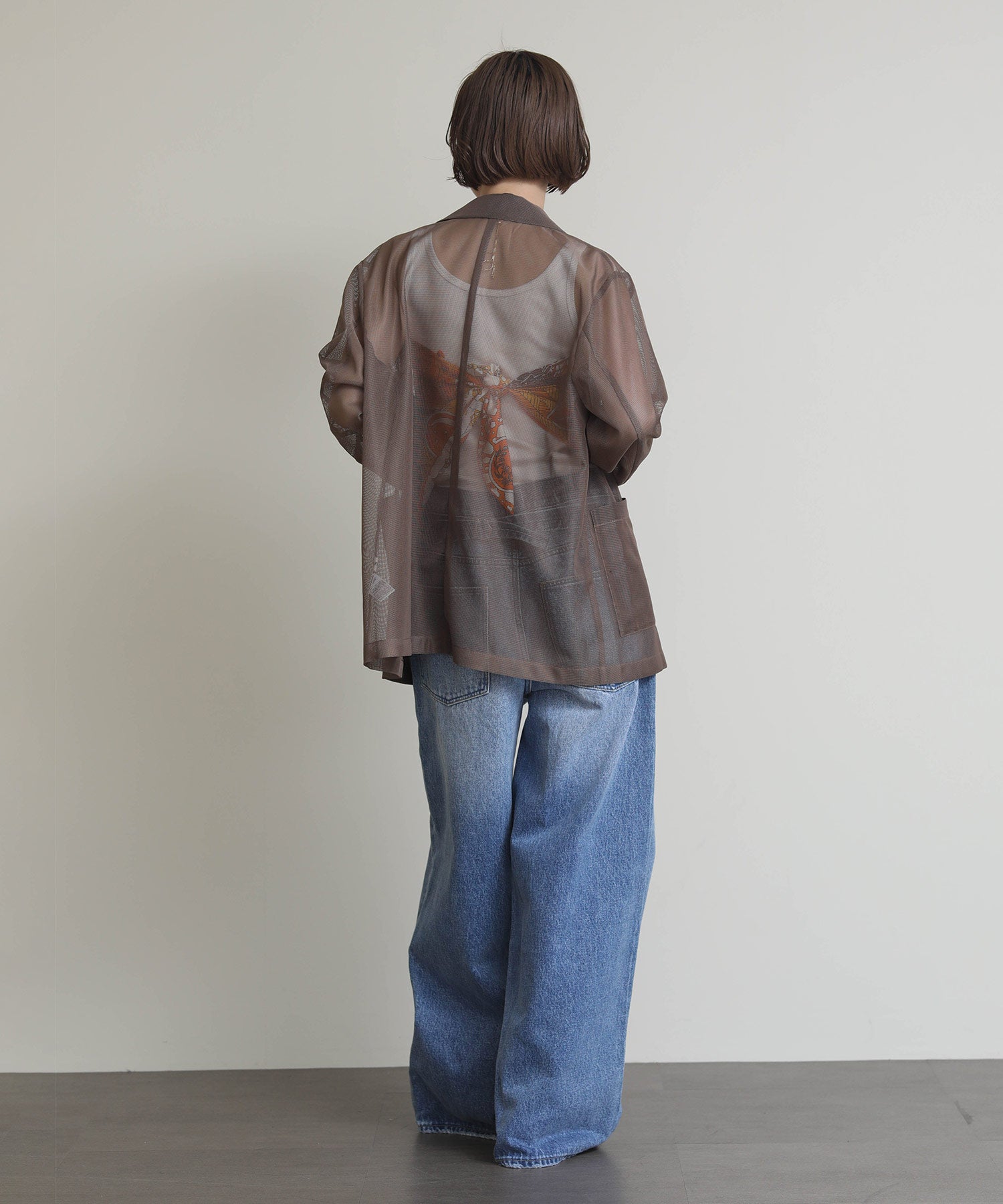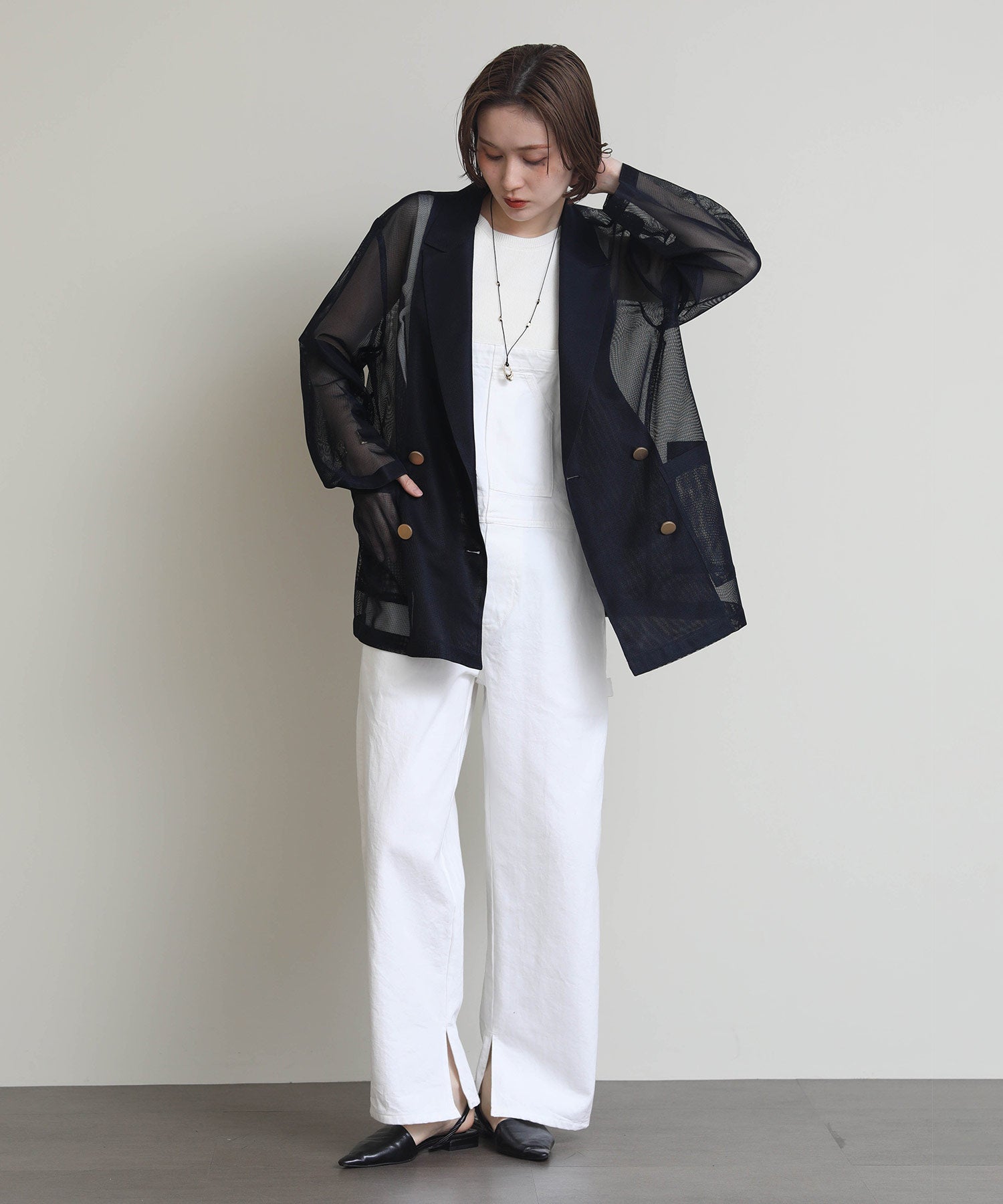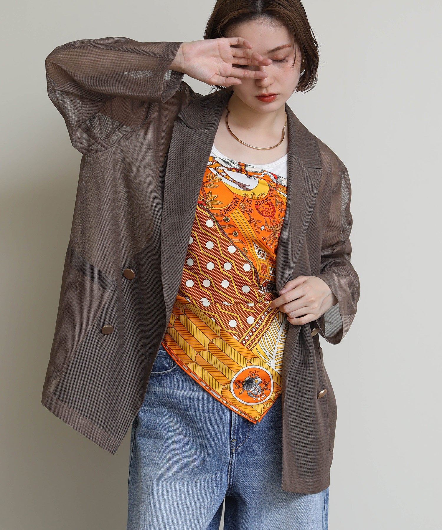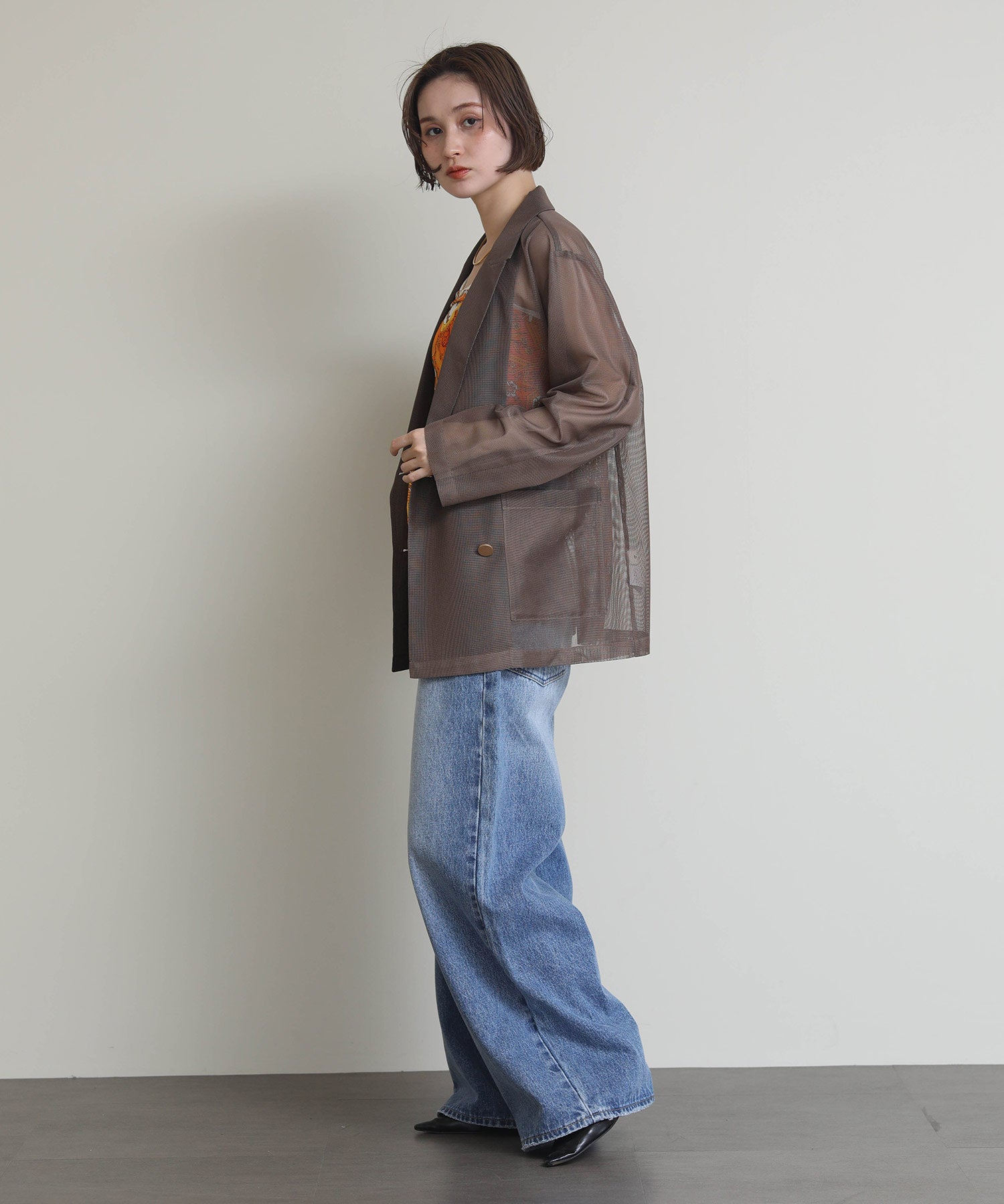 シアーメッシュ素材を使用したダブルテーラードジャケット。
