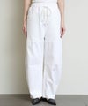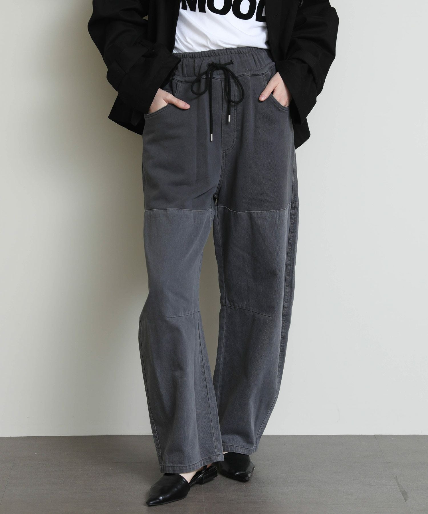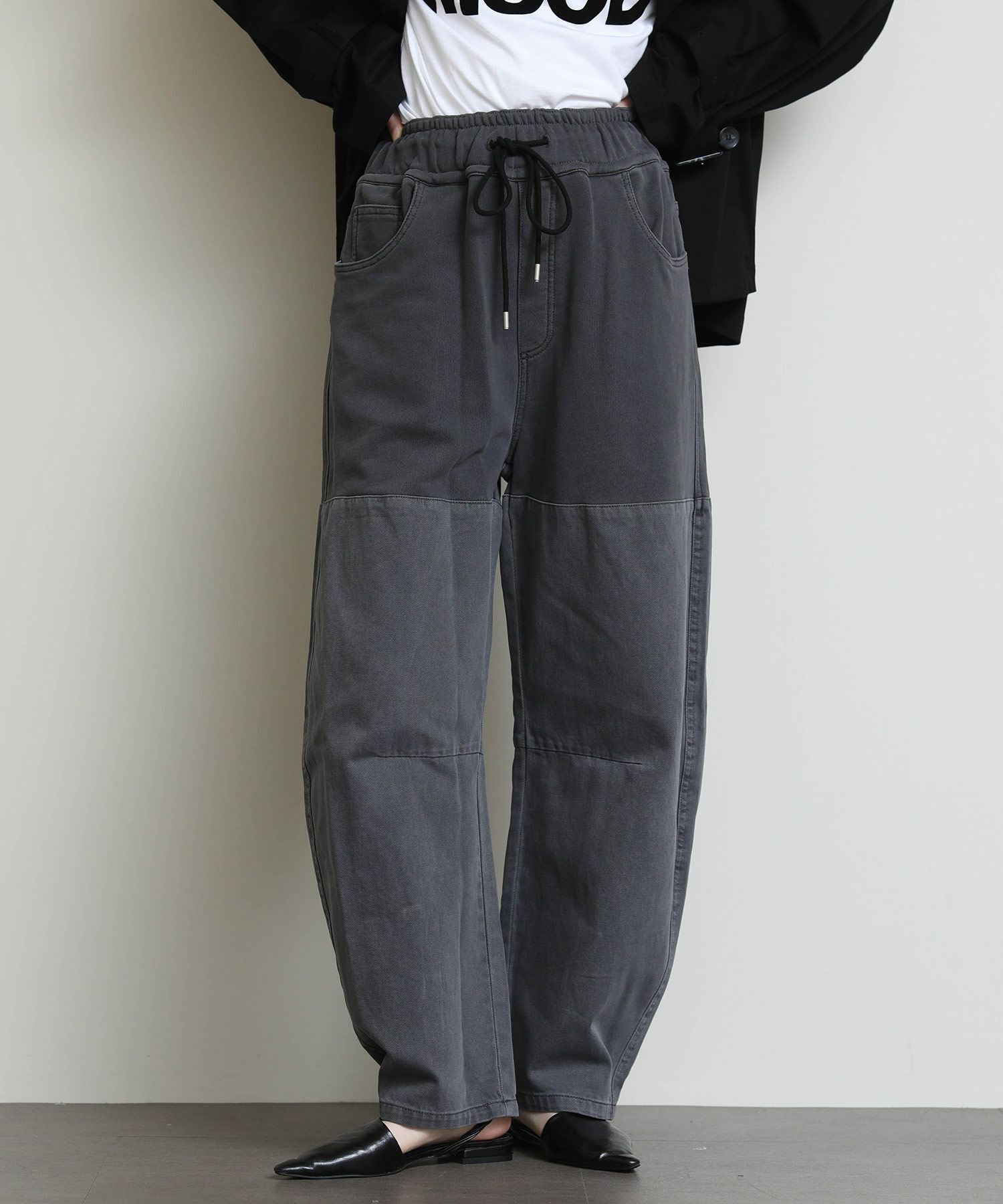 カーブ掛かった丸みのあるシルエットで脚長効果も◎ウエスト周りはゴム仕様でストレスなく着ることができ、紐で調節可能なため、ラフに着こなしていただけます。