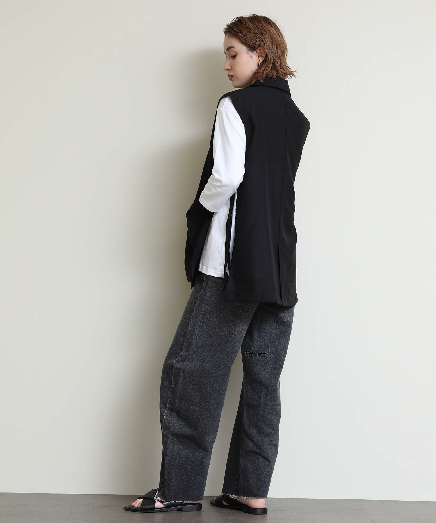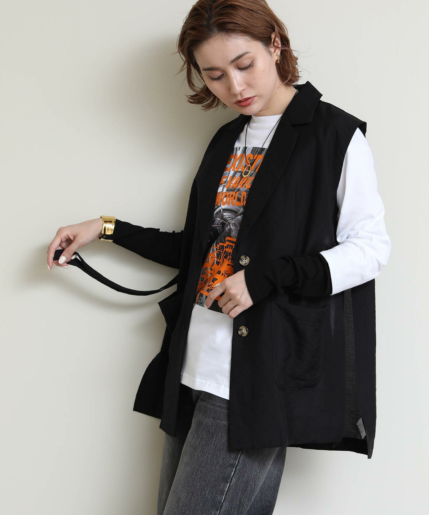 両サイドのバックルがポイントのジレ。
