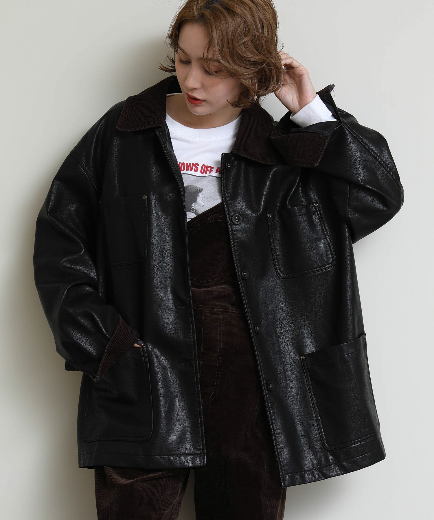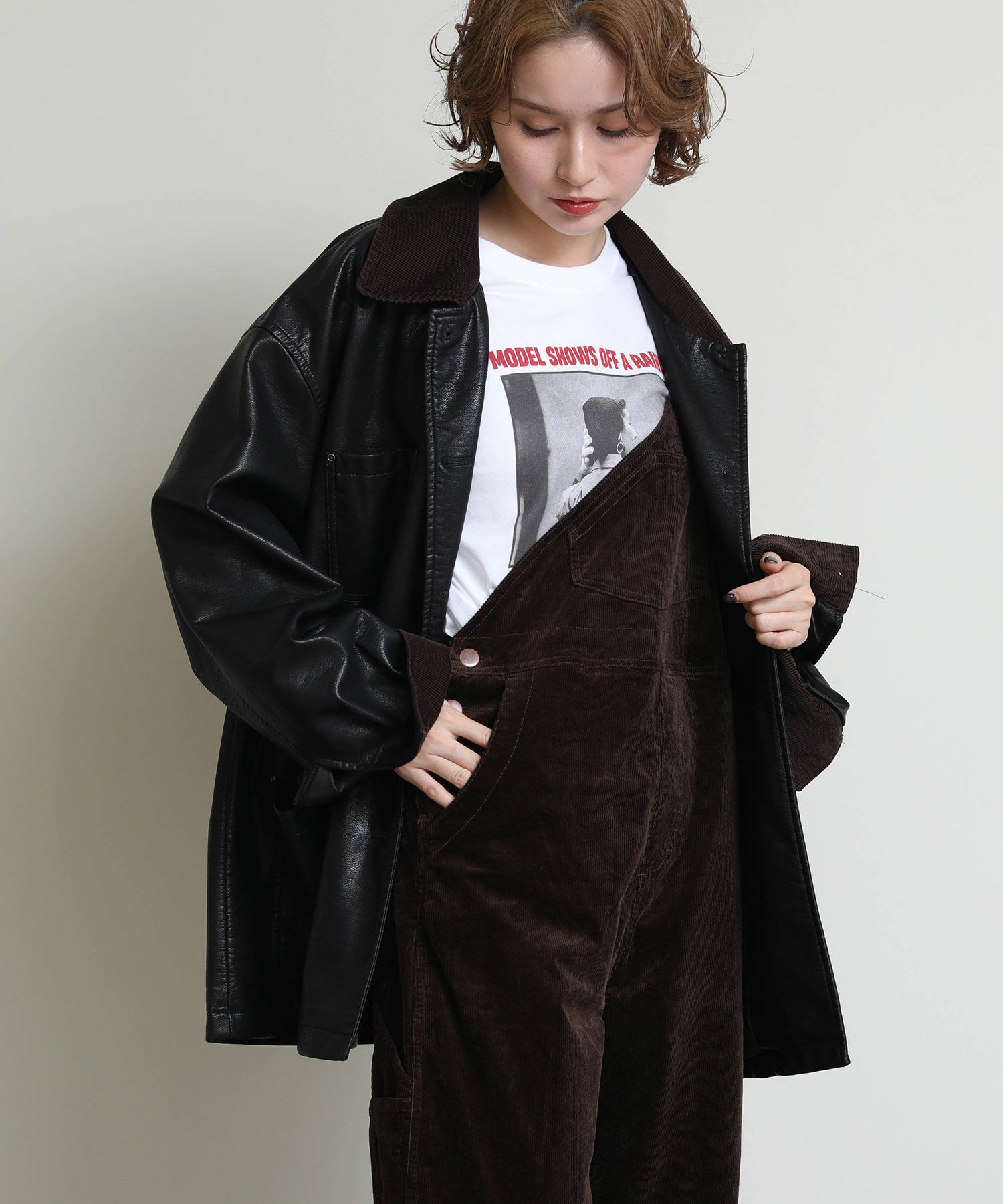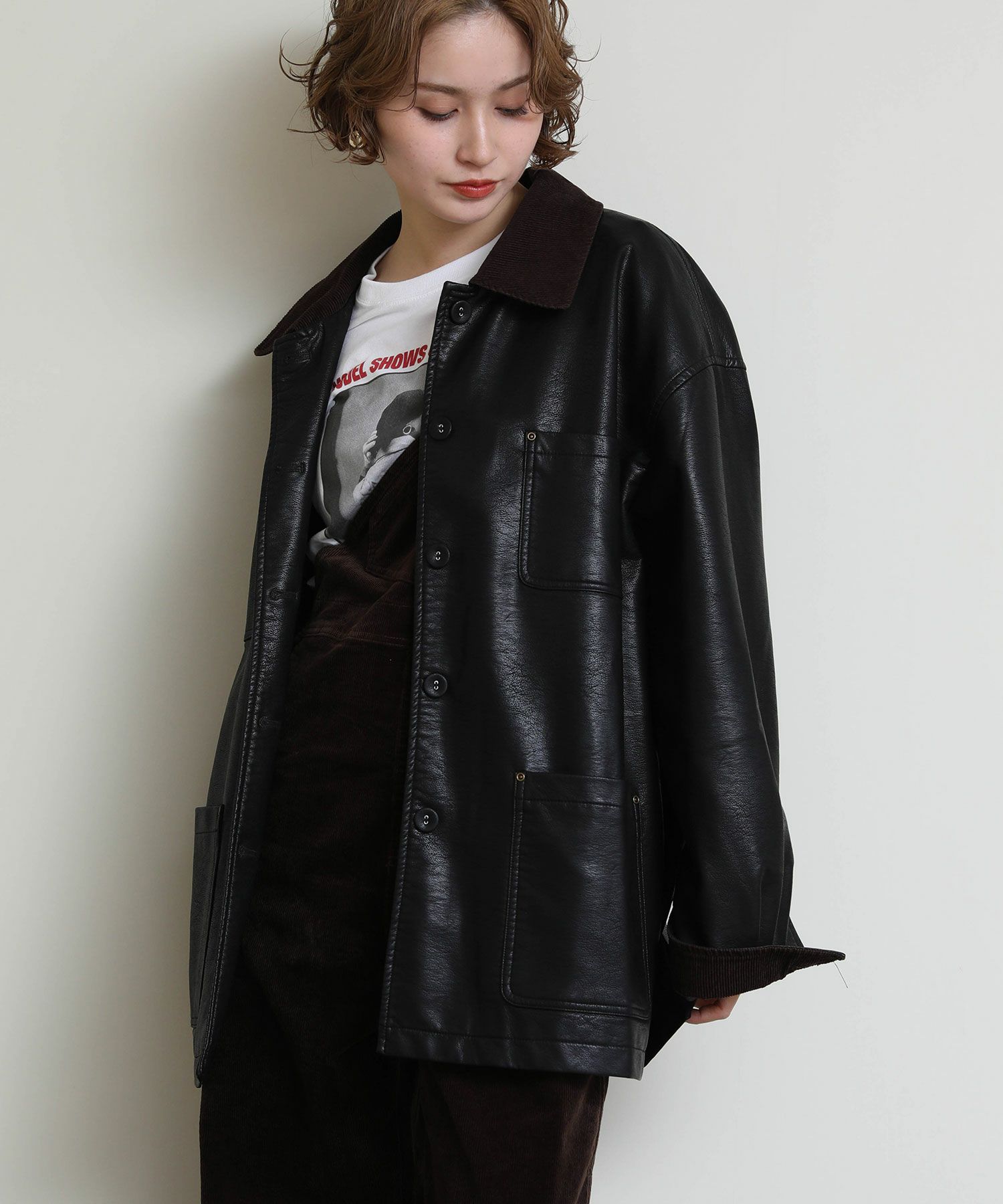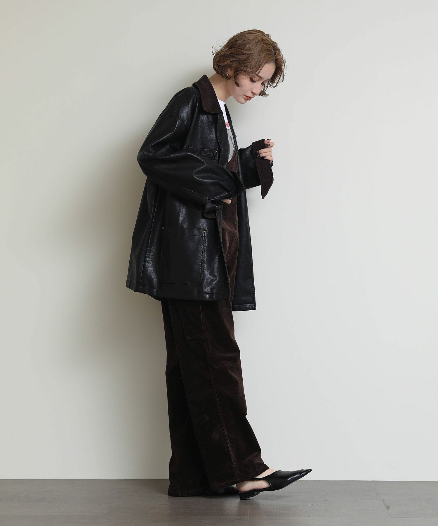 カジュアルなデザインが魅力のカバーオールを、秋らしくフェイクレザーで仕上げました。