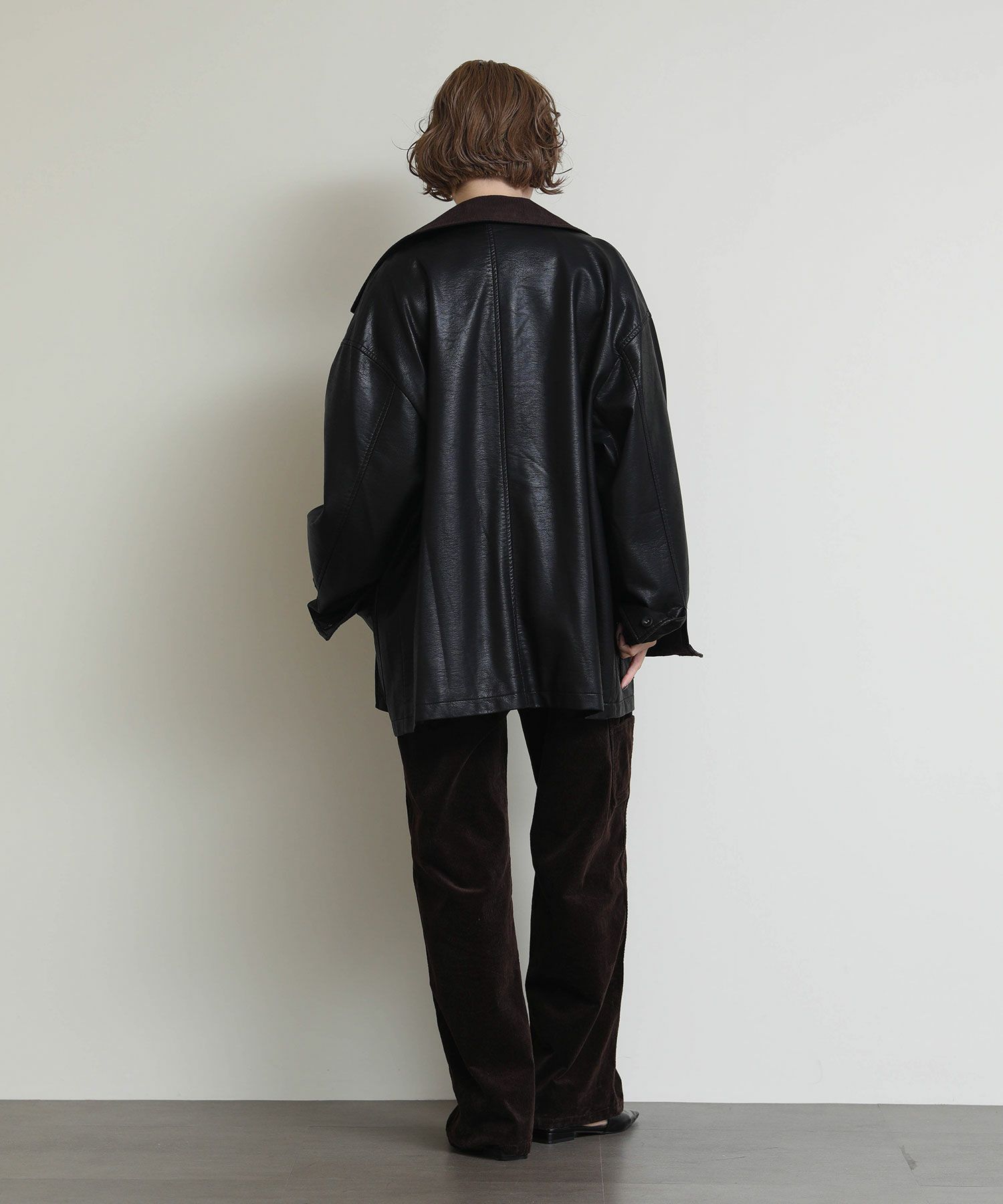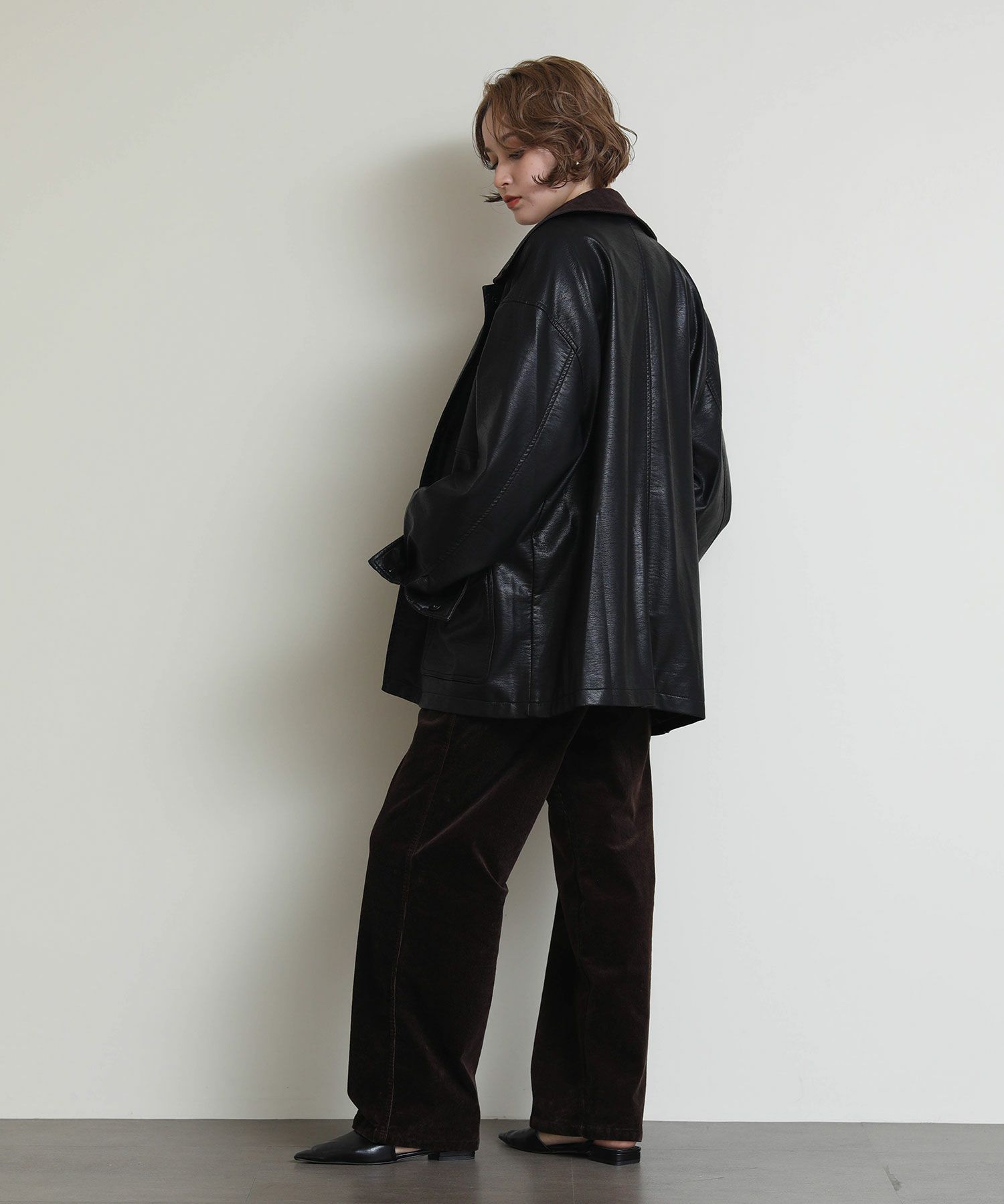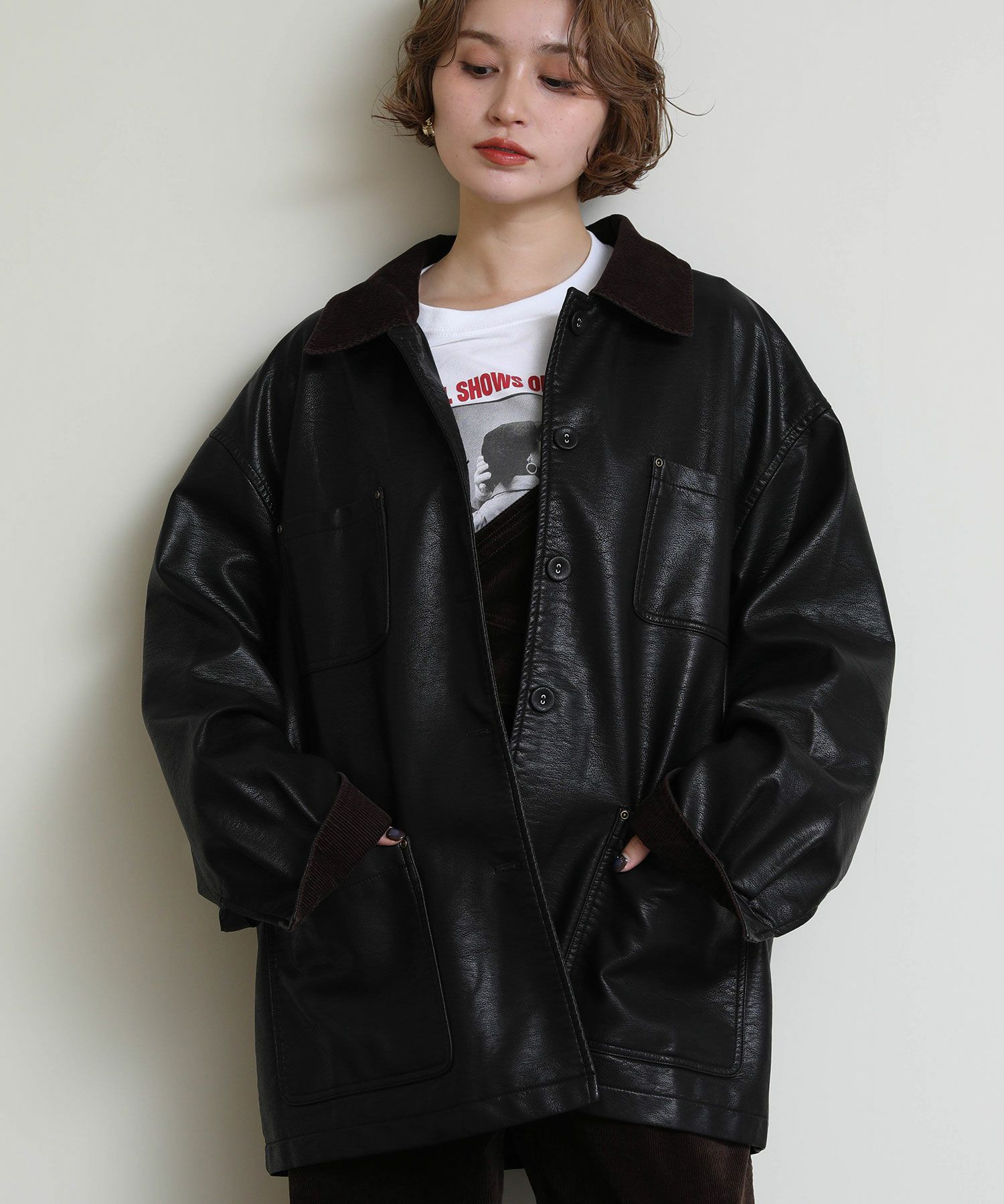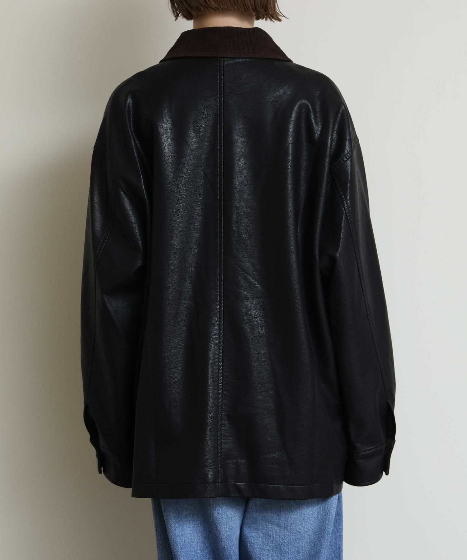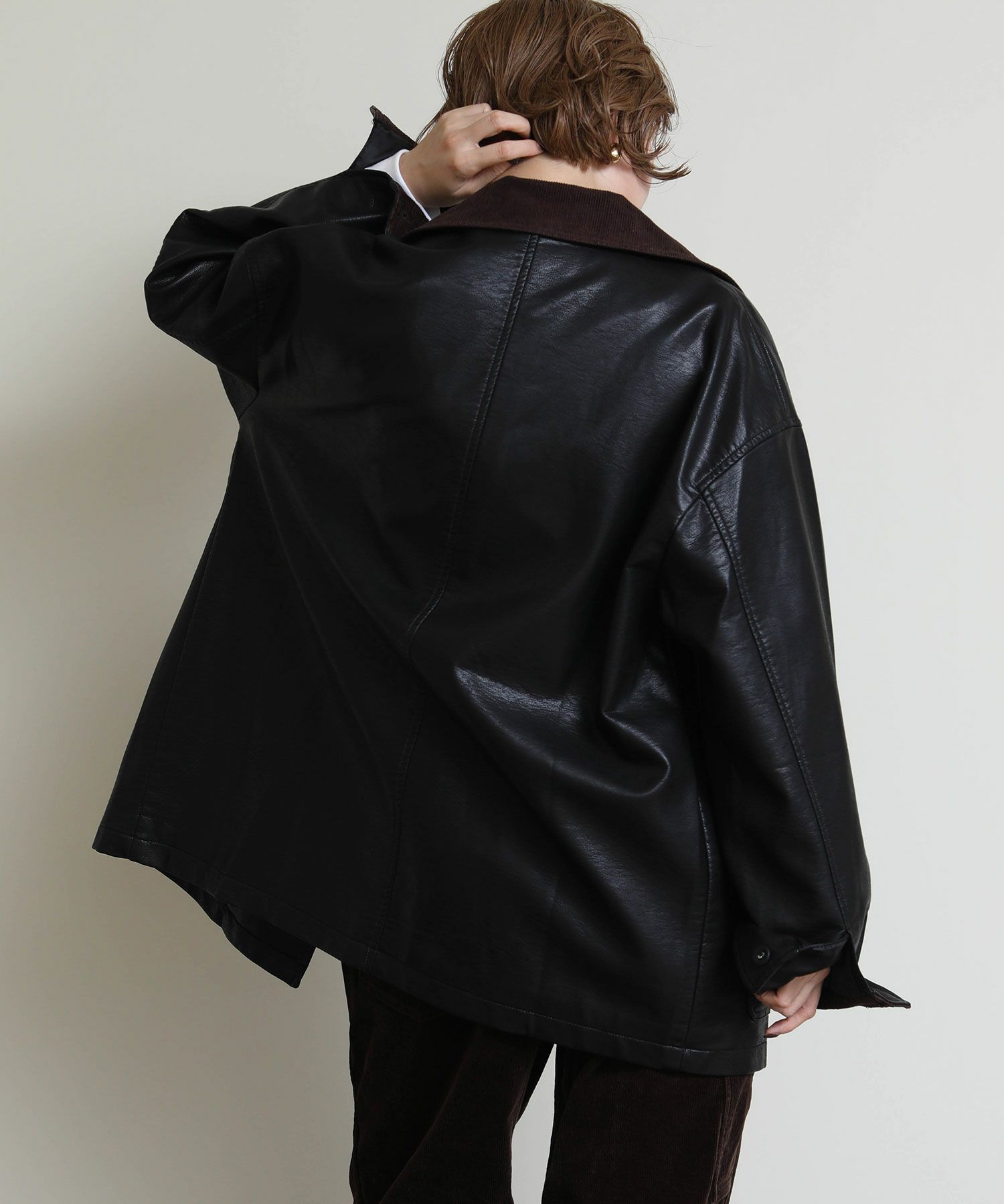 カジュアルなデザインが魅力のカバーオールを、秋らしくフェイクレザーで仕上げました。
