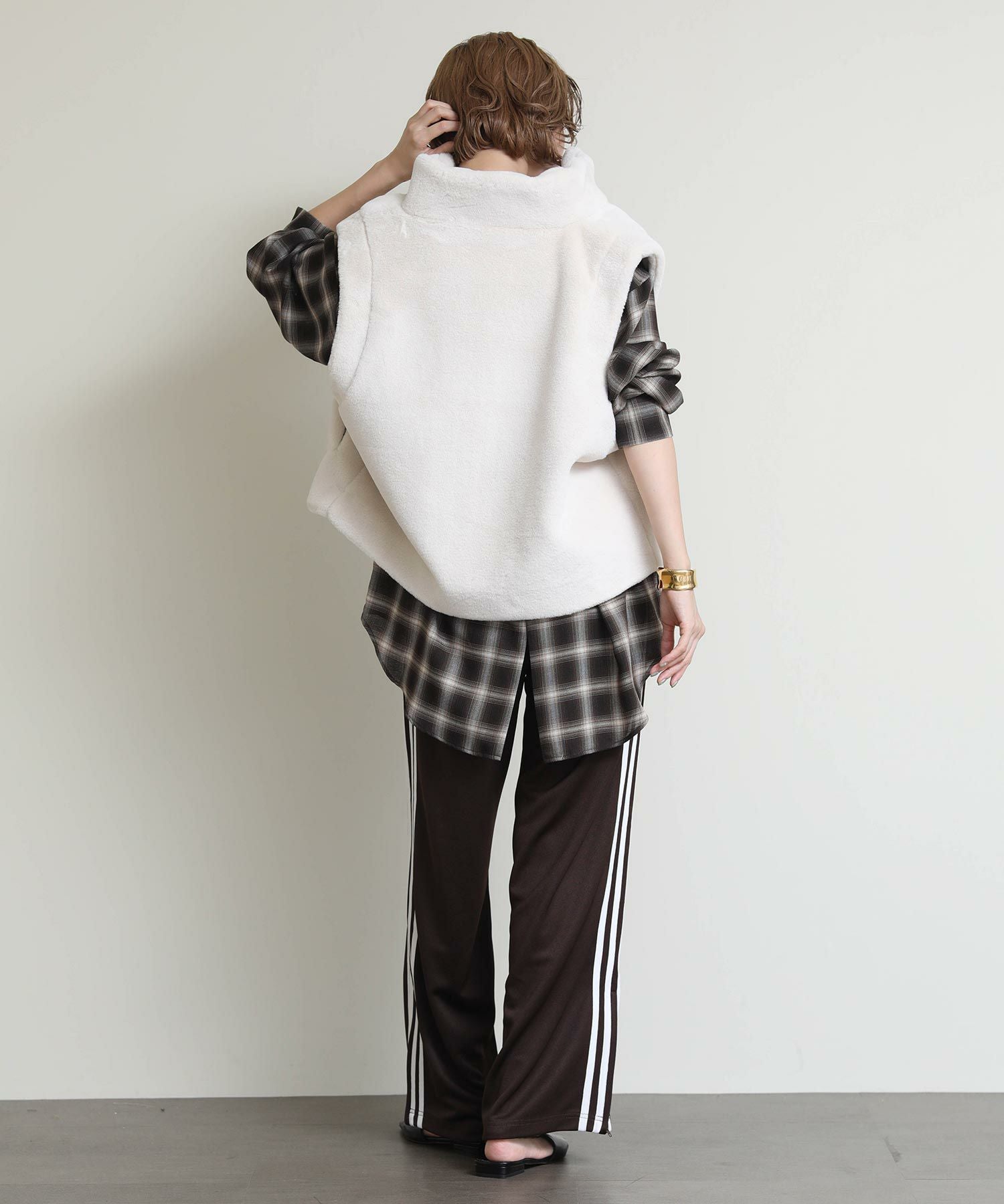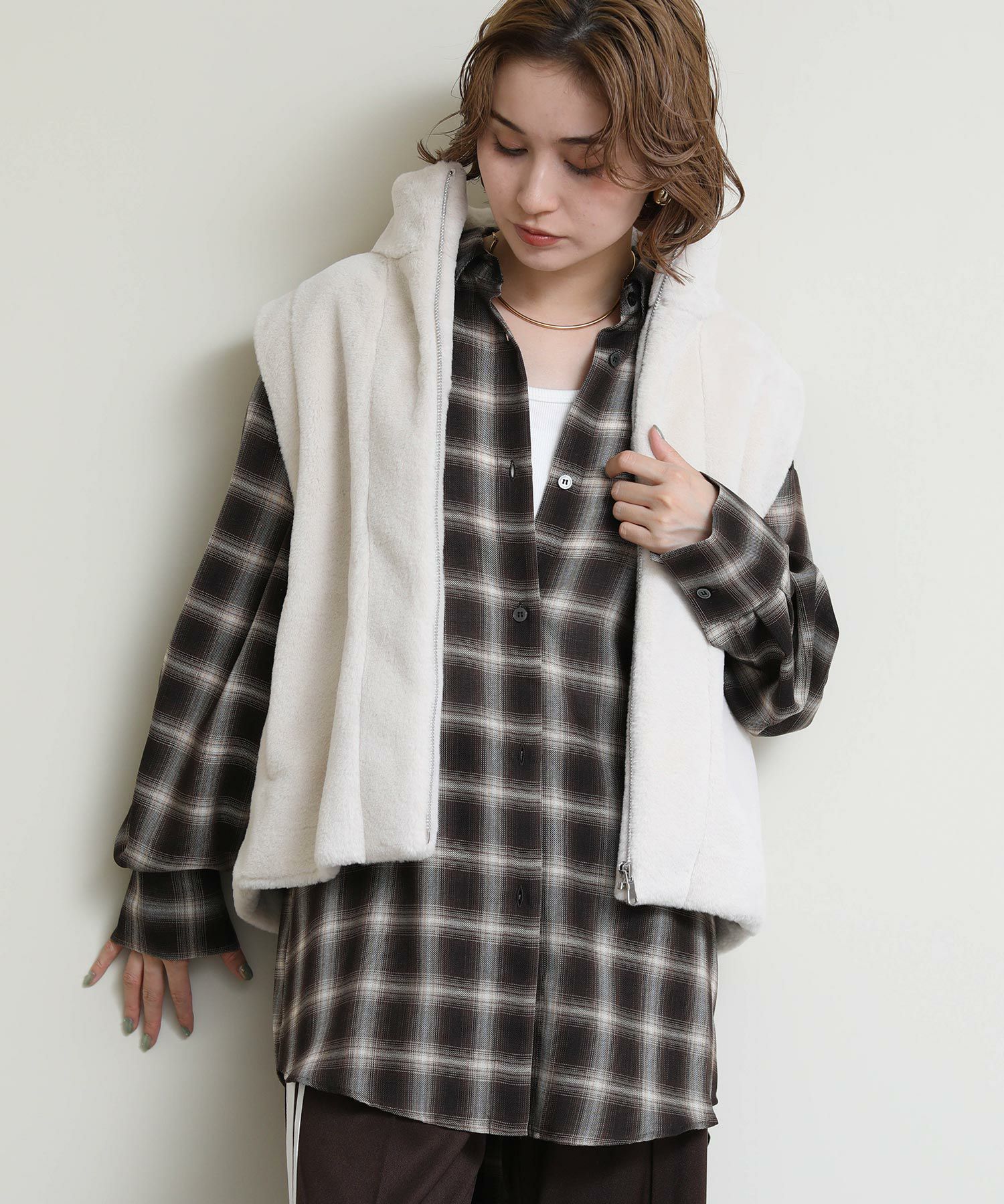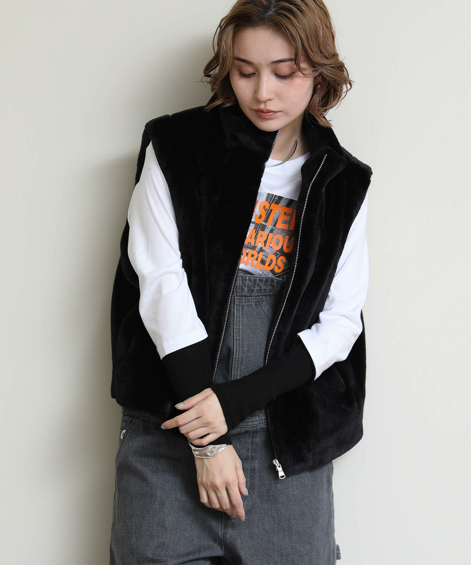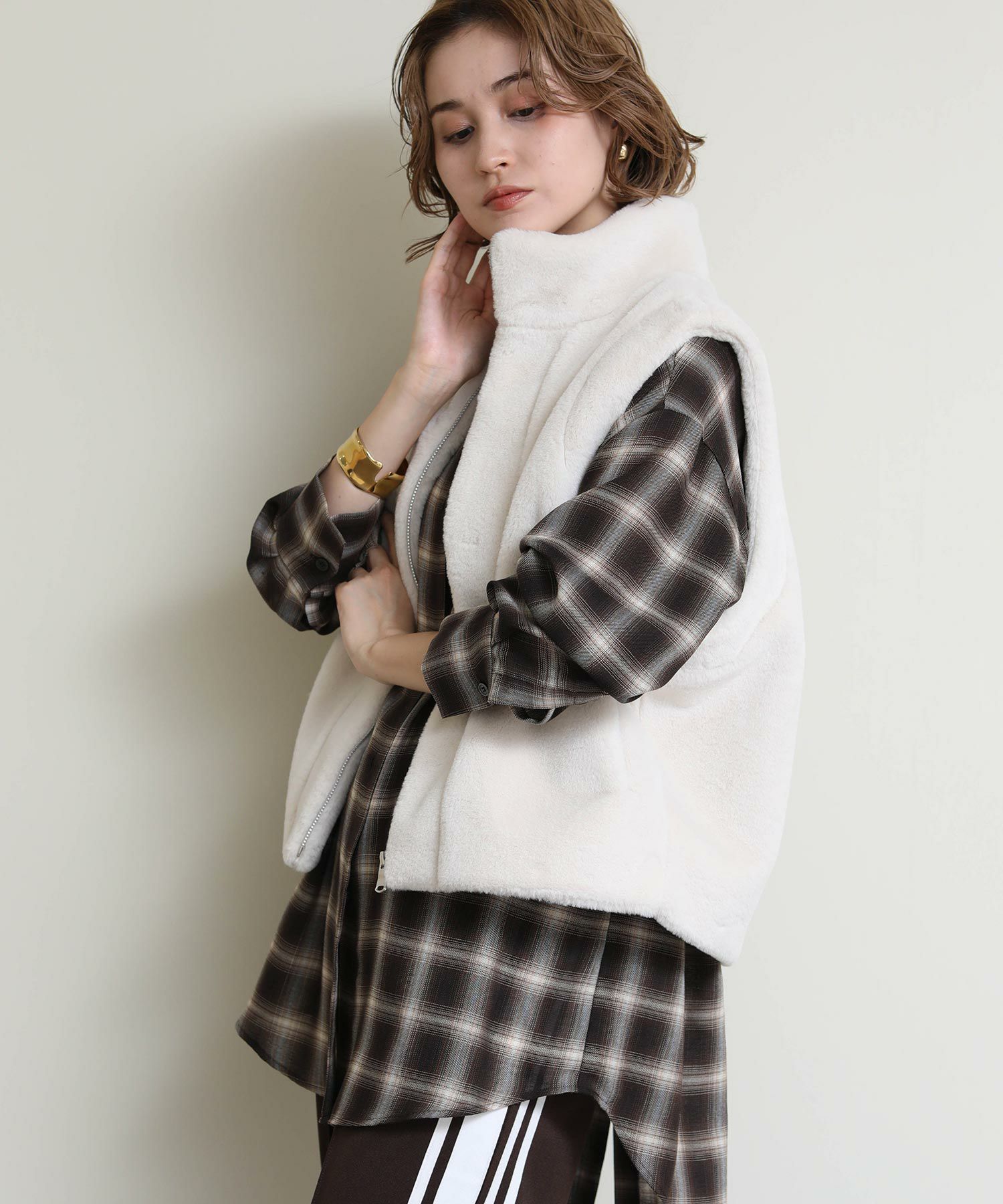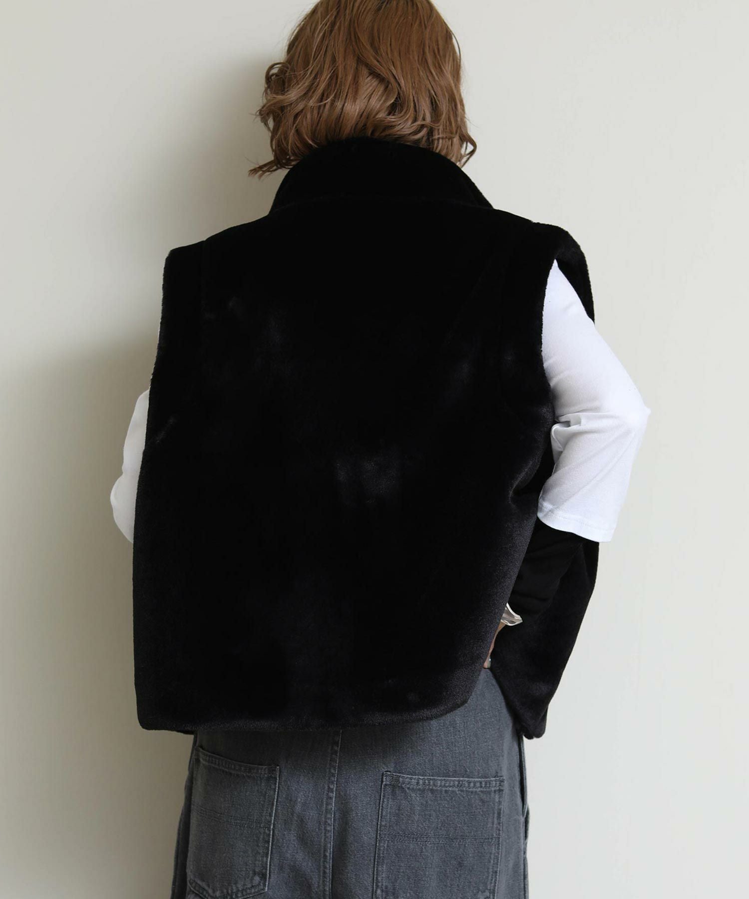 モードカジュアルな雰囲気を後押しするファーベスト。