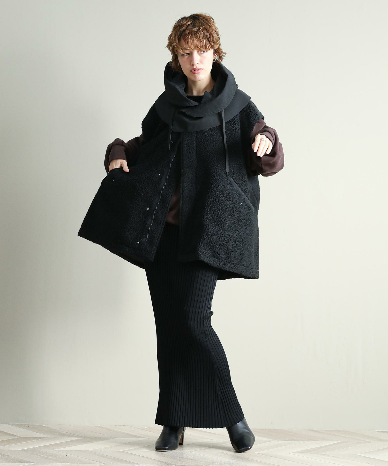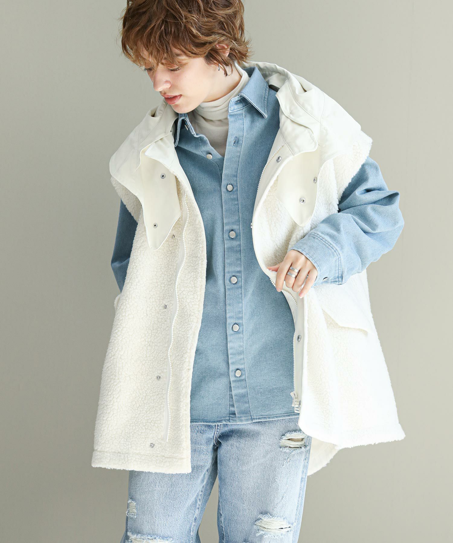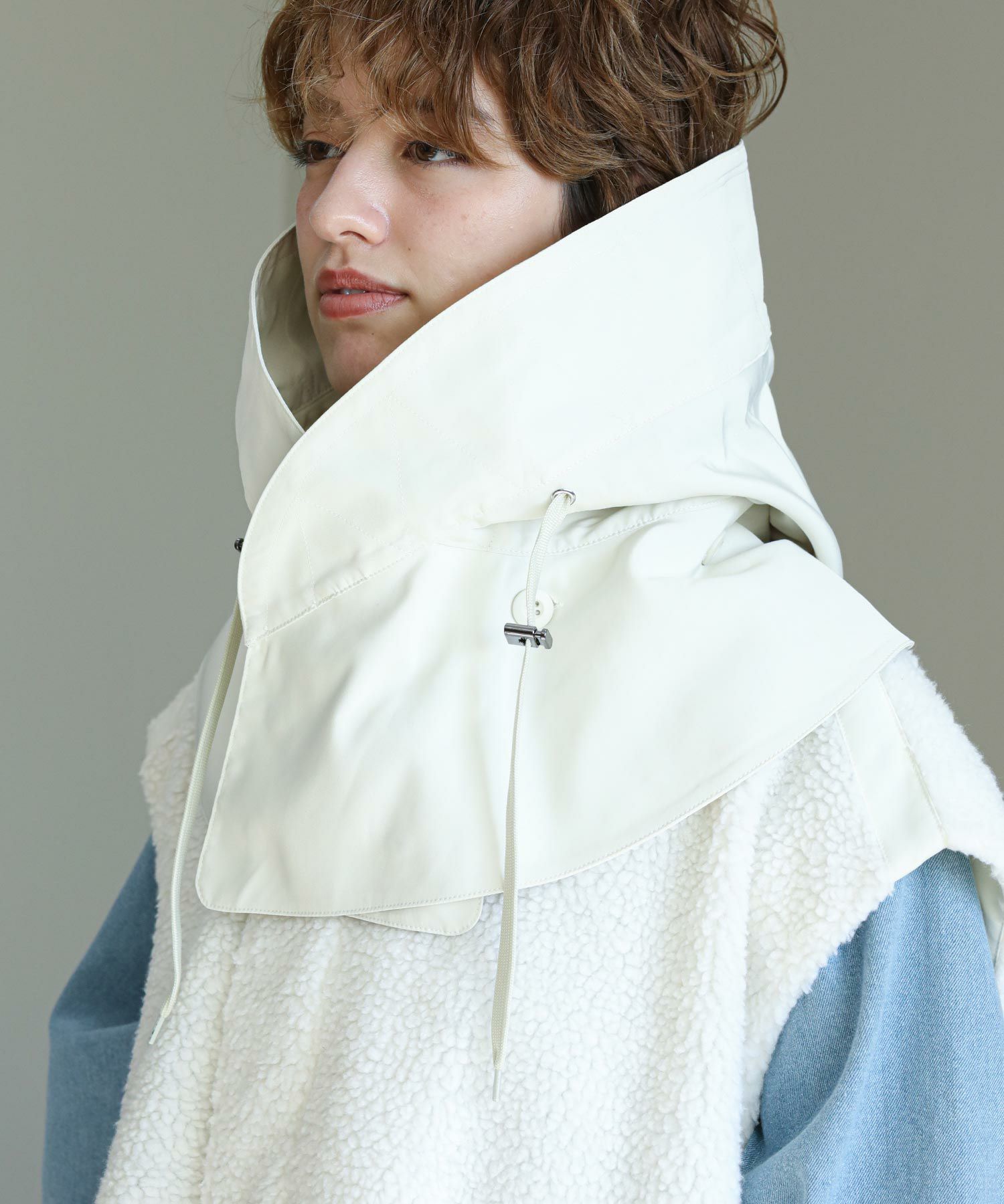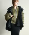ゆったりとしたサイズ感で厚手のニットやスウェットはもちろん、アウターの上からでも羽織れるデザイン。M65の外付けフードをデザインソースに、しっかり立つ首回りとフードの大きさにこだわり、小顔効果も◎ハリ感のある素材できれいなシルエットを作ります。テーラードジャケットやMA-1の上から羽織るとこなれ感も出ておすすめです。ボアとタフタを同トーンでまとめワーク感が出すぎないようにしています。