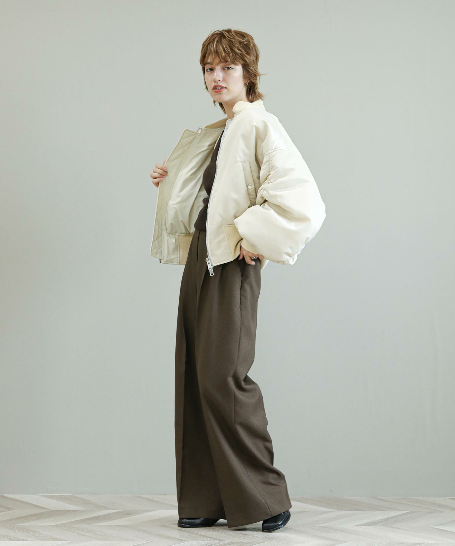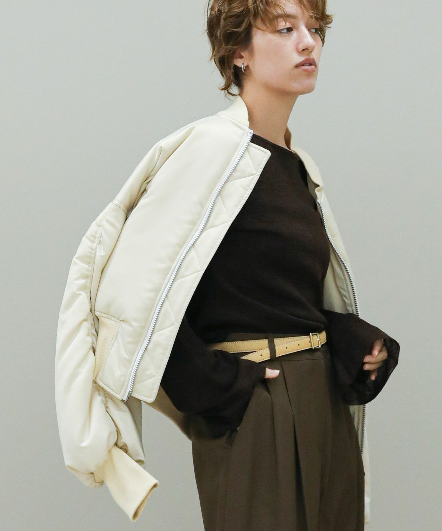 着丈と袖のバランスがポイント。さっと羽織るだけでスタイルが決まります。重厚感のあるファスナーやヘビーなリブなどMA-1らしさに拘りながらも女性らしいスタイルにマッチするシルエットです。今シーズンはライトベージュとカーキの2色。重くなりがちな秋冬スタイルを軽やかに仕上げてくれます。