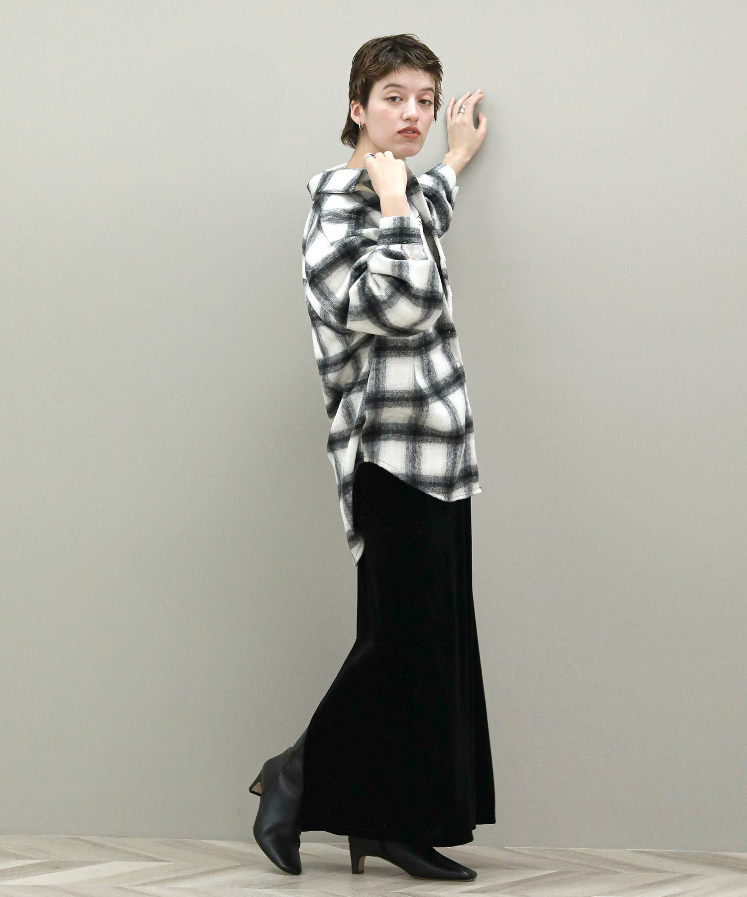 生地はしっかりと厚みがありながらもソフトな風合いが魅力。こなれ感のあるオーバーサイズでインナーにニットやスウェットを着て羽織ることもできます。腰回りをカバーしてくれる着丈でタイトスカートとも好相性。