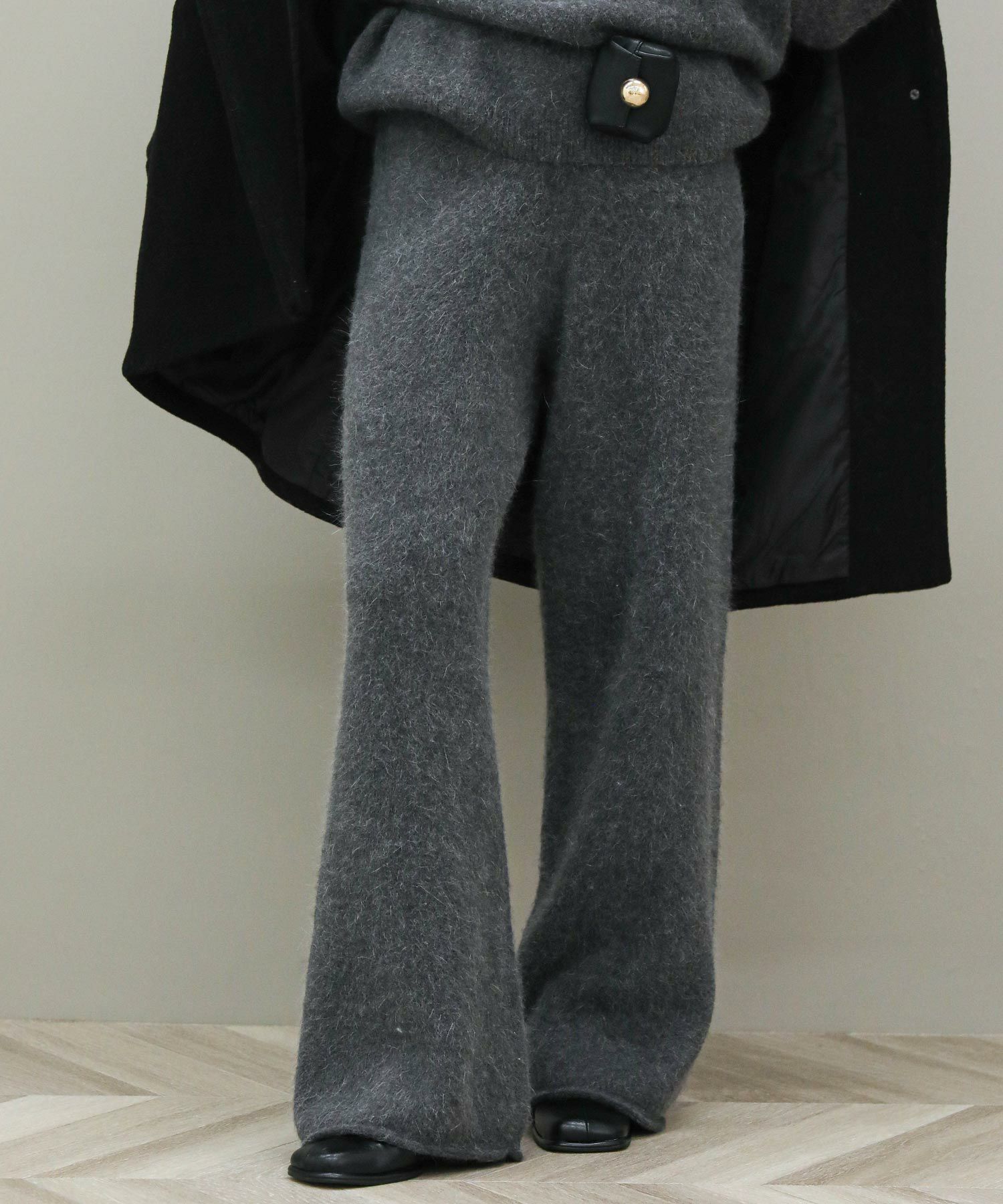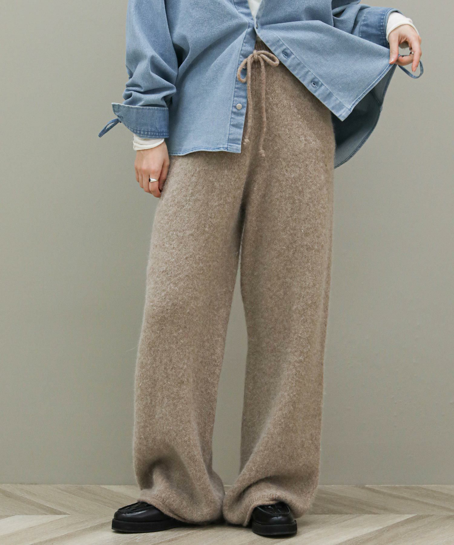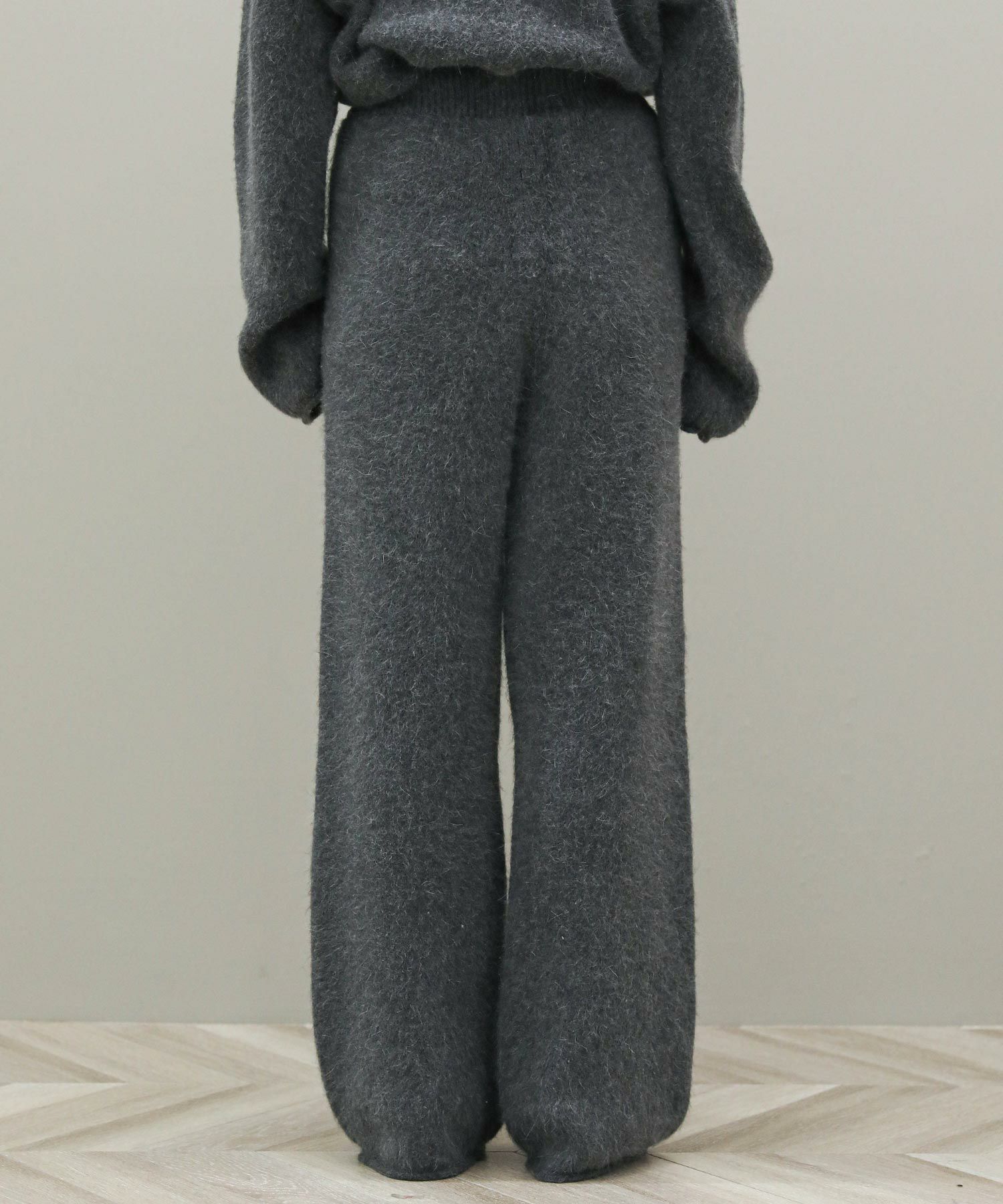 毛足の長いふんわりとしたニットのドロストパンツ。