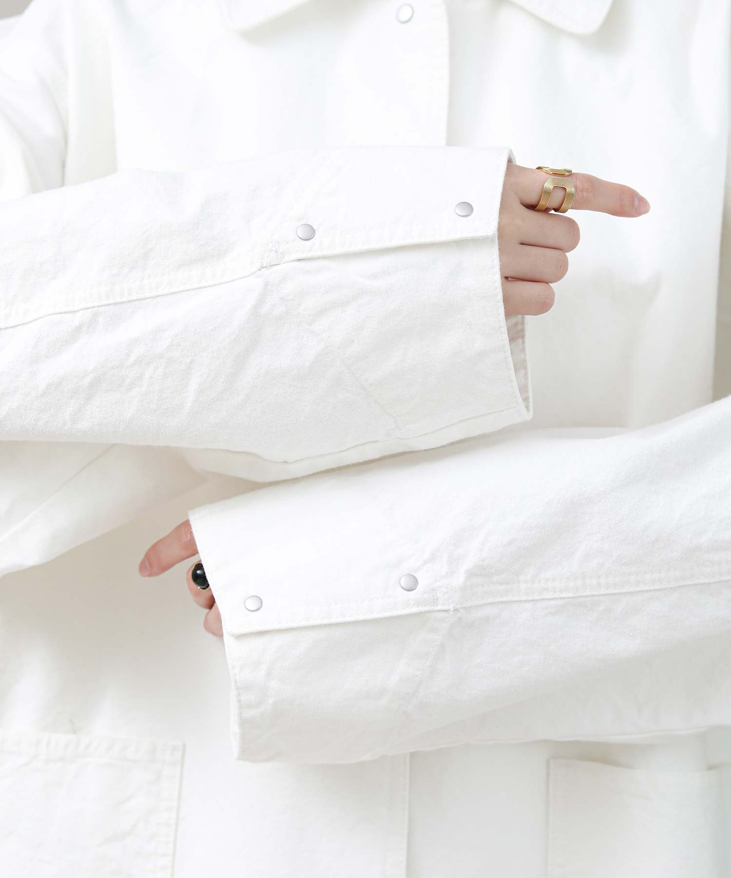 さなドットボタンや、肩・背中のハギ、両サイドの3本ステッチなど、細部のディテールまでこだわりの詰まった一枚。