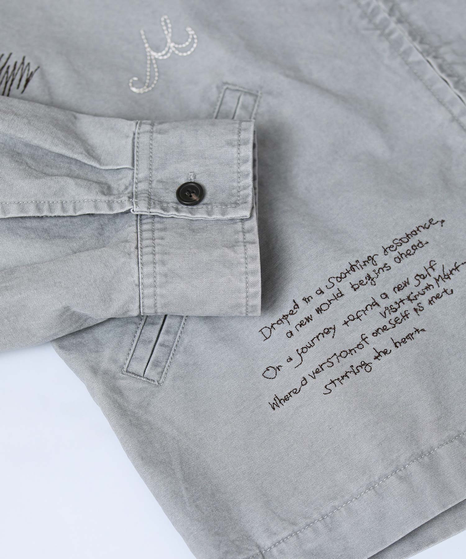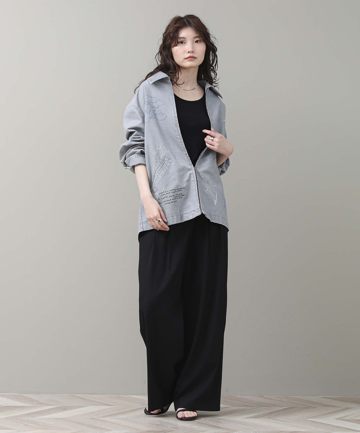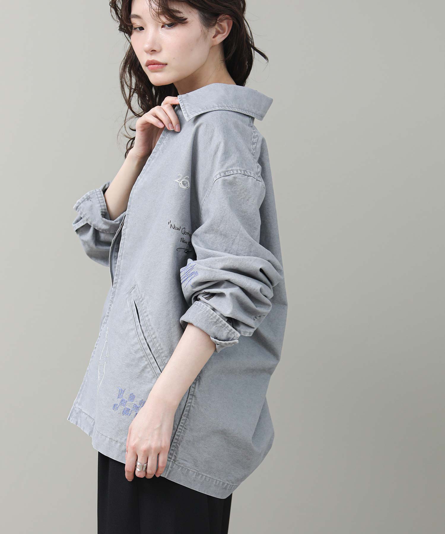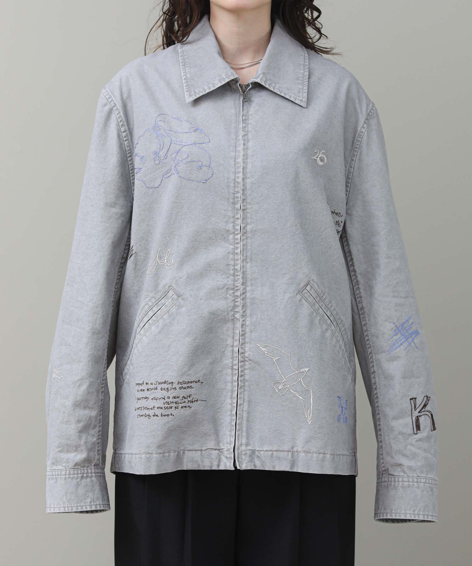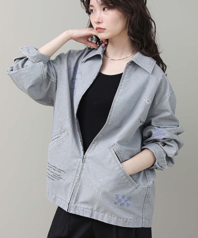 軽やかなライトジャケットに、落書きのように施された丁寧な刺繍が目を惹きます。