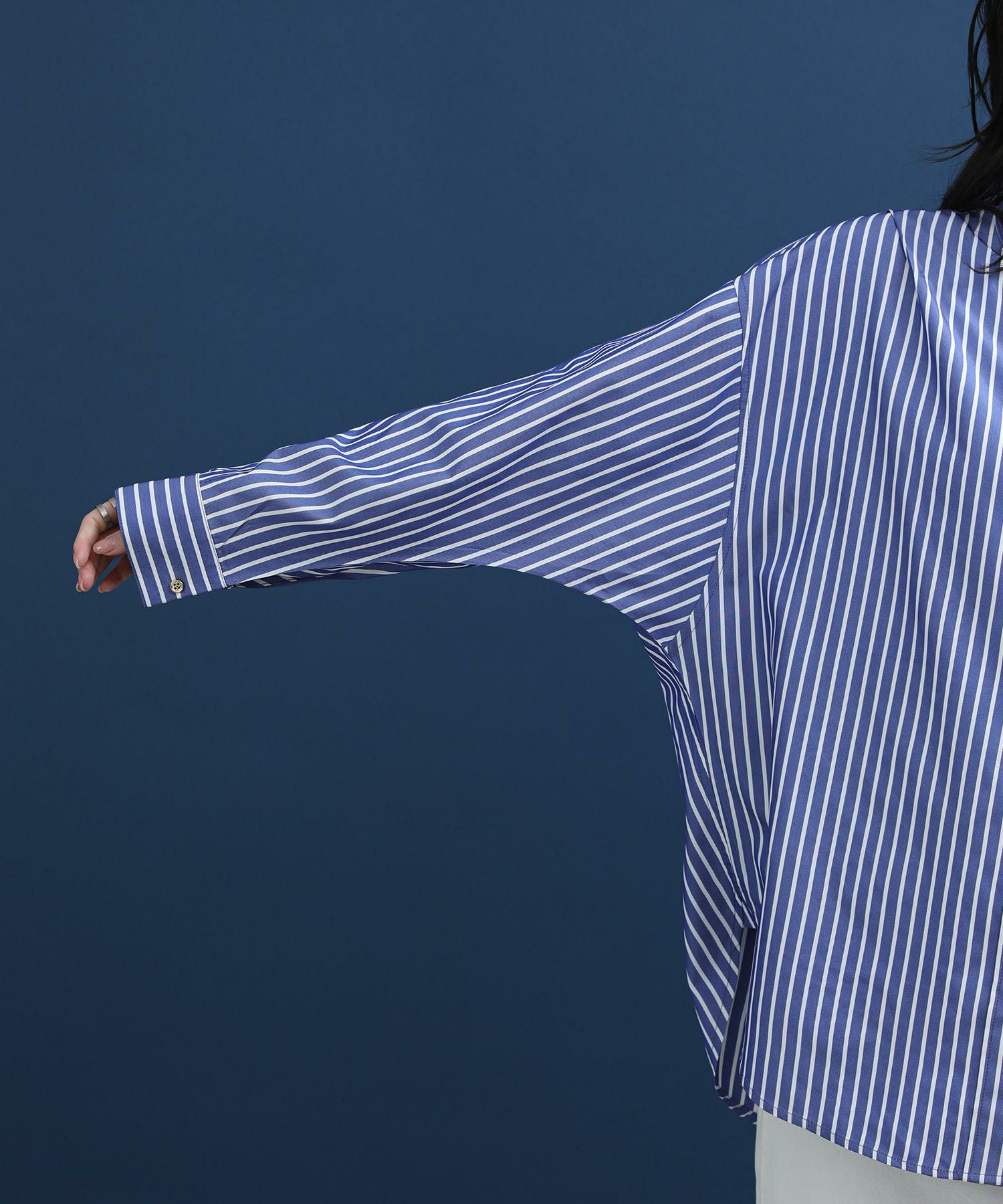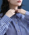 さりげなく光沢のあるストライプ生地が大人っぽく洗練された印象に。1枚でもサマになりますが、ジャケットのインナーやニット、Tシャツとのレイヤードにもおすすめ。ゴールドの釦がきらりと光り、目を惹きます。シワにならないので普段使いも安心◎