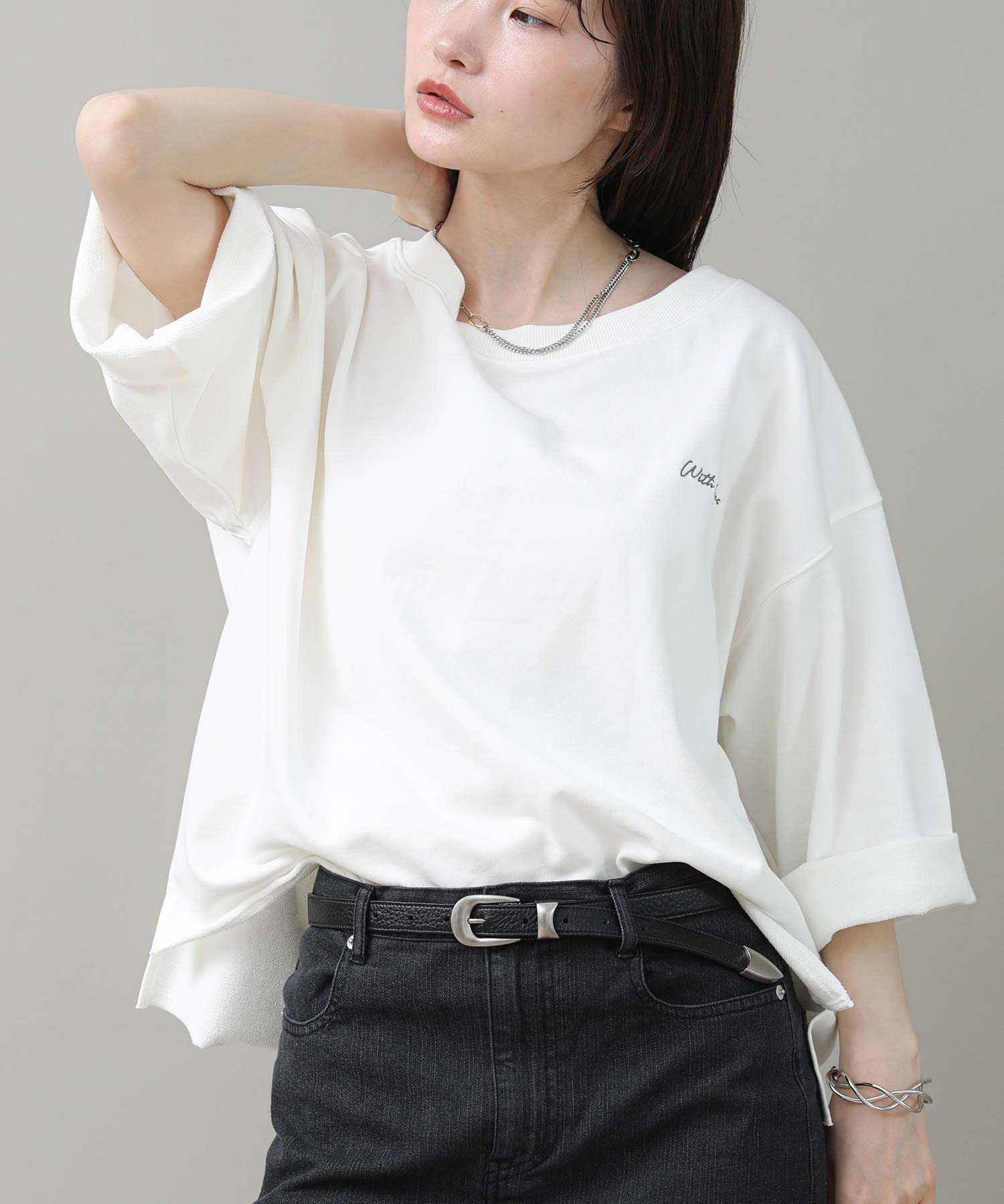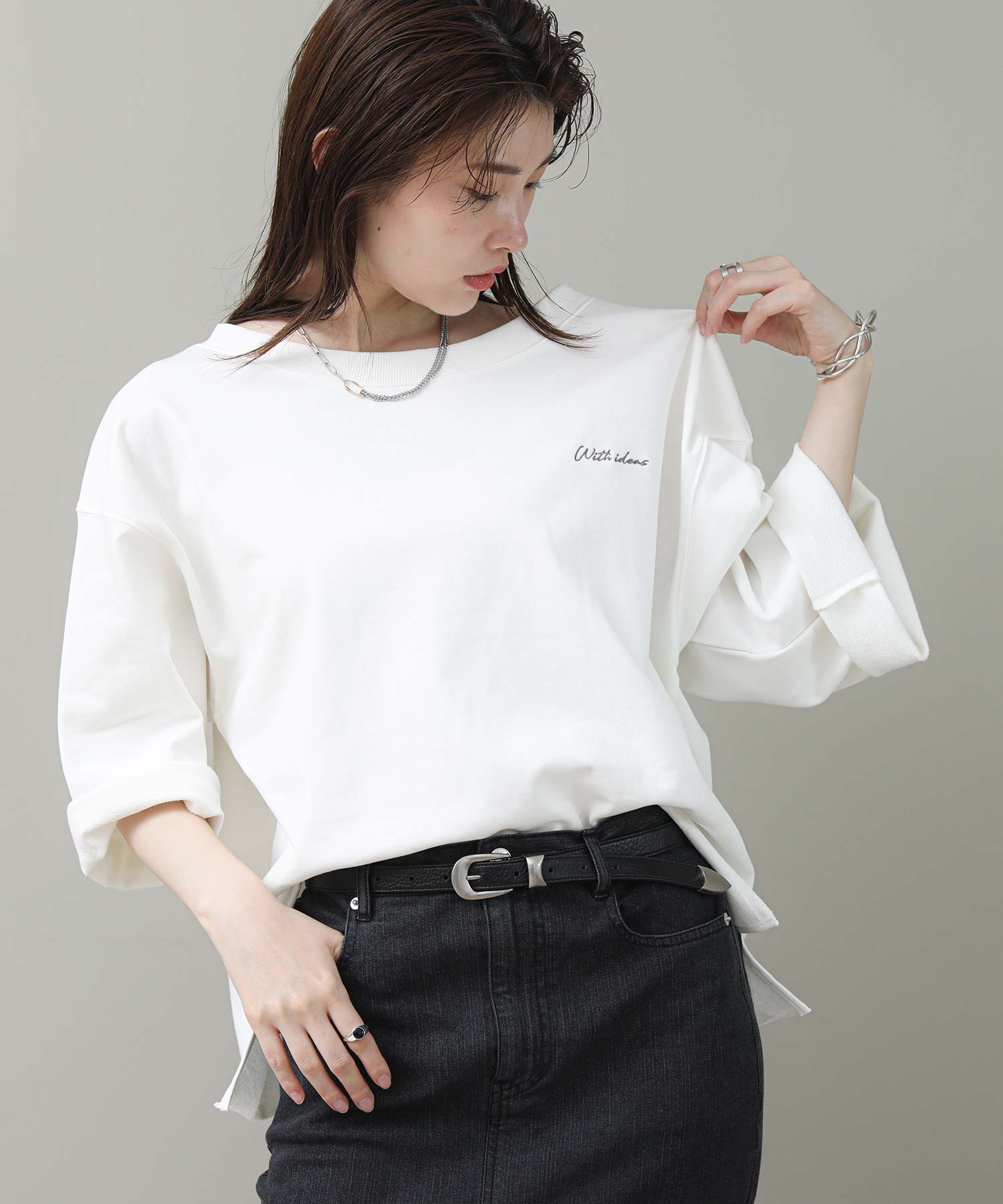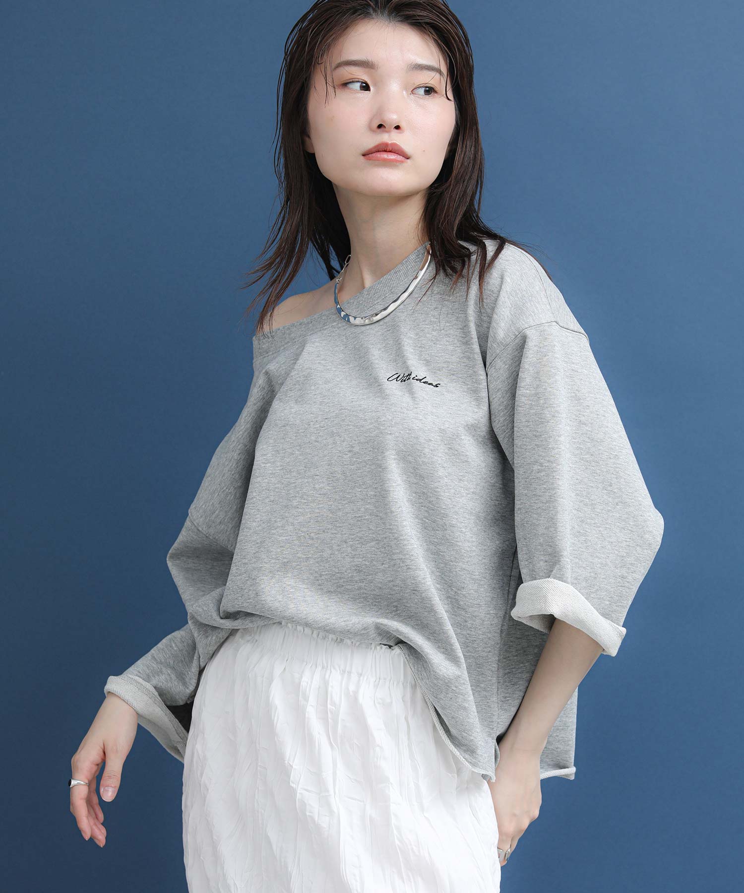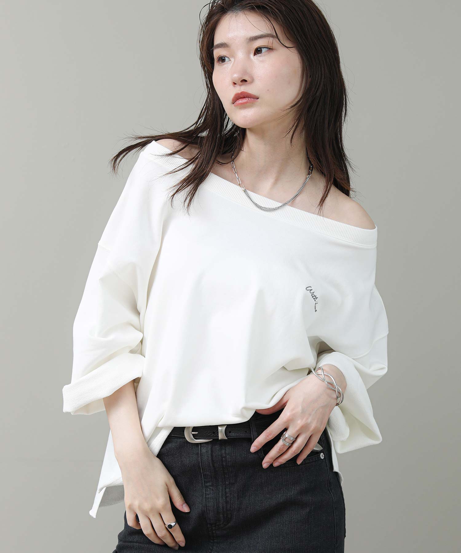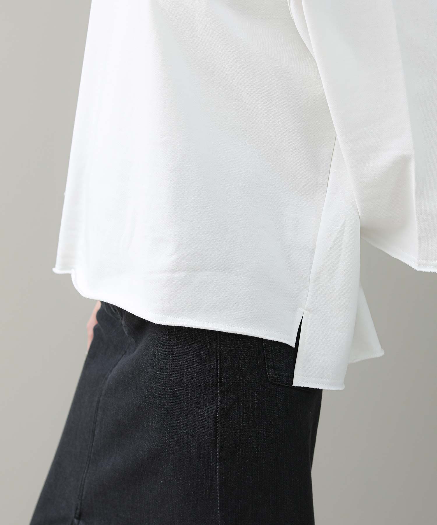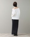 袖と裾は裁ち切り仕様でラフさを表現。袖はロールアップして7分袖にして着ると、こなれた雰囲気になります。片側だけ肩を落とした肌見せスタイルが今の気分にぴったりの1枚です。