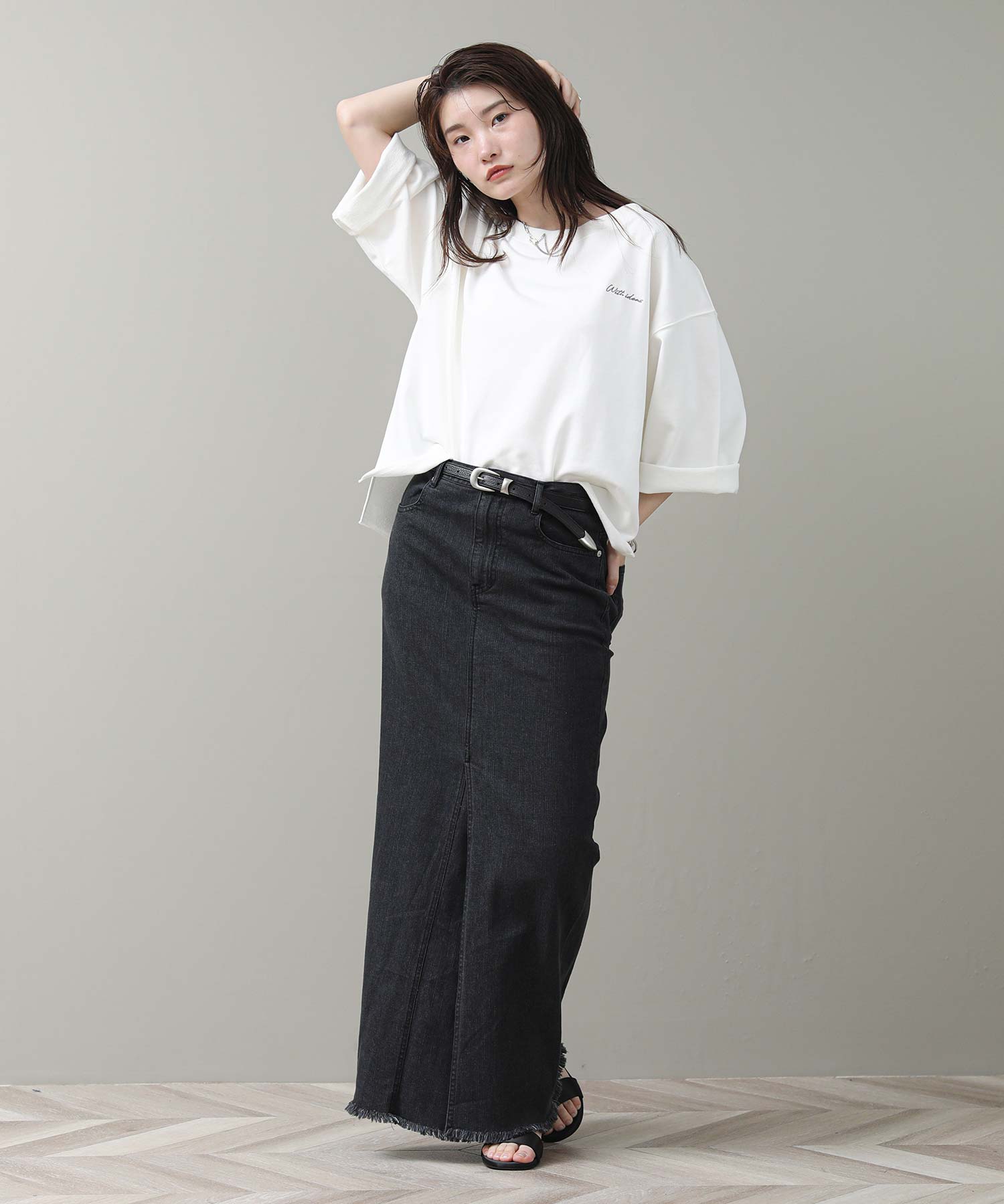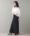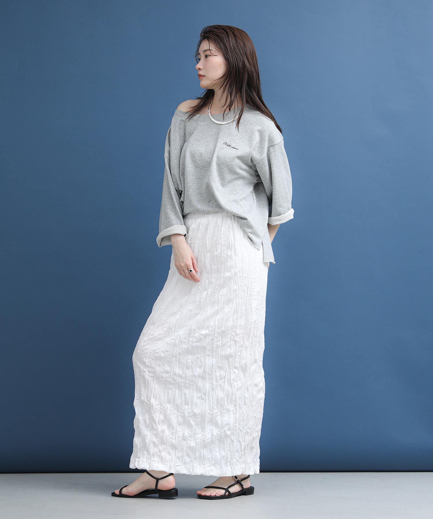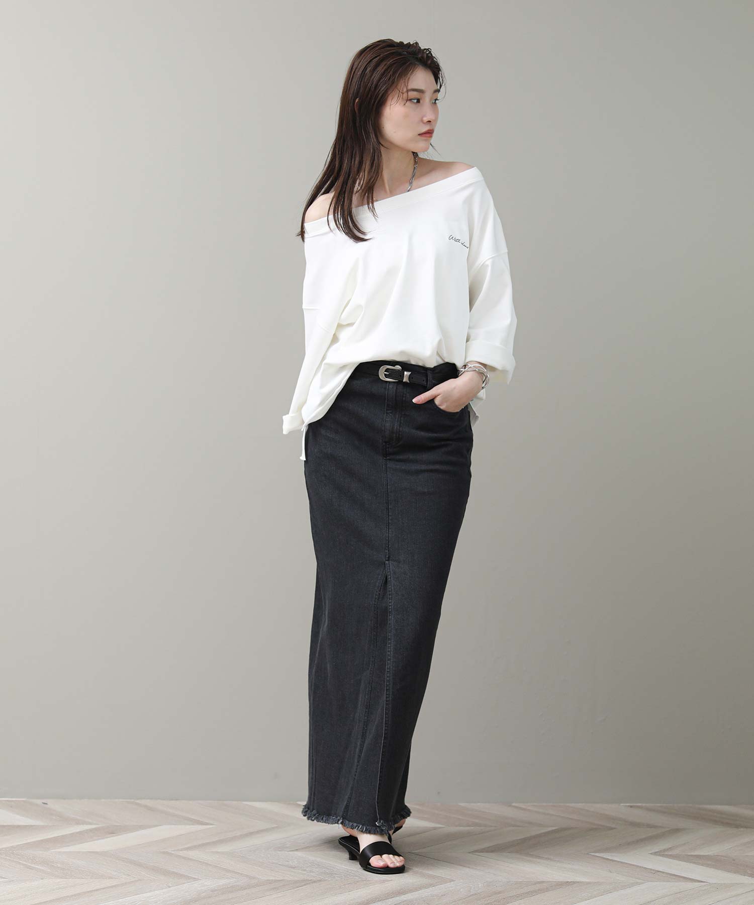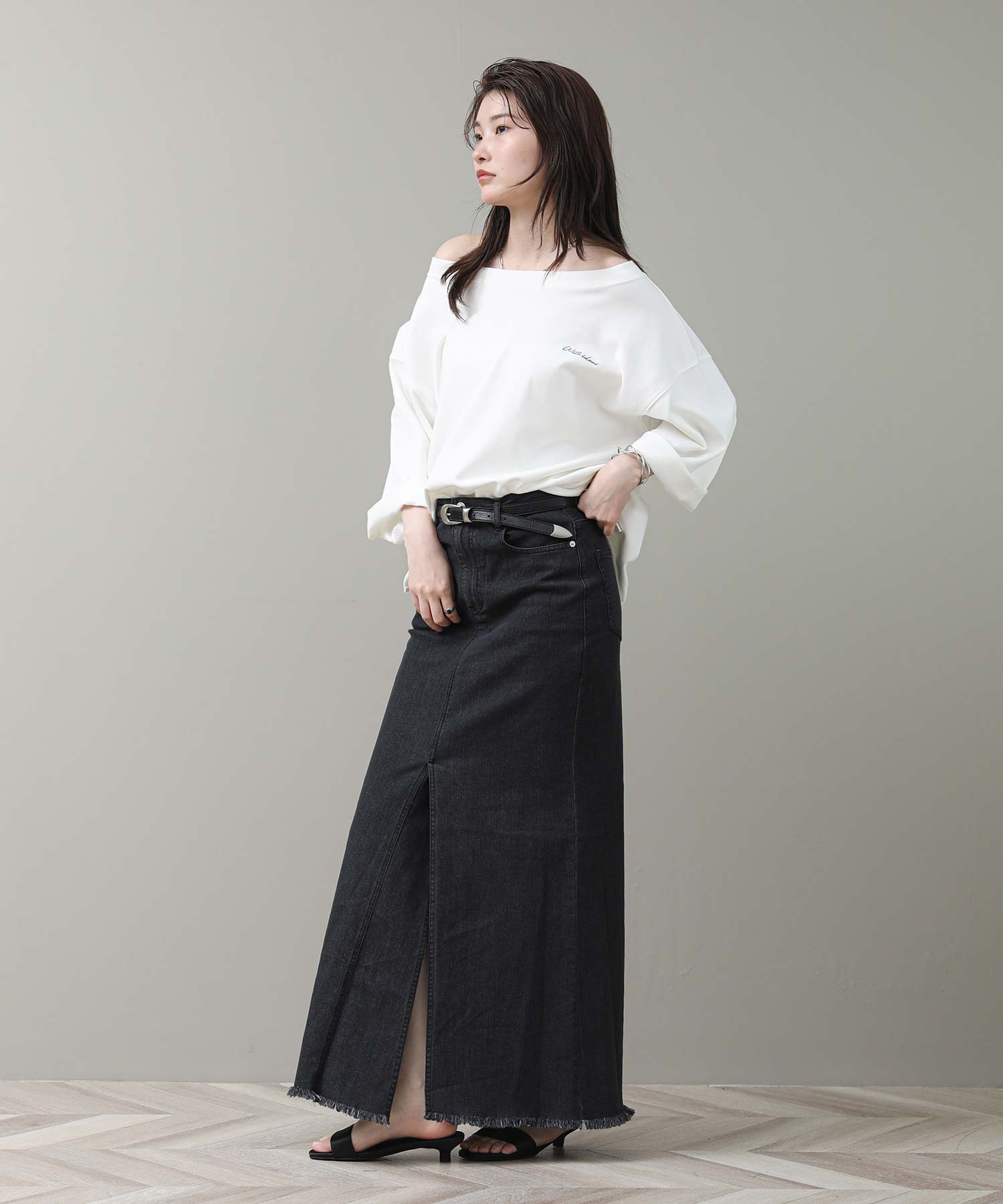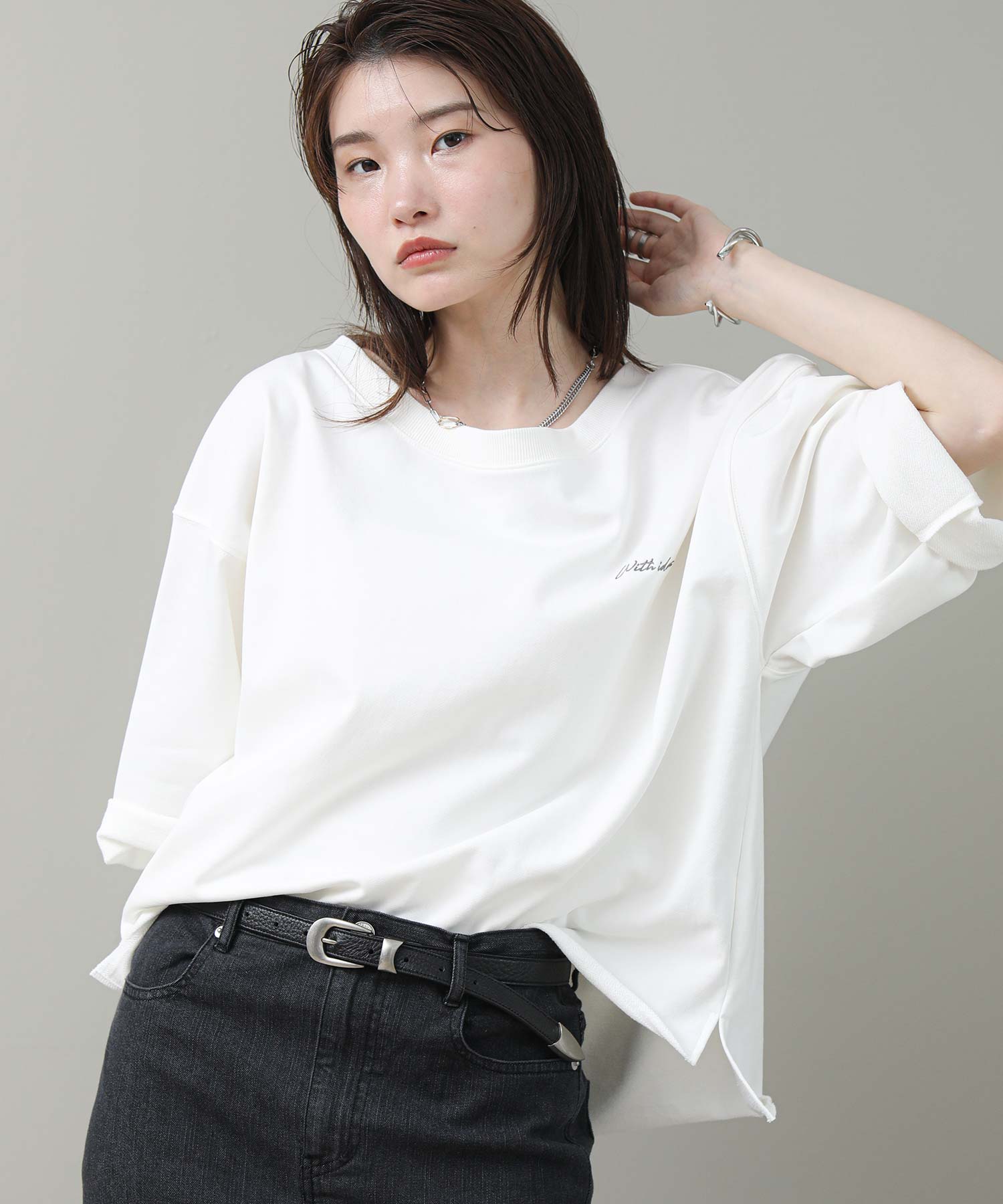 袖と裾は裁ち切り仕様でラフさを表現。袖はロールアップして7分袖にして着ると、こなれた雰囲気になります。片側だけ肩を落とした肌見せスタイルが今の気分にぴったりの1枚です。