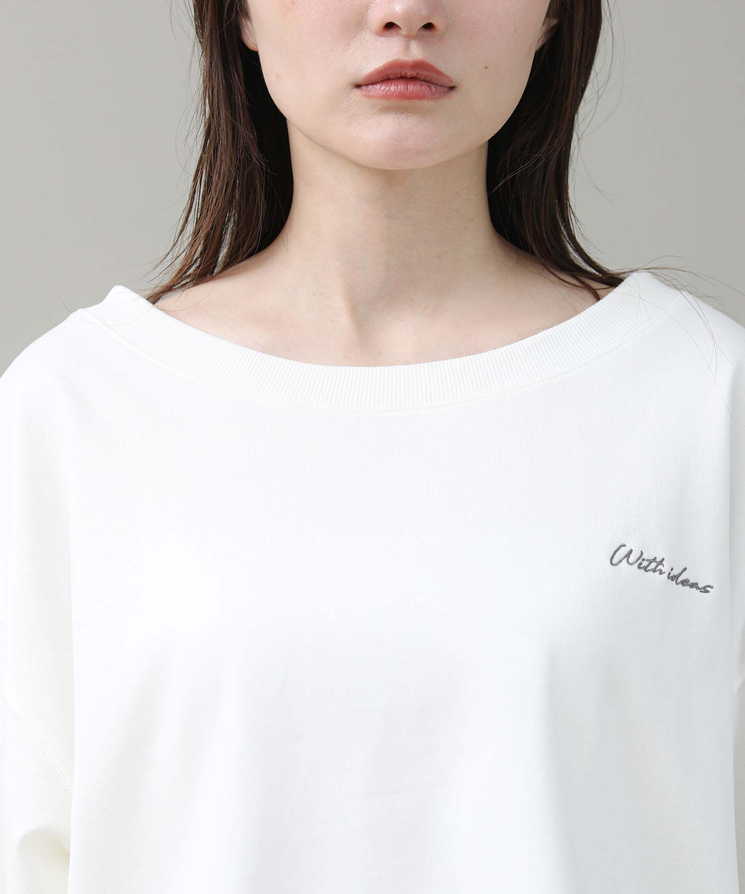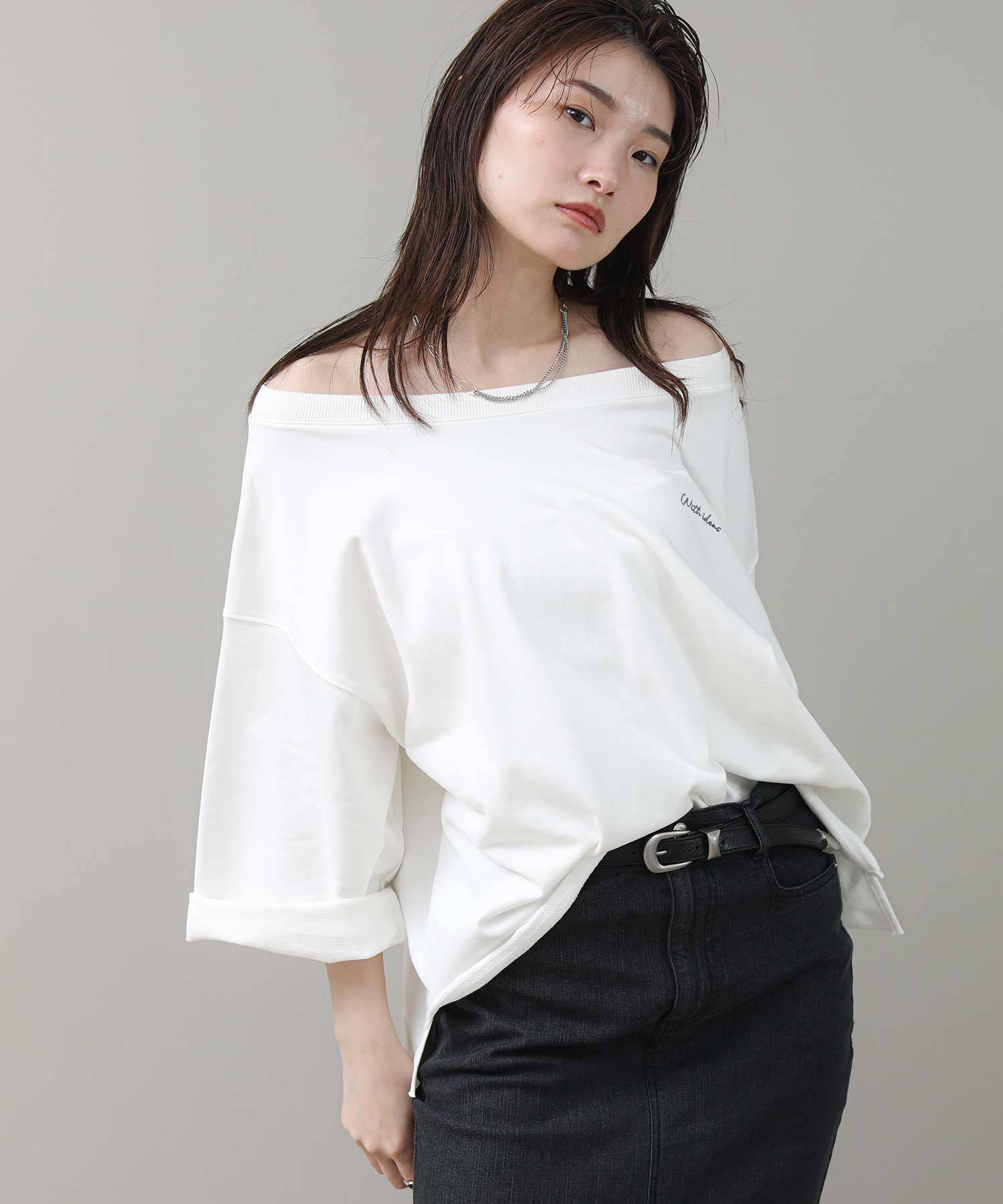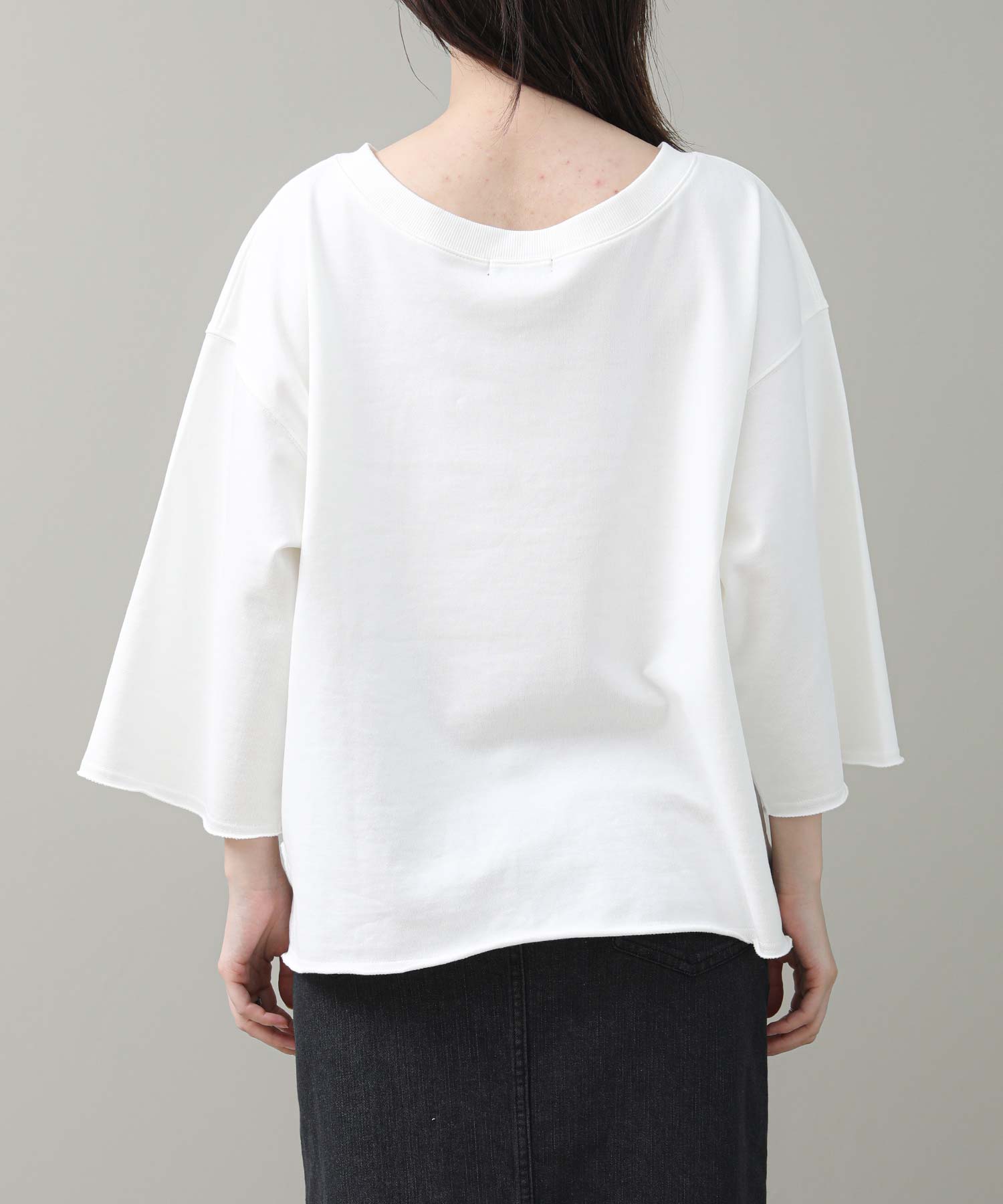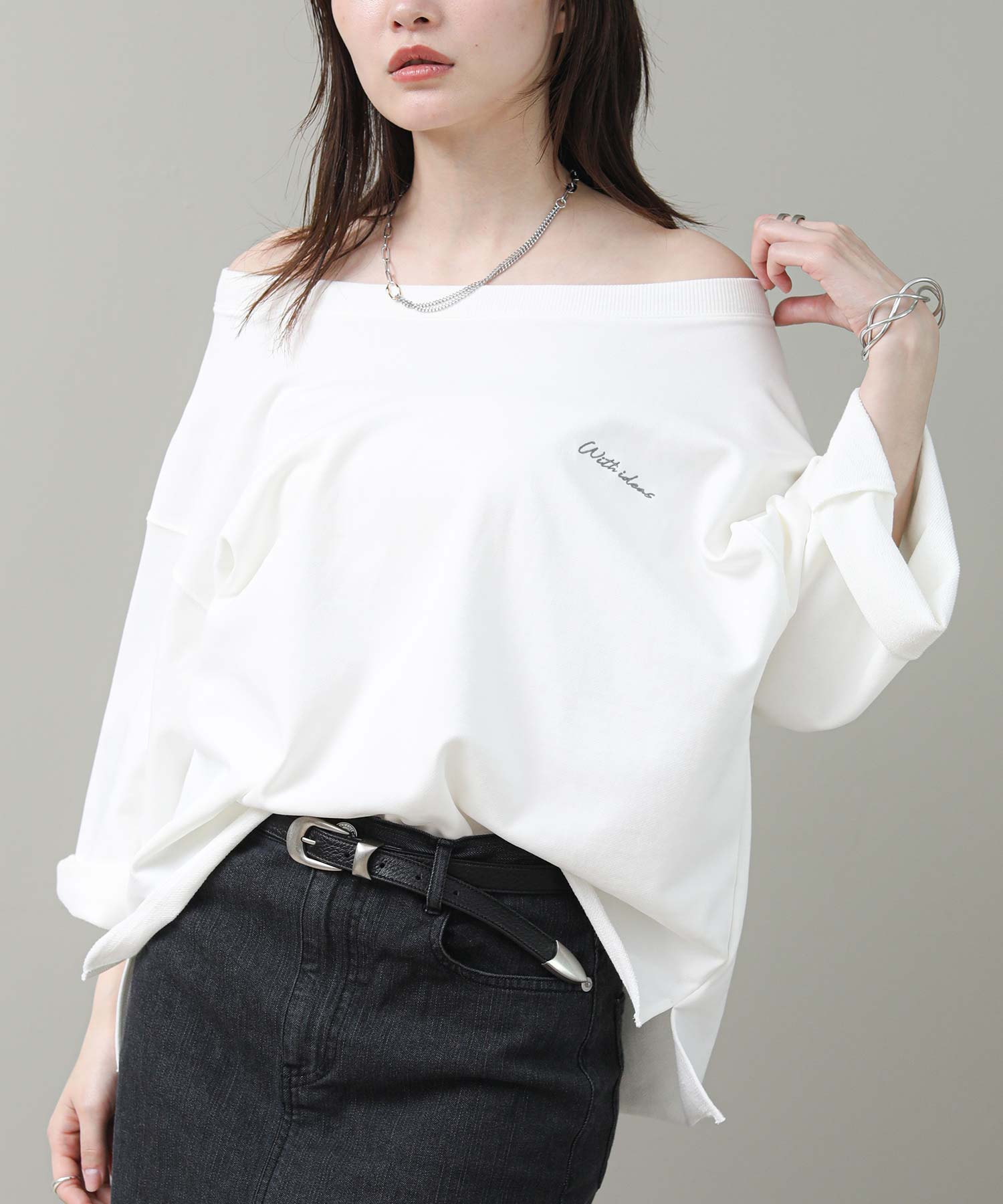 リジョイスのアイコンでもあるオフショルデザインをミニ裏毛のカジュアルトップスに落とし込みました。