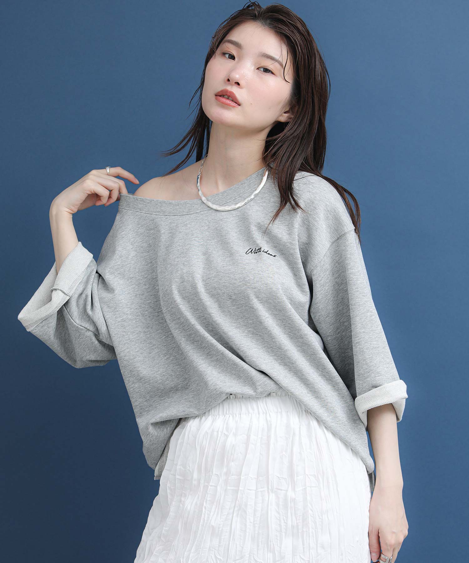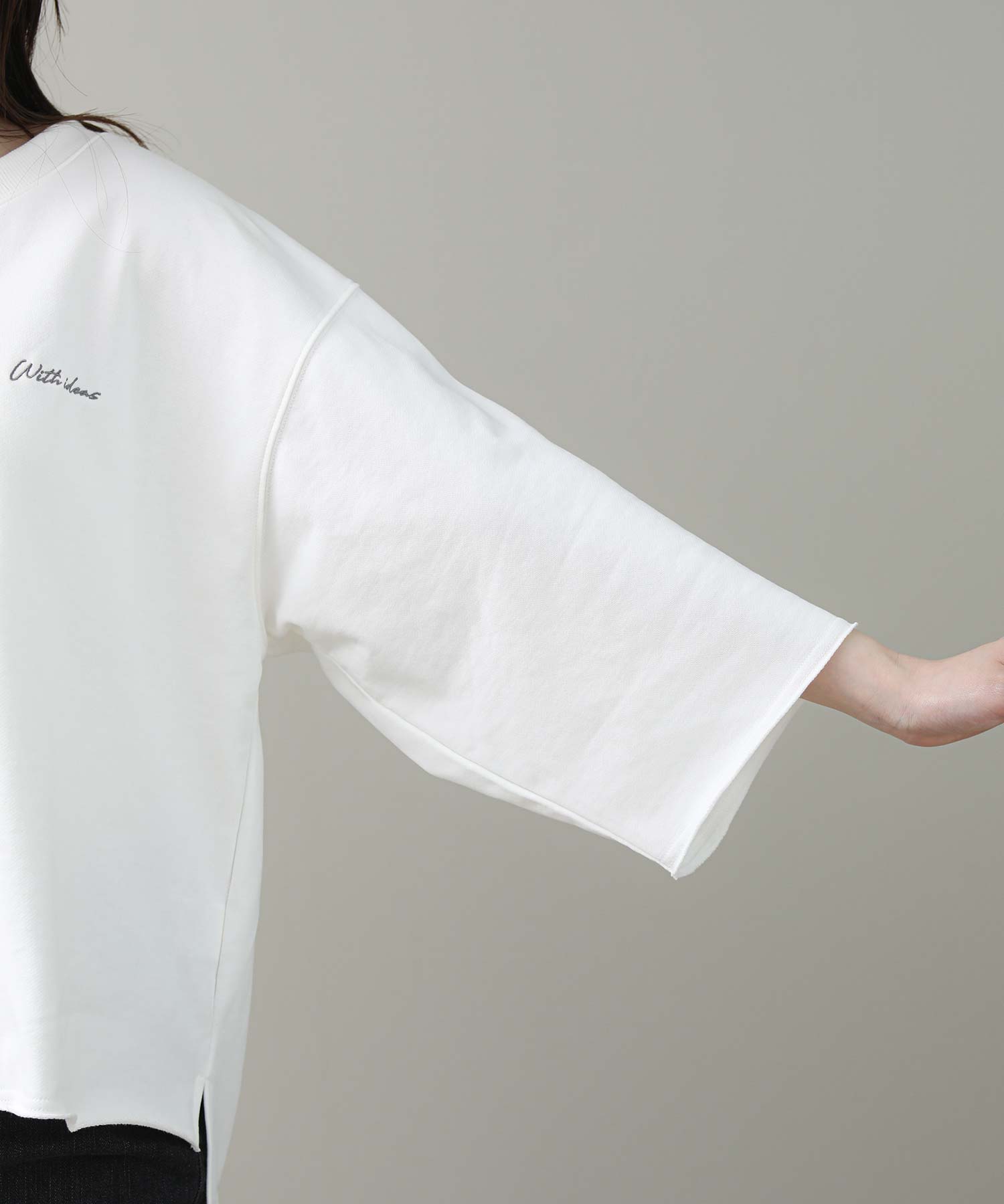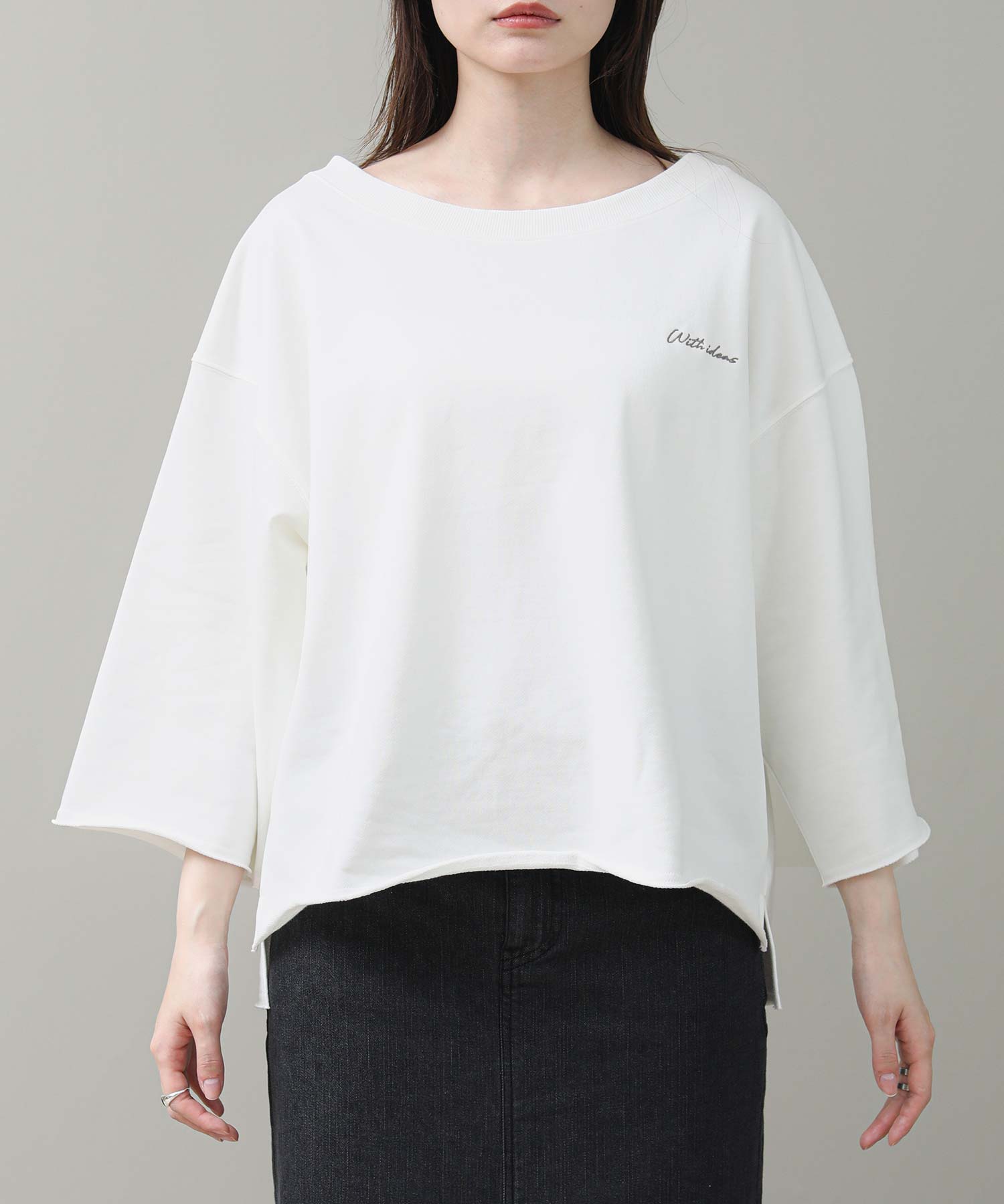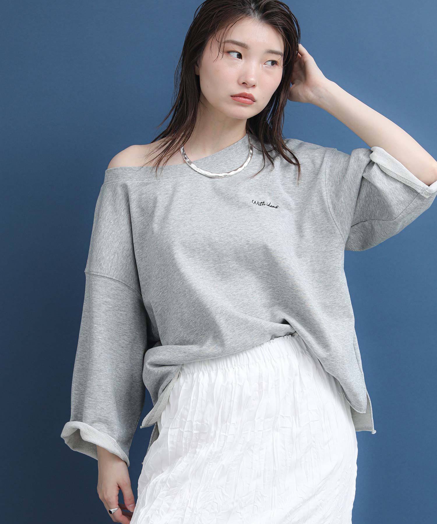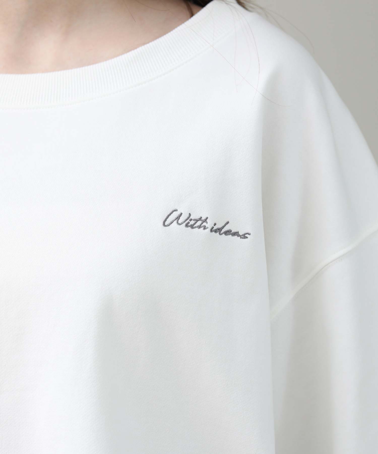 リジョイスのアイコンでもあるオフショルデザインをミニ裏毛のカジュアルトップスに落とし込みました。