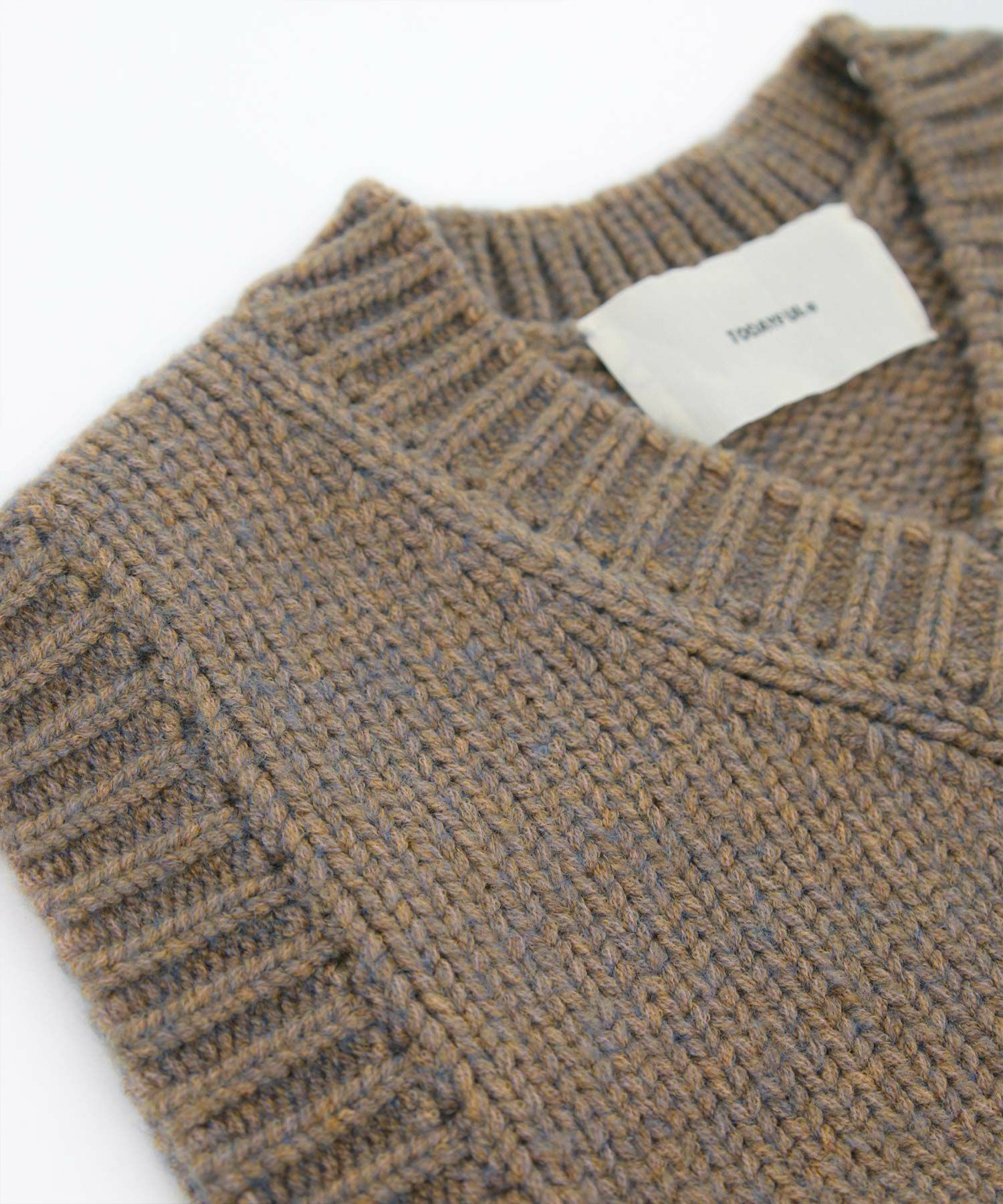 メランジの糸を使用して編んだニットベスト。