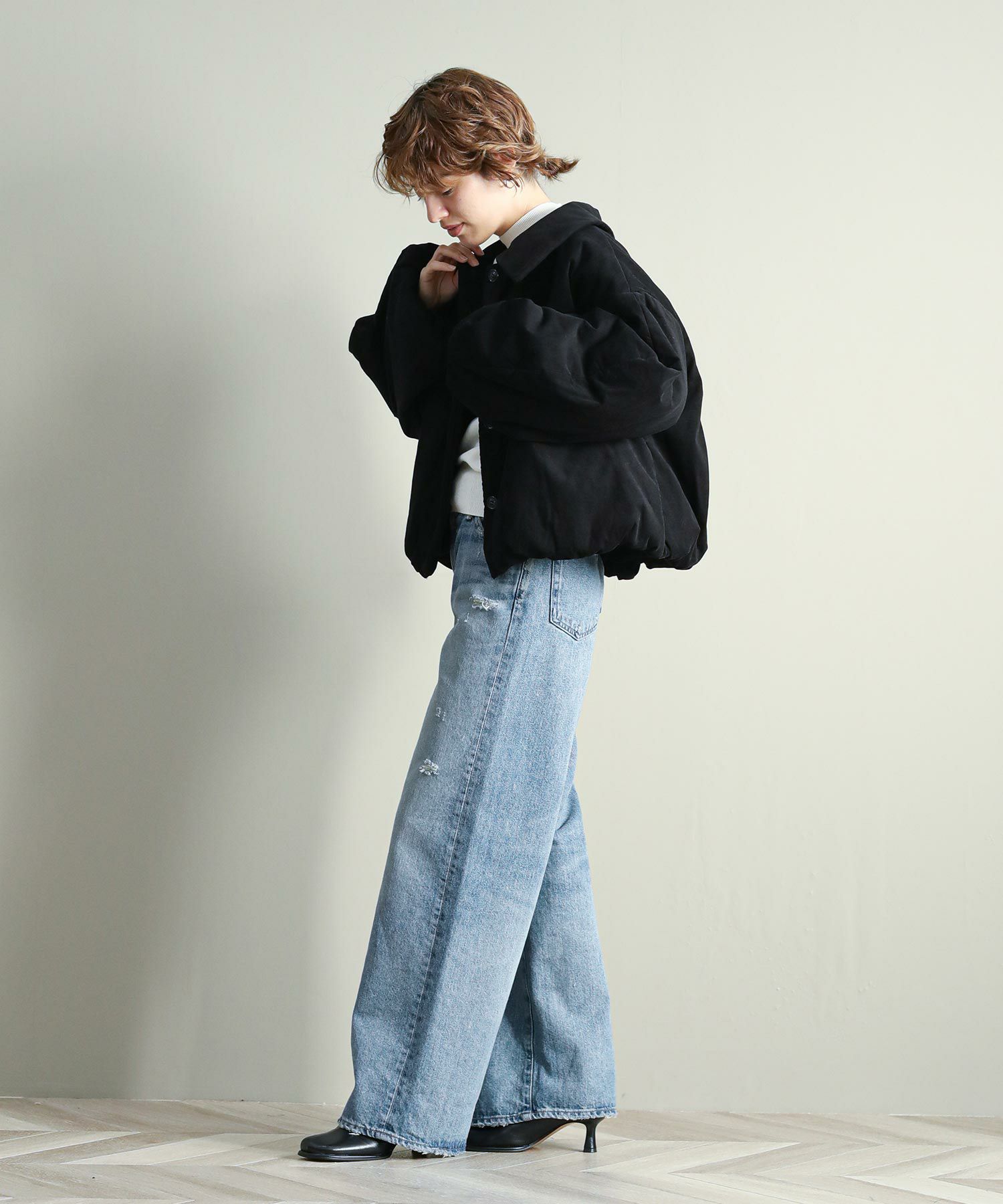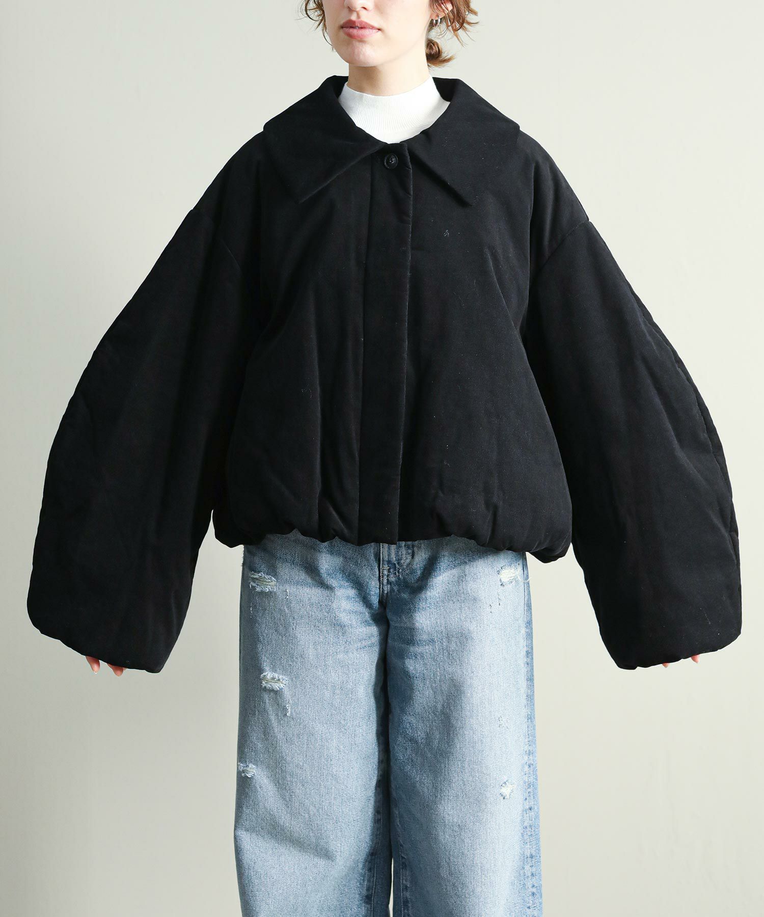 中綿入りなので軽量かつ通気性もありながら保温性にも優れており、気温の下がるこれからの季節にぴったりです。顔まわりを華奢に見せる大きめの襟と、MANOFらしいラウンドした袖のシルエットがポイント。裾と袖口のギャザーがニュアンスあるディテール。比翼仕立てで可愛らしくなりすぎず、大人っぽいスタイリングにマッチするデザインです。ショート丈なのでボリュームのあるワイドパンツやカーゴパンツ、ワンピースにも合わせやすいバランスで、ロングシーズン着用していただける一着です。