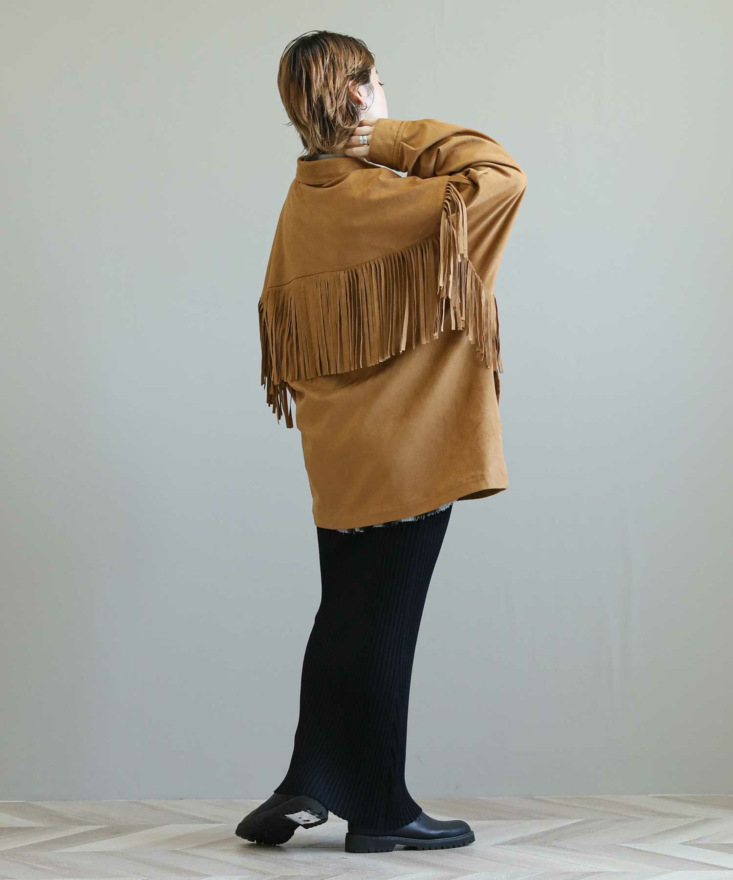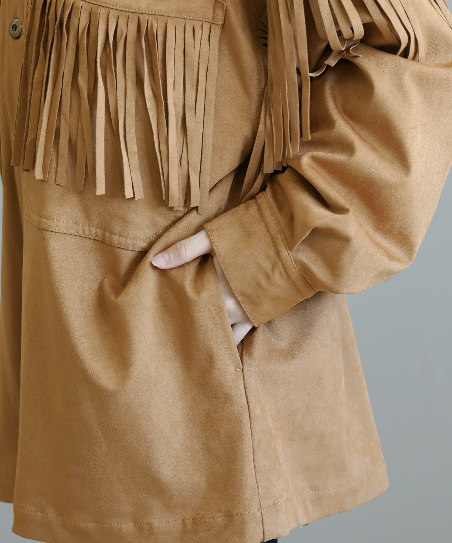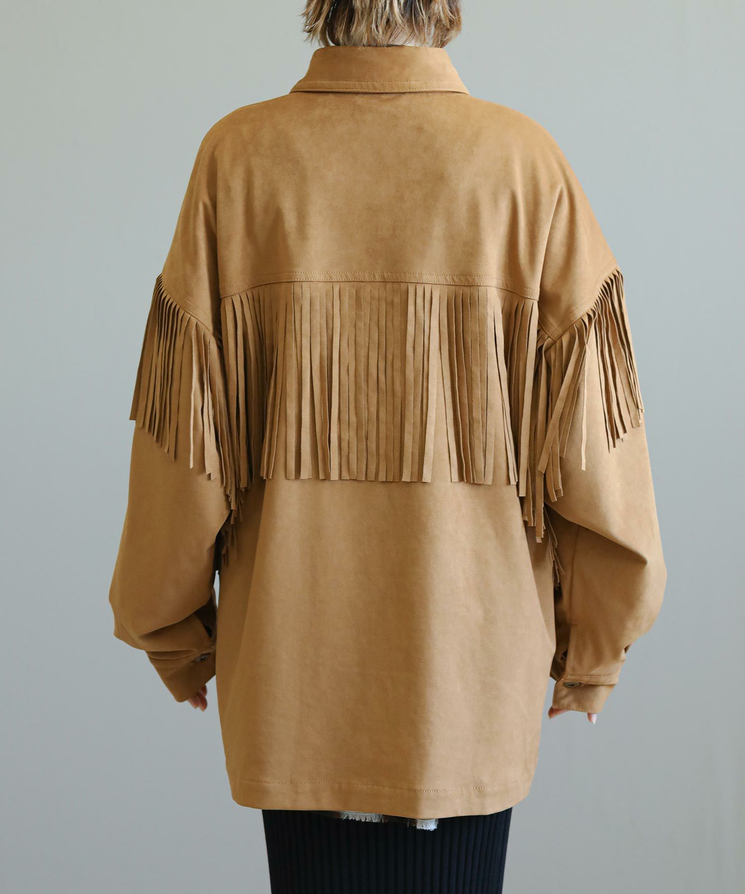 フリンジがアクセントになったスエードライクなシャツジャケット。