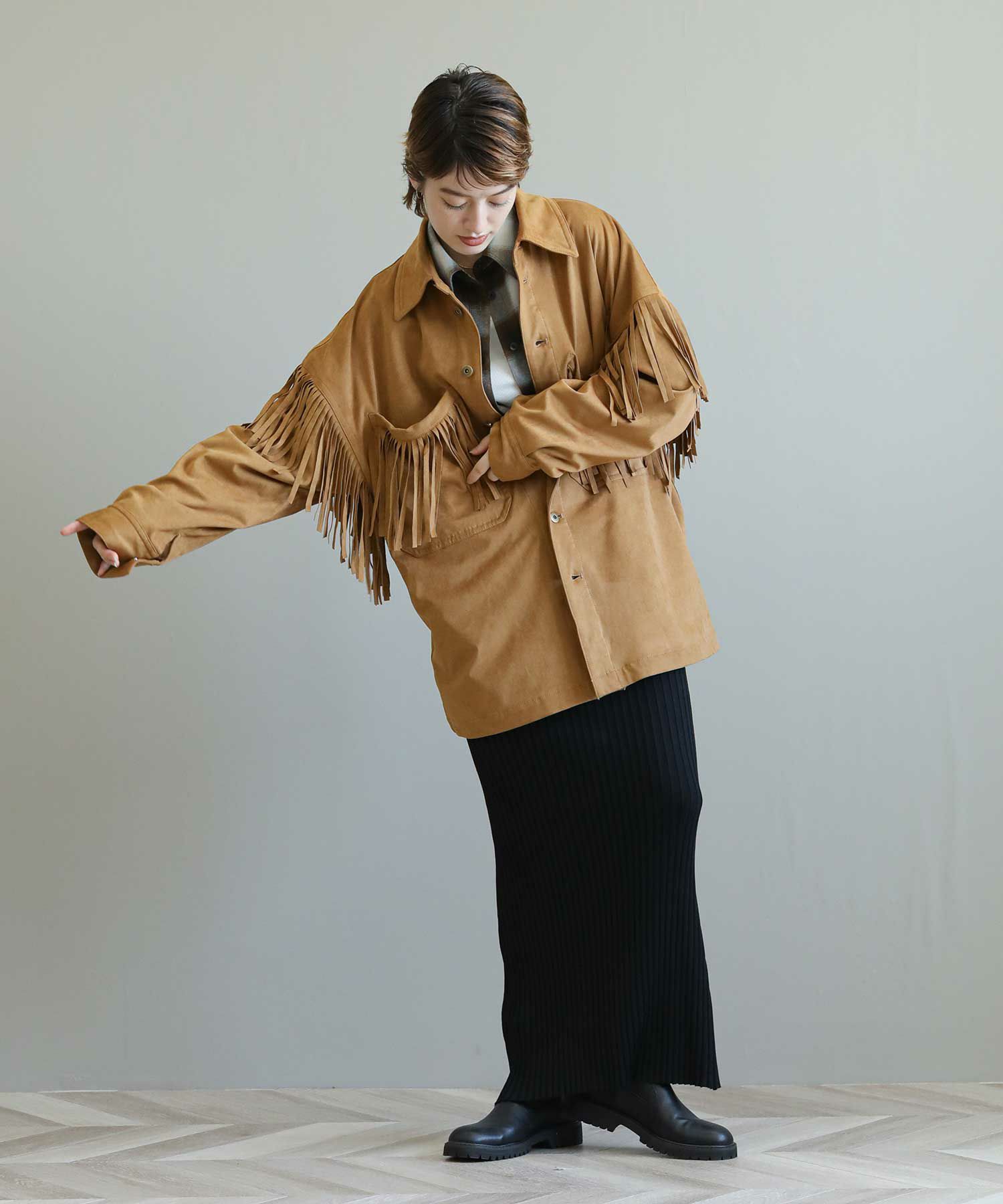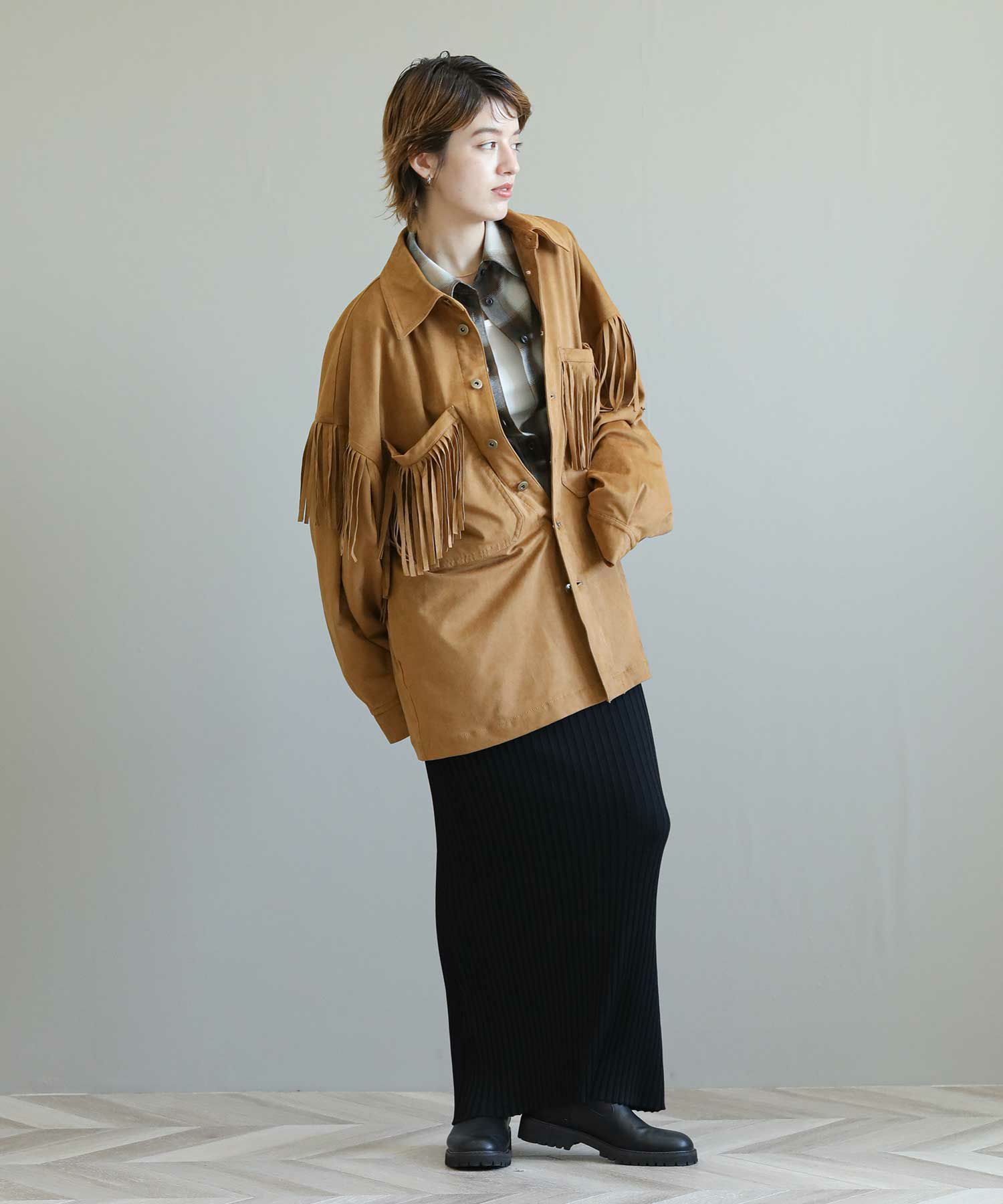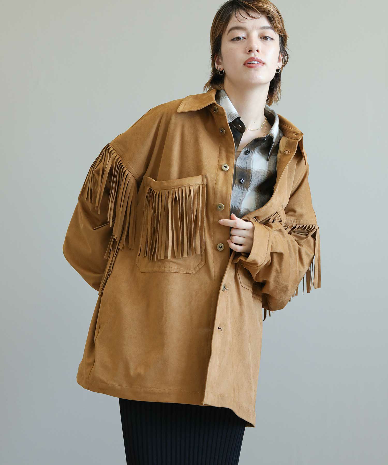 フリンジがアクセントになったスエードライクなシャツジャケット。