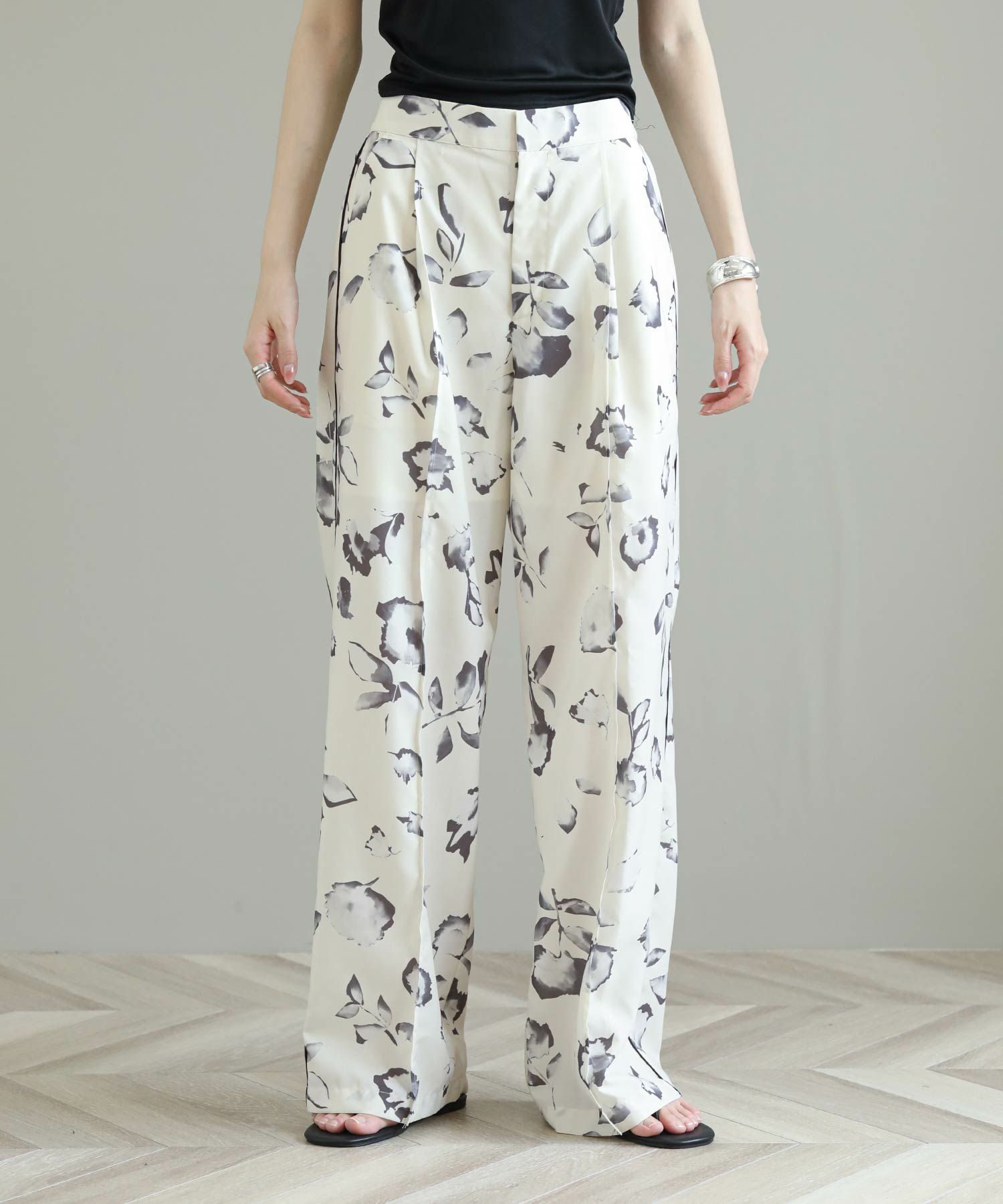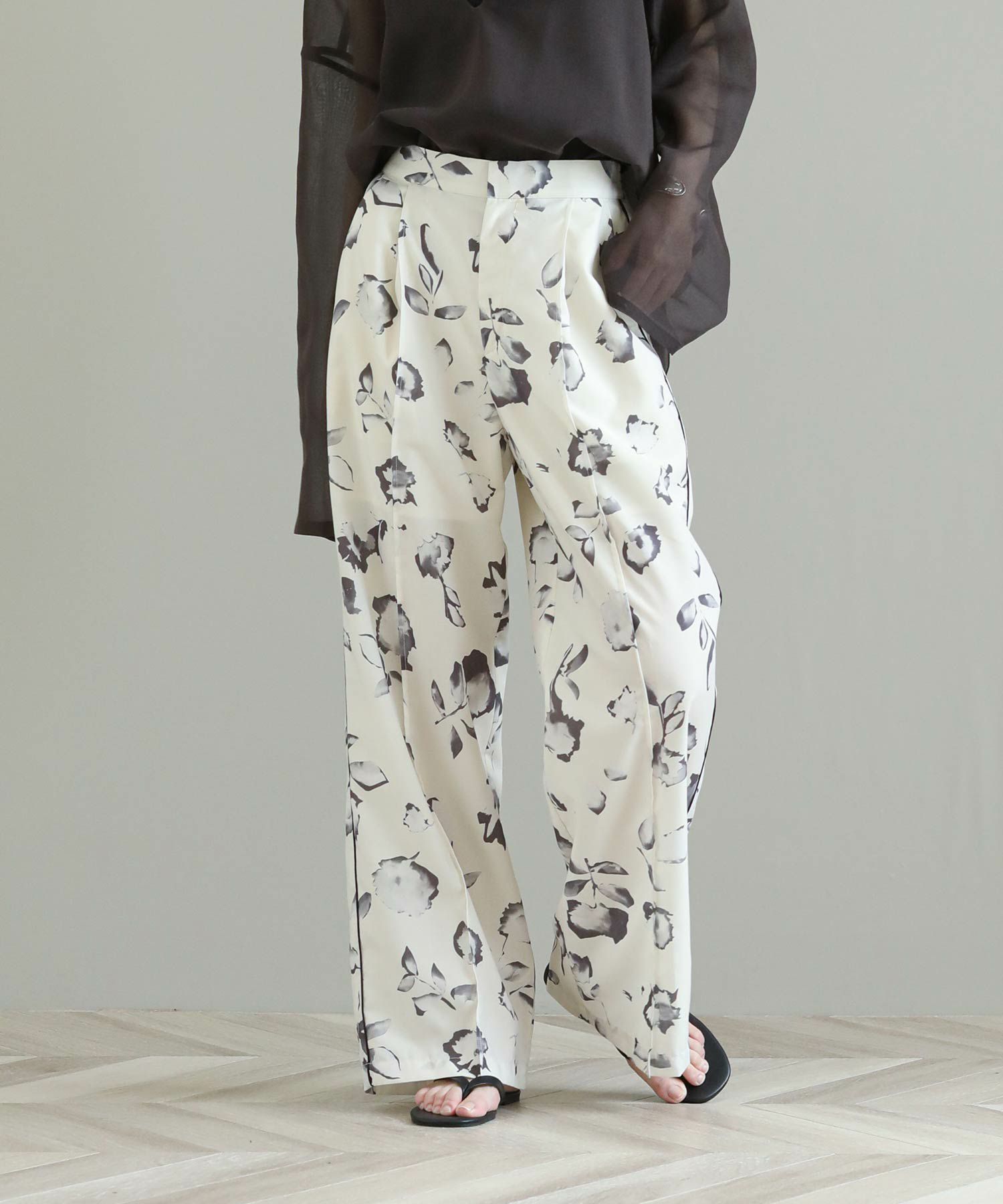 シックな色合いの滲んだフラワーモチーフのパンツ。