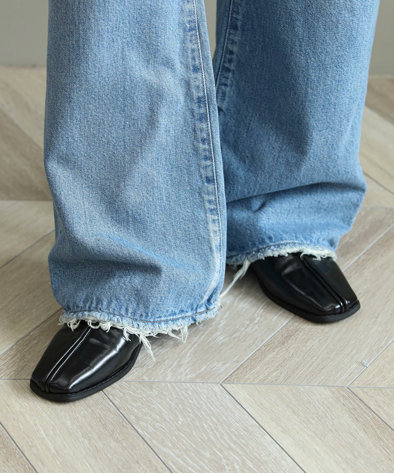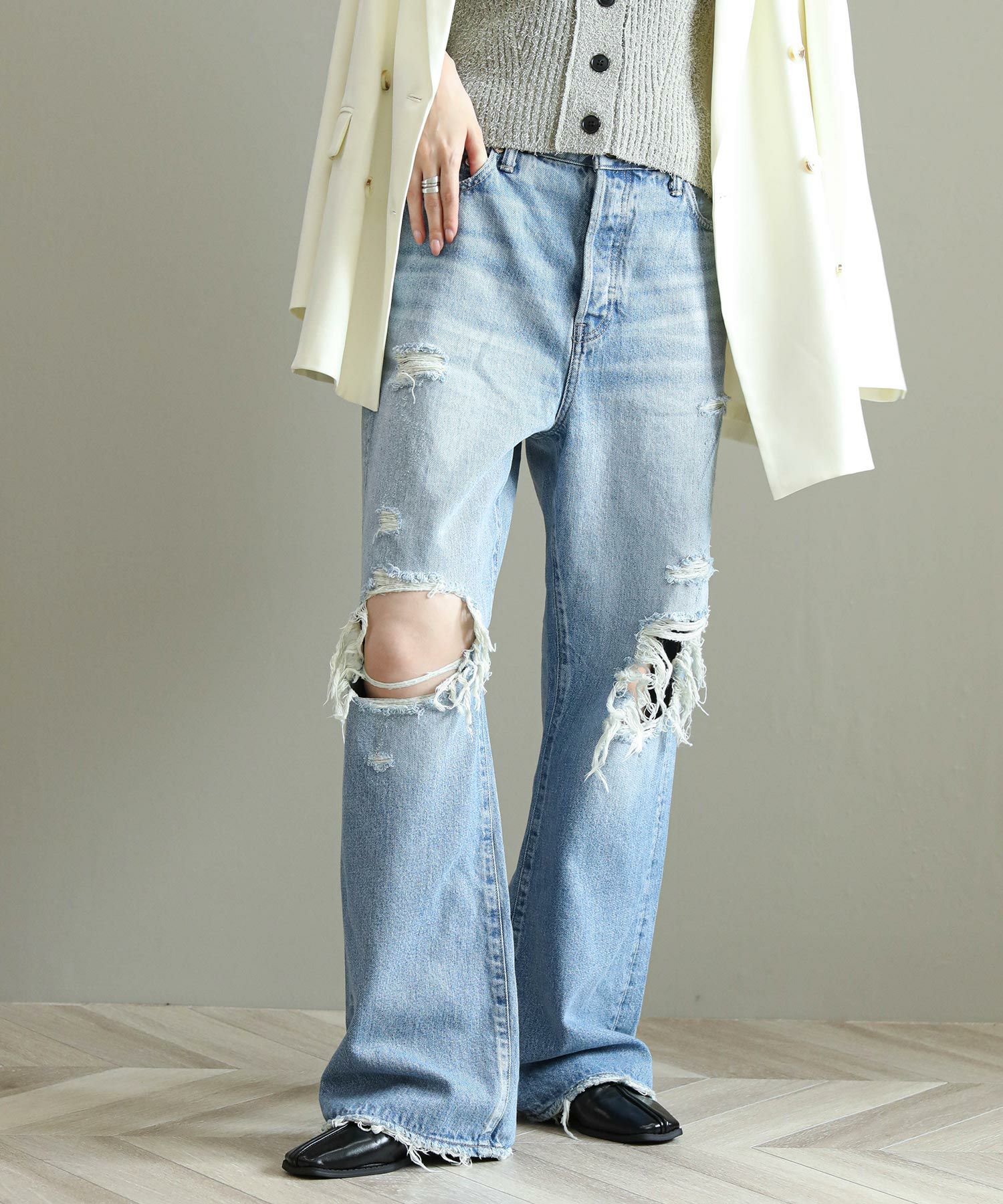 一般的なブーツカットと比べ膝の絞りが少なく、裾への広がりも緩やかな為、ストレートとワイドの中間のような着用感が特徴。ウエストは少し大きめの設計にしており、腰上で留まってヒップからワタリにゆとりをもたせることでリラックスな印象に。またウエスト位置で絞って履いてもキレイなラインが出るので着こなしに幅があるアイテムです。大胆なダメージ加工がトレンド感もあり、スタイルの巾が広がります。