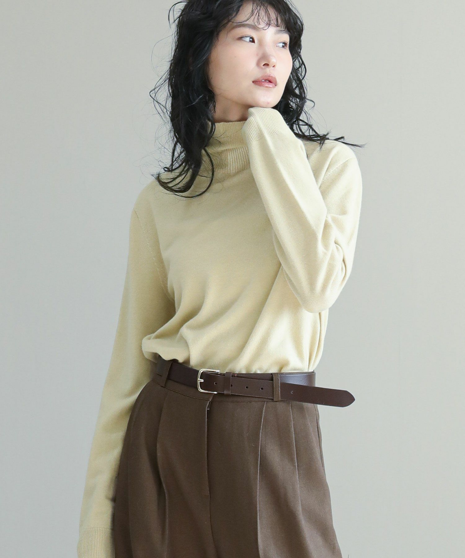滑らかな肌触りのウールカシミヤ糸で編み上げたタートルニット。