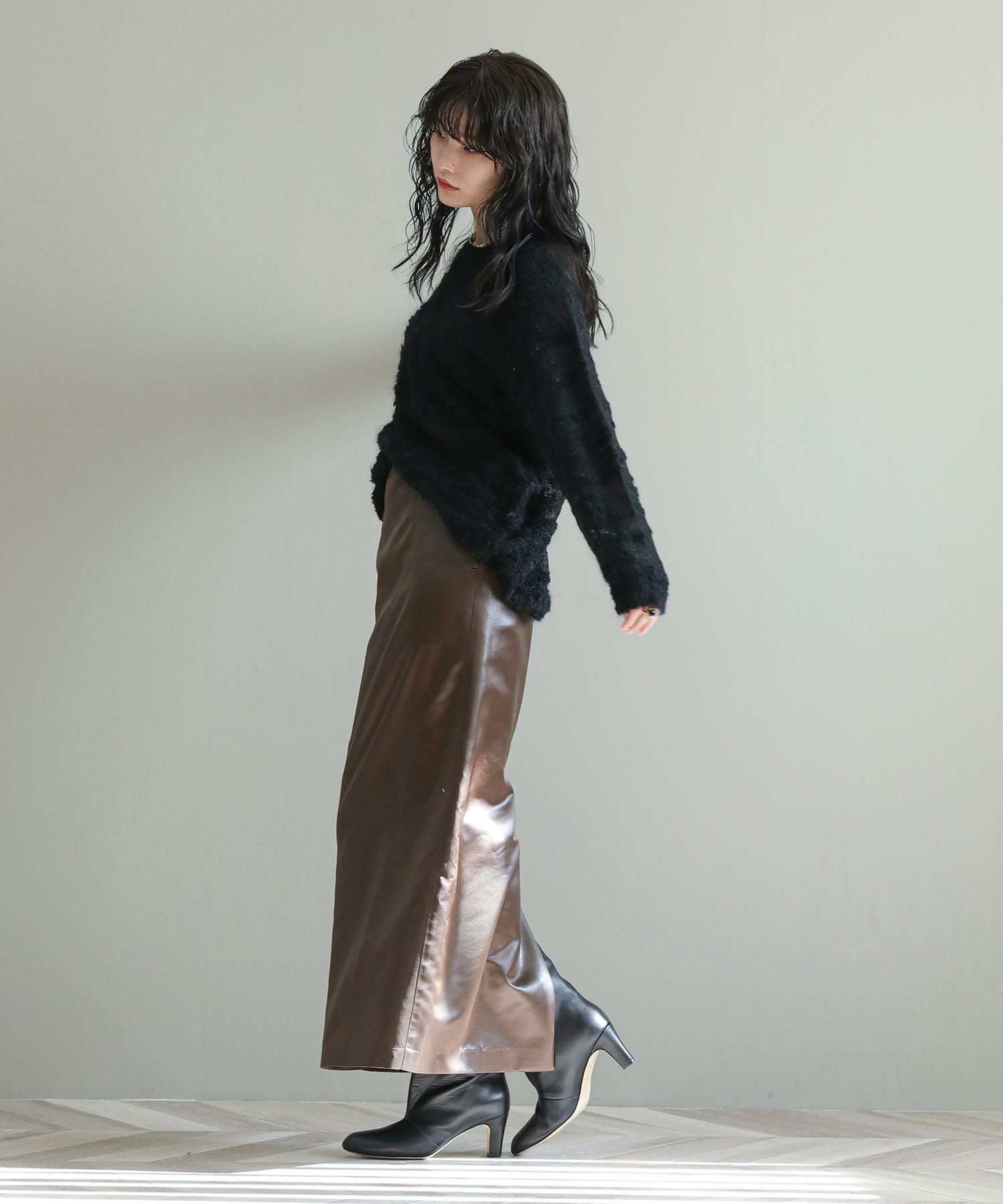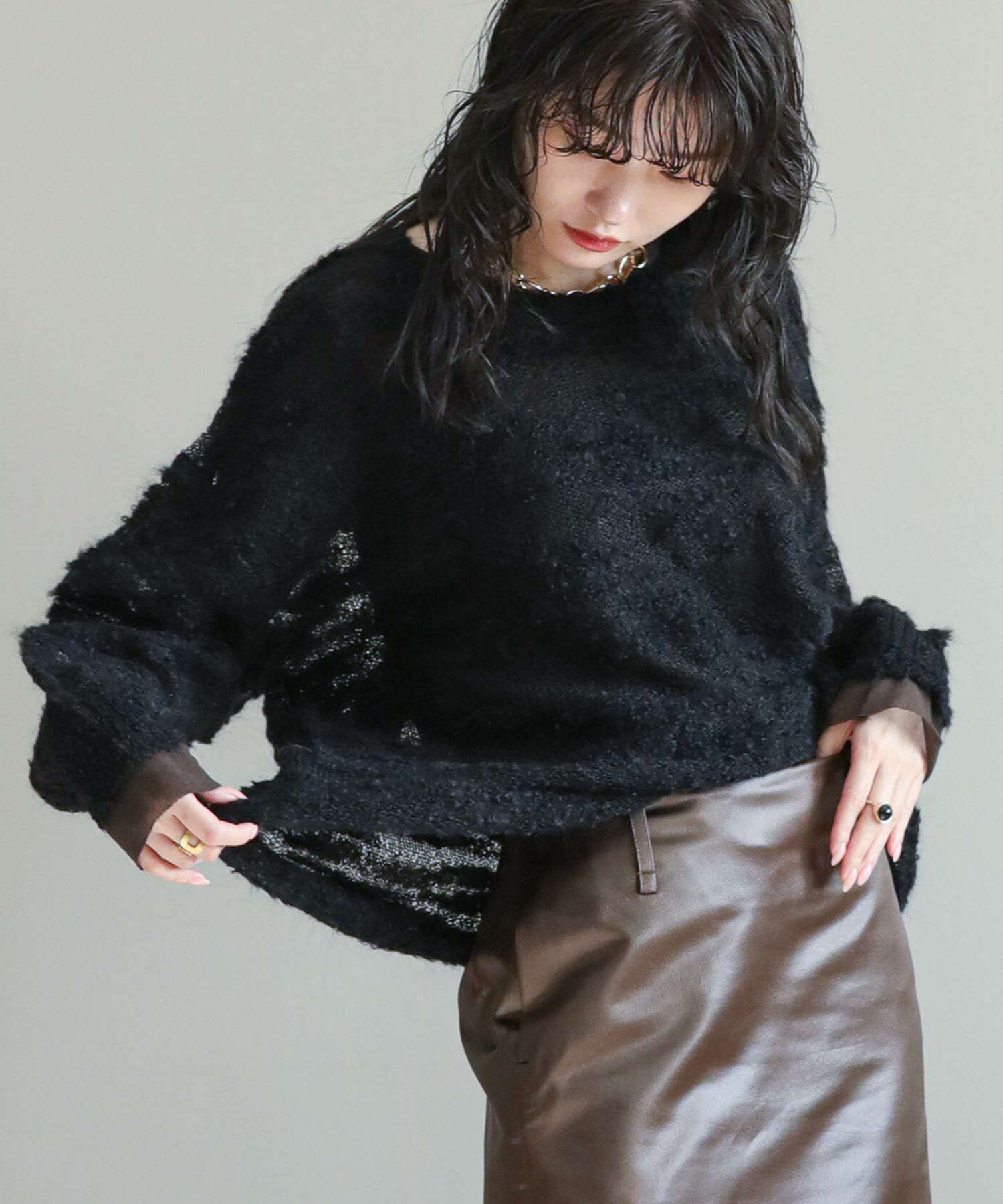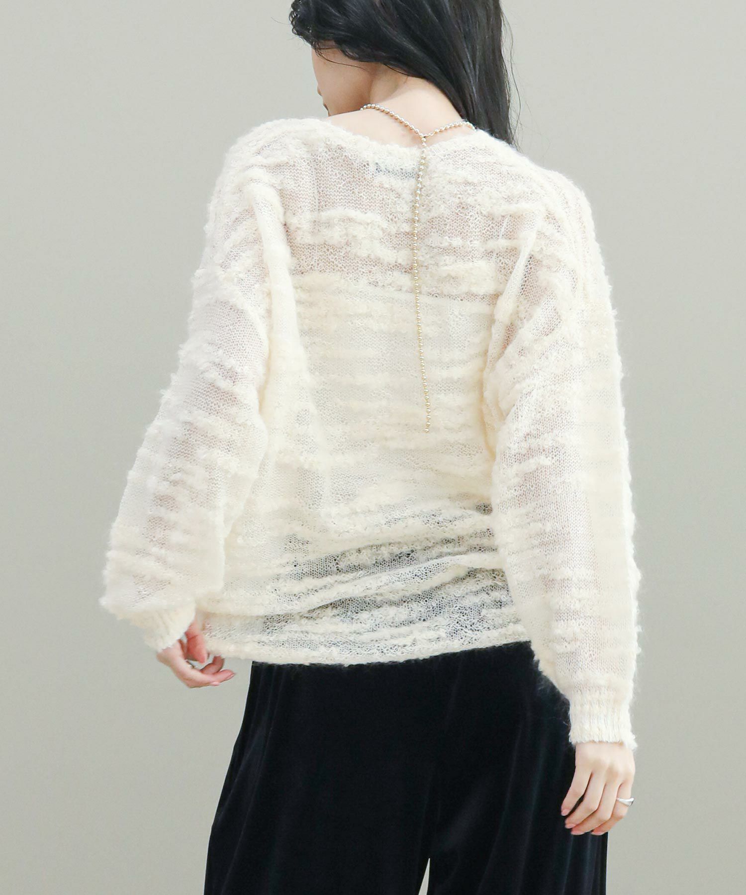 糸の繊細さやループ感を引き立てるためにざっくりとシアー感のある編地に仕上げています。ゆったりとしたサイジングに仕上げているので、シアー感を活かしたレイヤードスタイルを楽しんでいただけます。