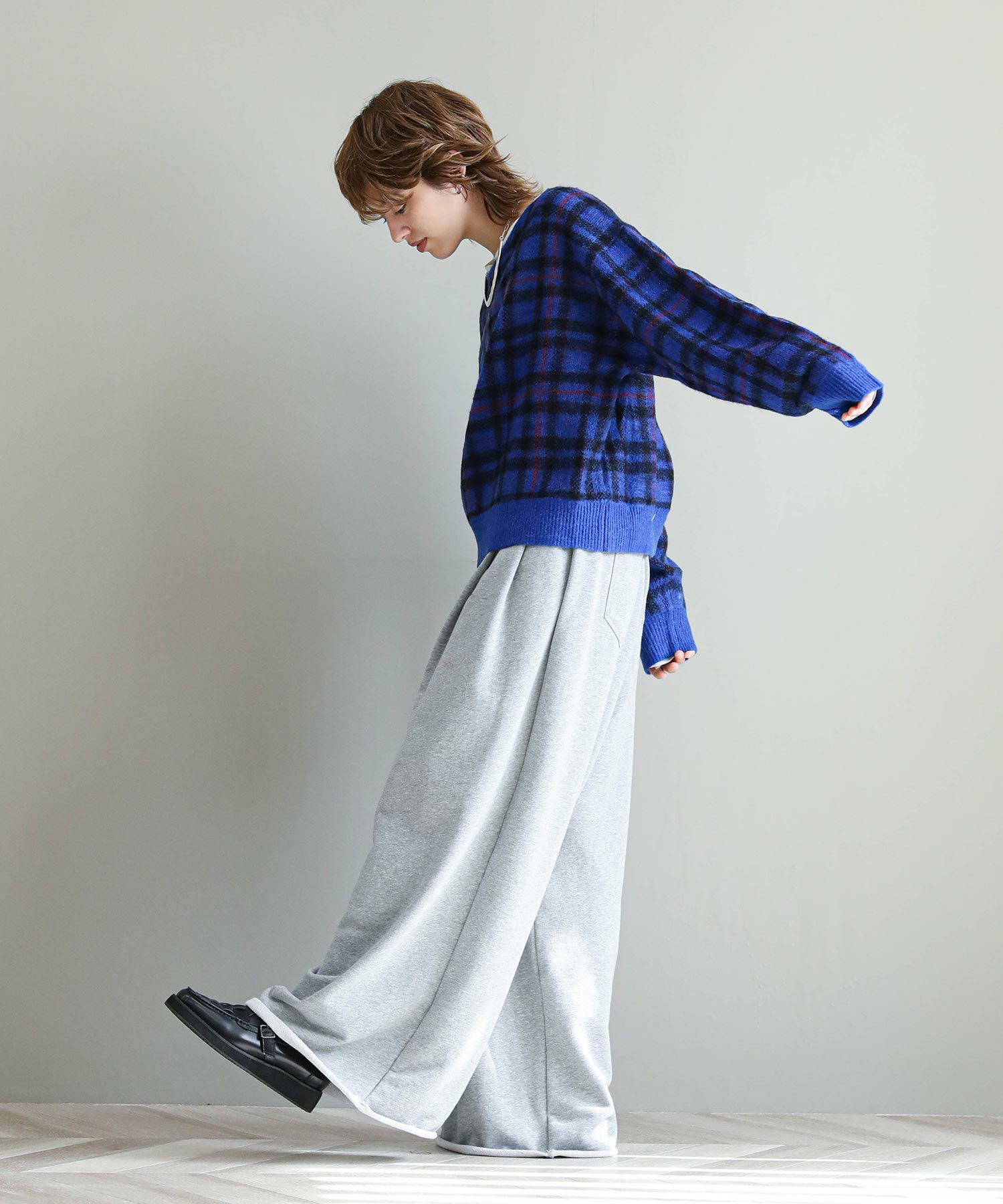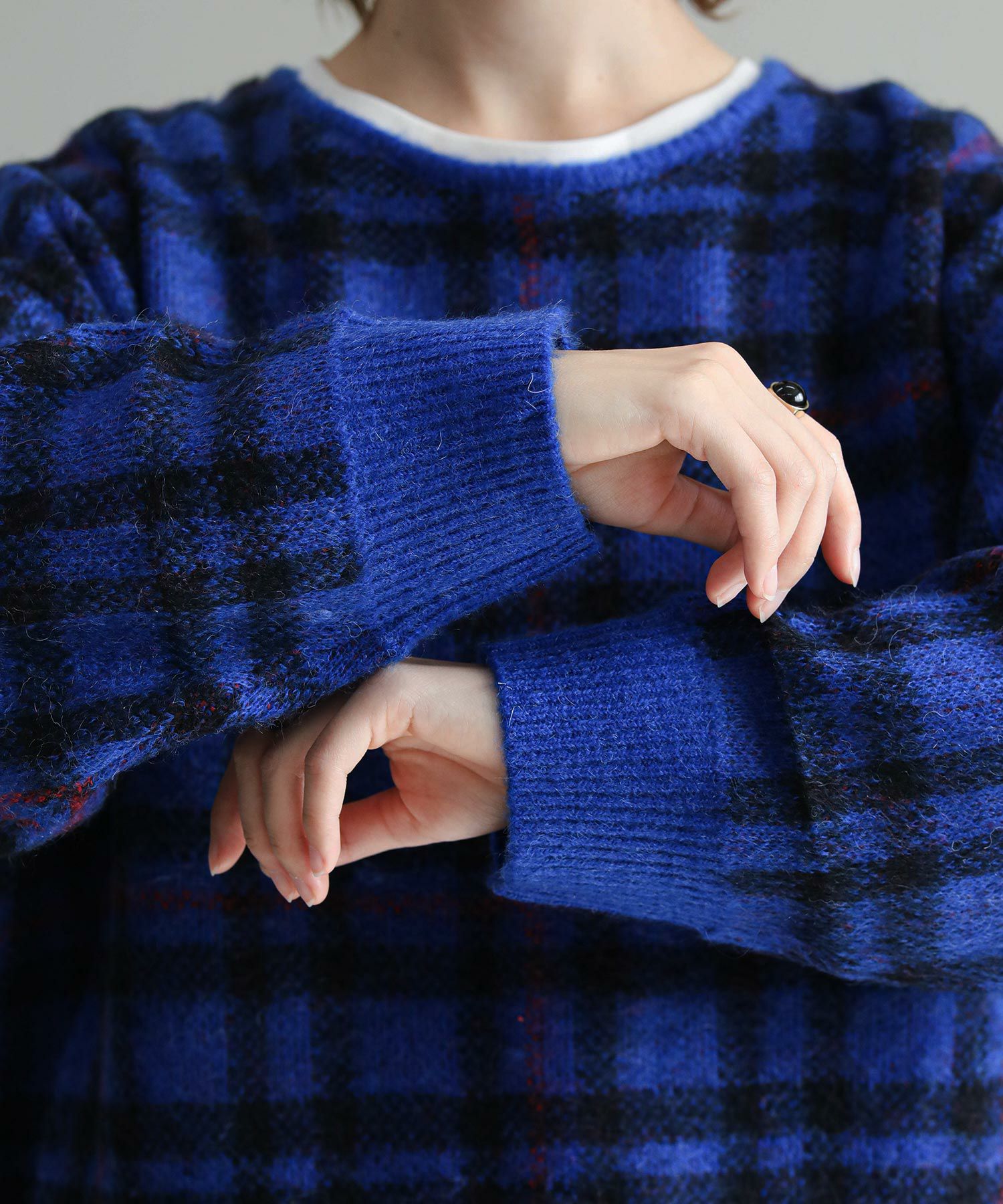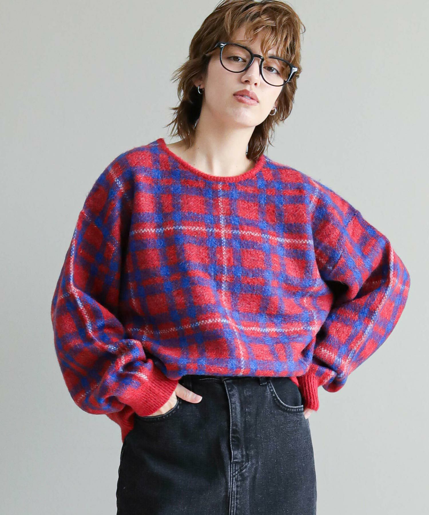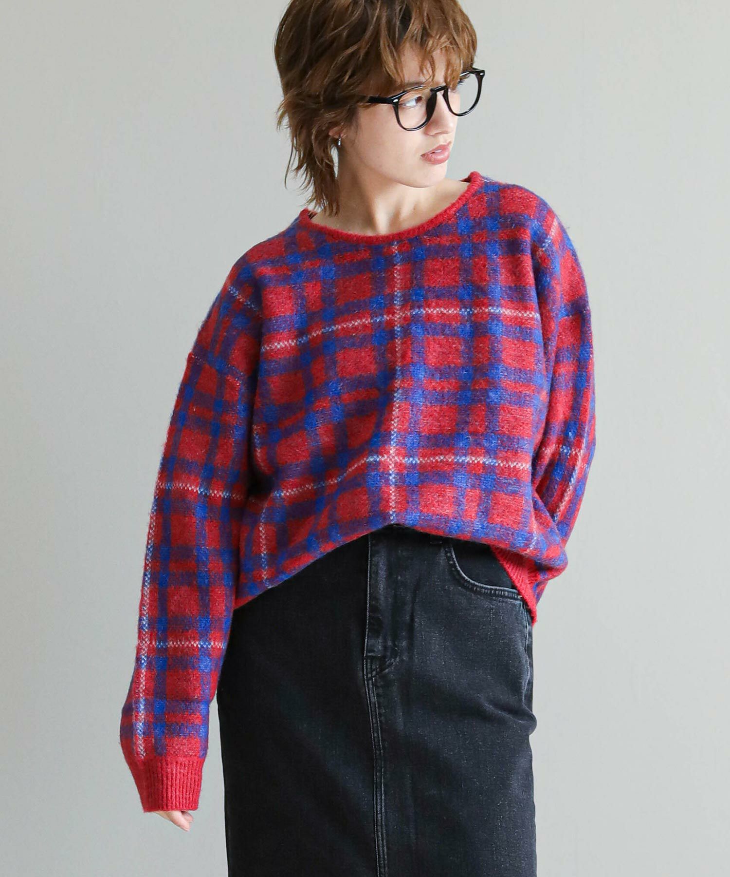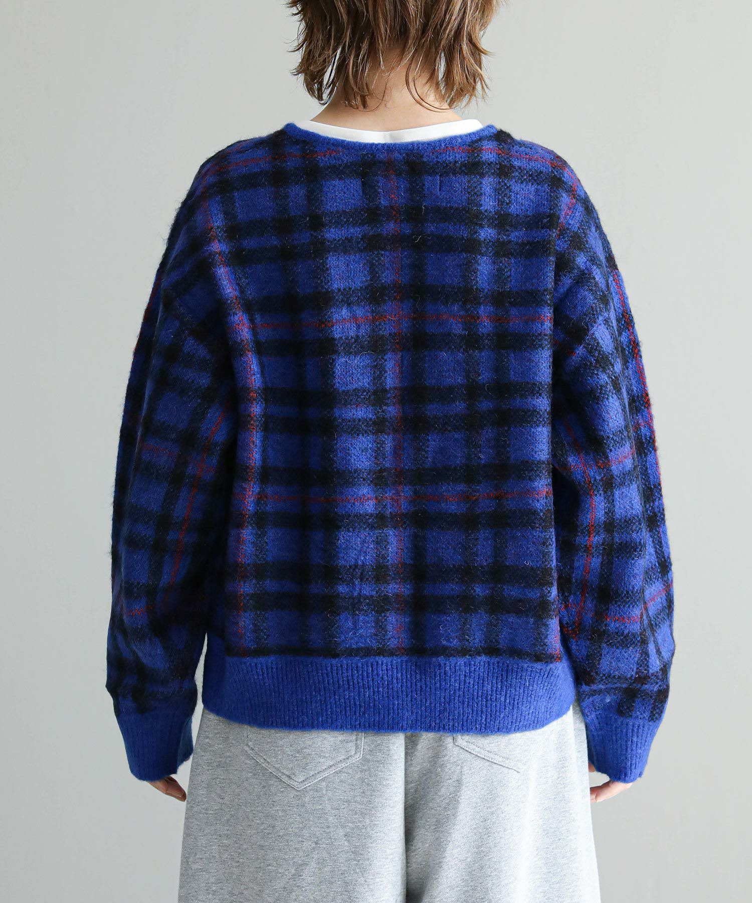 モヘアとウールの上質な光沢と柔らかな風合いが魅力。7ゲージの心地よい肉厚感とダブルジャガードによる表情豊かなチェック柄。また、手洗いも可能でデザイン性と機能性を両立した他にないアイテムです。スラックスやレザーボトムなどと合わせるとトレンドライクな着こなしに。