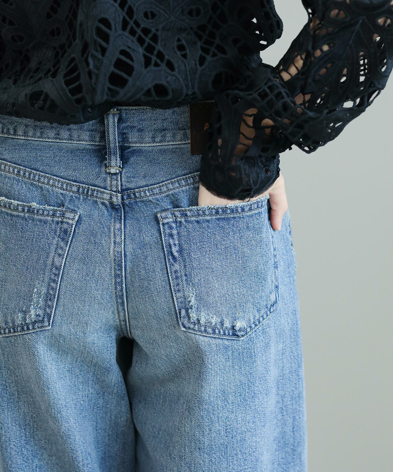 The rejoiceの別注デザインです。ヴィンテージライクな風合いやダメージのバランスに拘っています。ヒップにかけてコンパクトな設計になっている為、ワイドながらルーズさはなく上品なシルエットが特徴。さりげないダメージ感がどんなアイテムにもマッチし飽きないデザイン。今のムードにぴったりのローライズもポイントです。