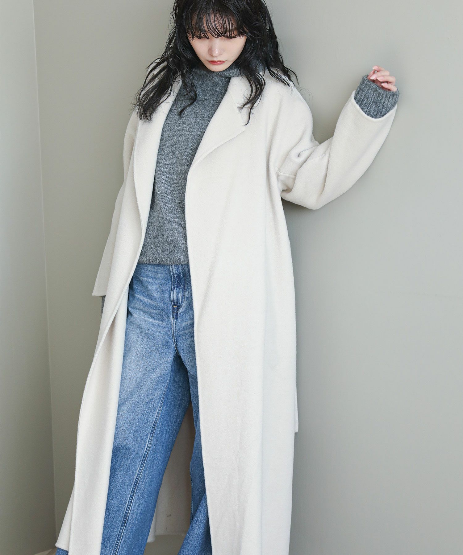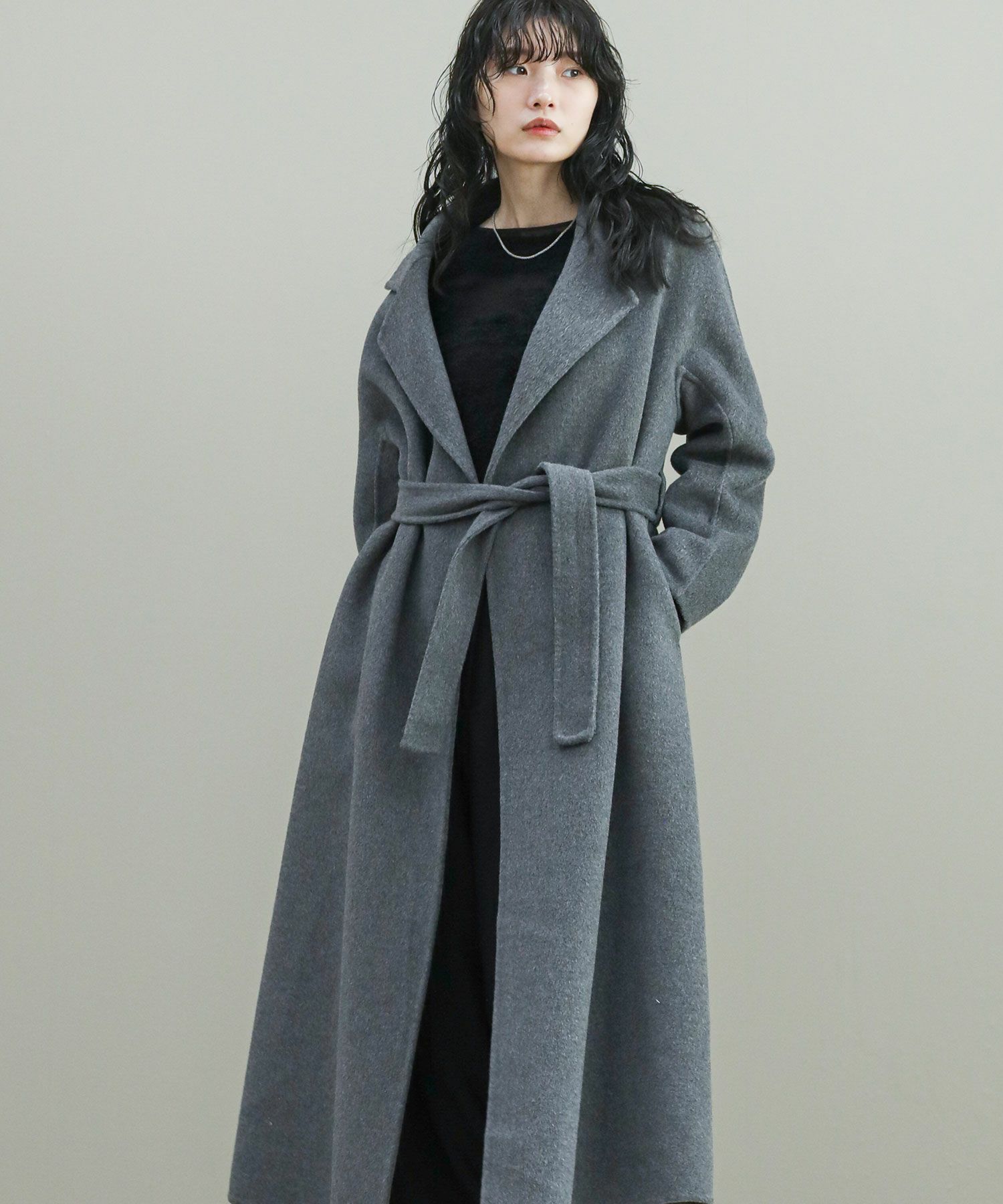 ロング丈がモードで大人な印象です。ロング丈ですが、肩回りがすっきりとしているのでバランスが取りやすくスタイルアップ効果も◎ベーシックなデザインと色展開で着回しも楽しめます。ベルトを外して、ばさっとラフに羽織っても、こなれ感アップ◎