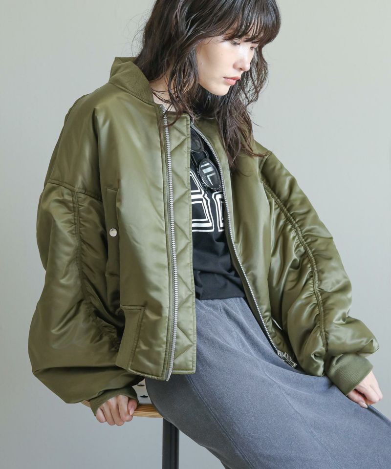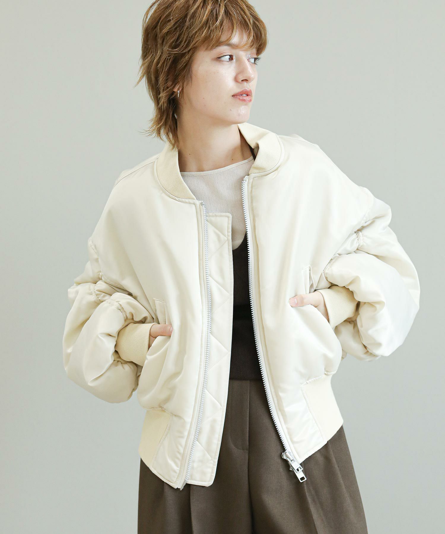 着丈と袖のバランスがポイント。さっと羽織るだけでスタイルが決まります。重厚感のあるファスナーやヘビーなリブなどMA-1らしさに拘りながらも女性らしいスタイルにマッチするシルエットです。今シーズンはライトベージュとカーキの2色。重くなりがちな秋冬スタイルを軽やかに仕上げてくれます。