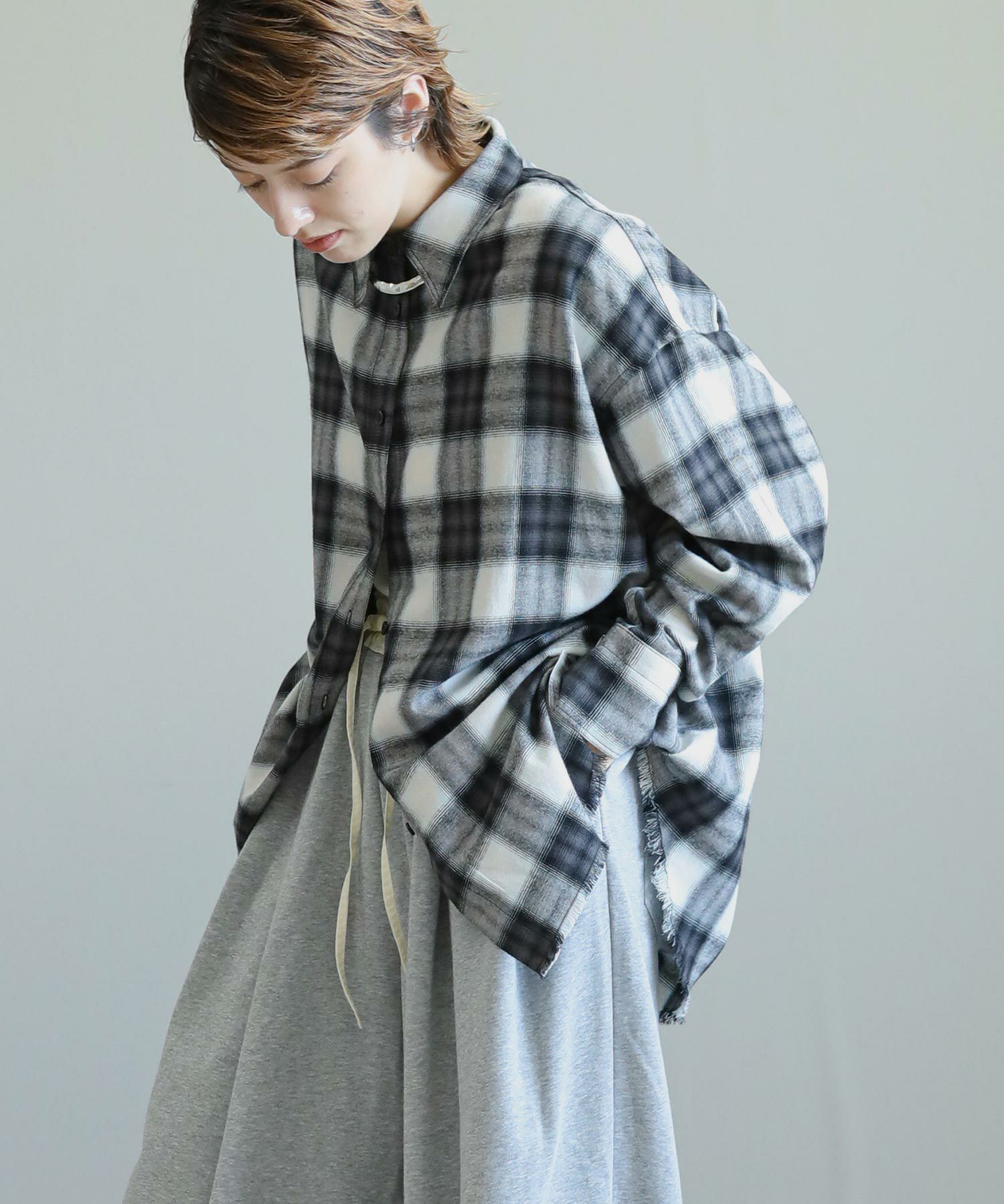 裾を裁ち切りにし、抜け感をプラス。釦をあけても閉めても綺麗に着られるよう、サイジングや衿の形にこだわりました。トレンドのブラウンと定番のブラックの2色展開です。男の子っぽくならないよう、スカートスタイルに
