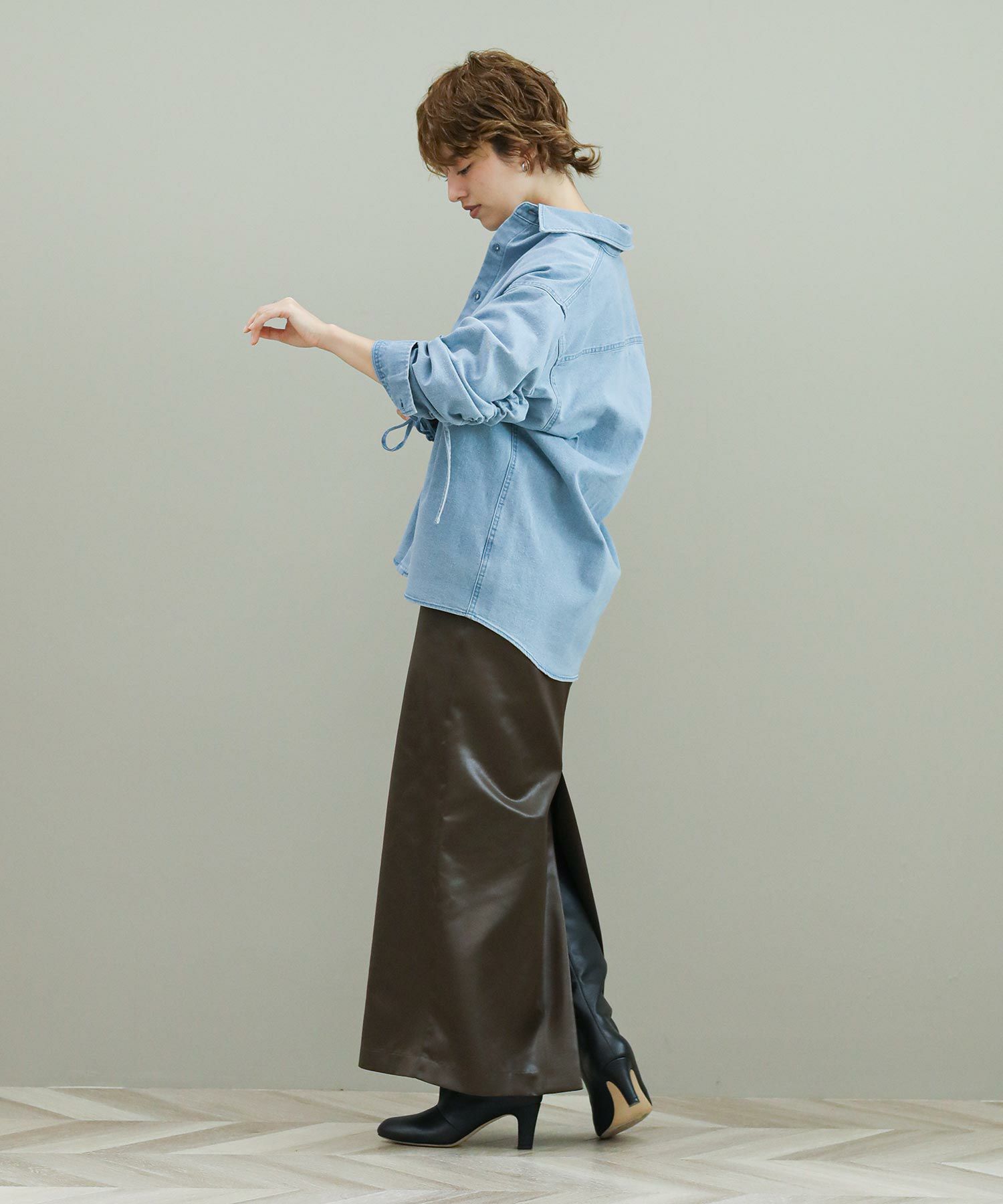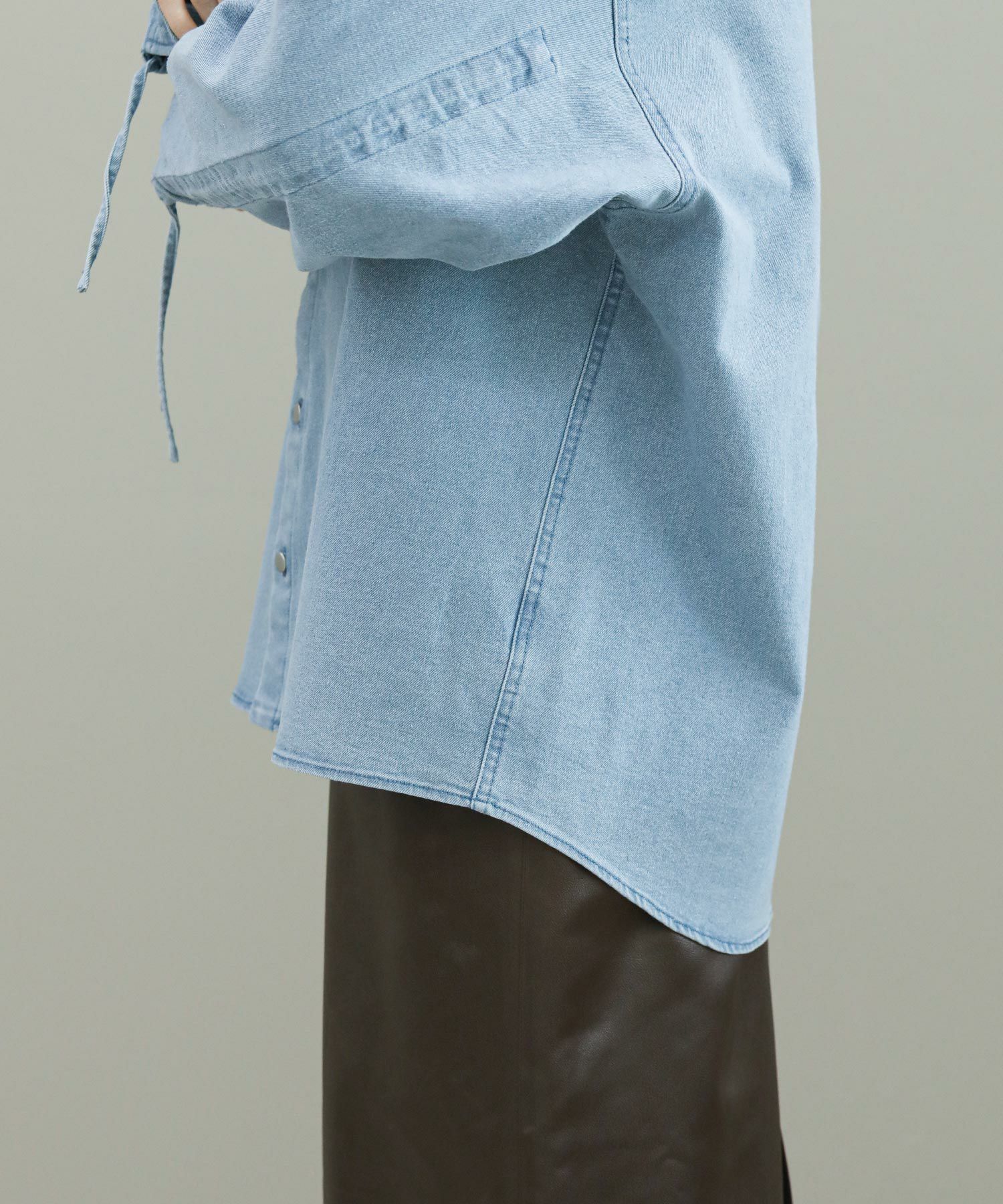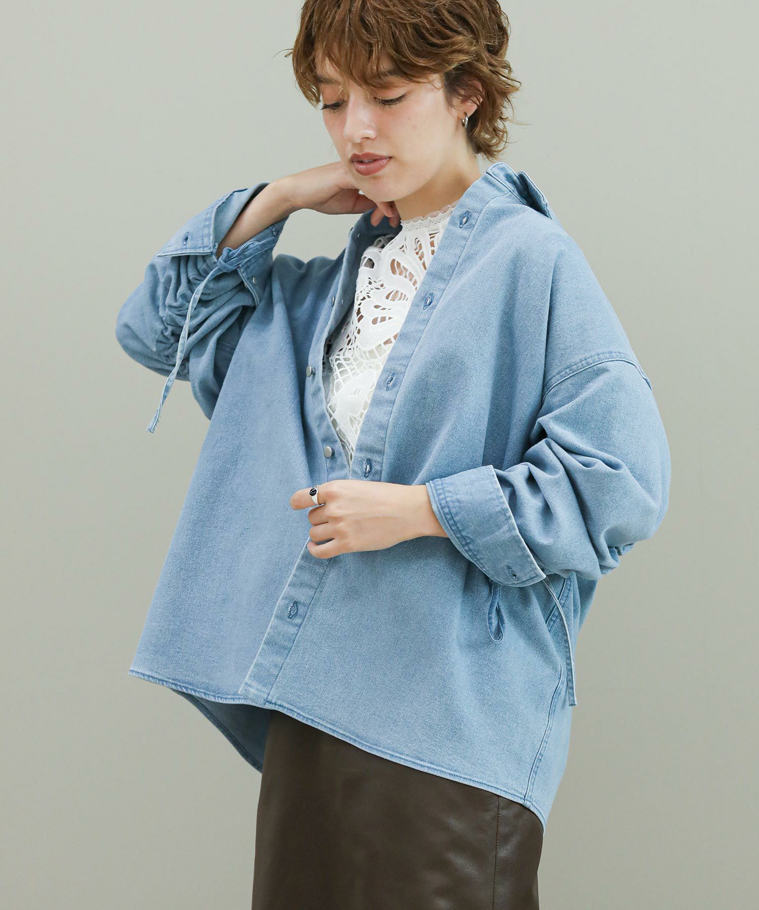 袖のドローコードでシャーリングを作り、袖のフォルムをアレンジできます。程よい肉厚のデニム生地がジャケット代わりにも。デニムはブリーチとボールバイオ加工でヴィンテージライクな風合いに仕上がっています。