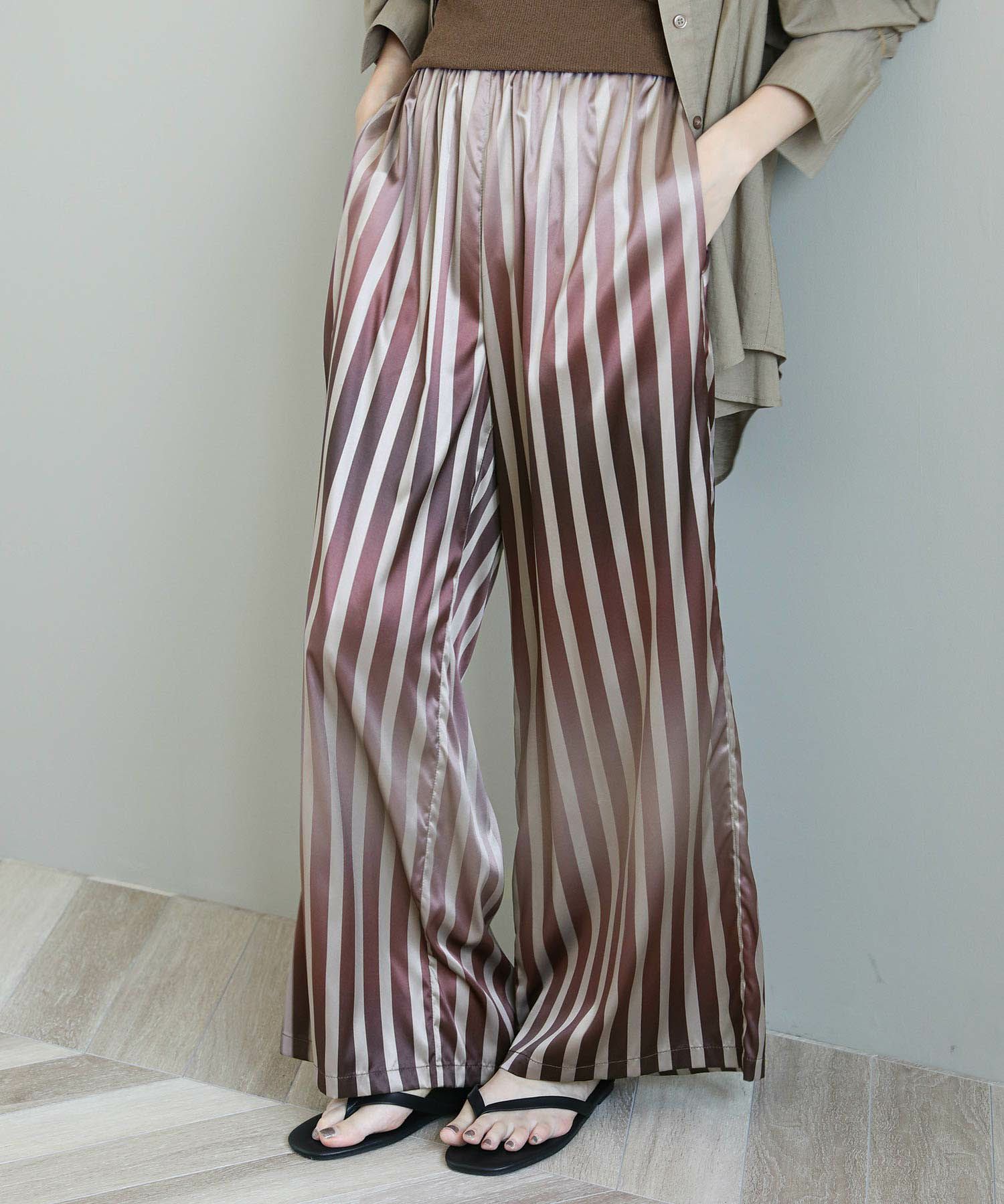 ストライプ柄がすっきりとした縦のラインを強調してくれます。柔らかくしなやかな素材感で脚のラインを自然に拾わないのも嬉しいポイント。上品な光沢感が際立ち女性らしい雰囲気を引き立ててくれます。着心地も良く、華やかなシーンにもデイリーにも使いやすい万能な生地感です。