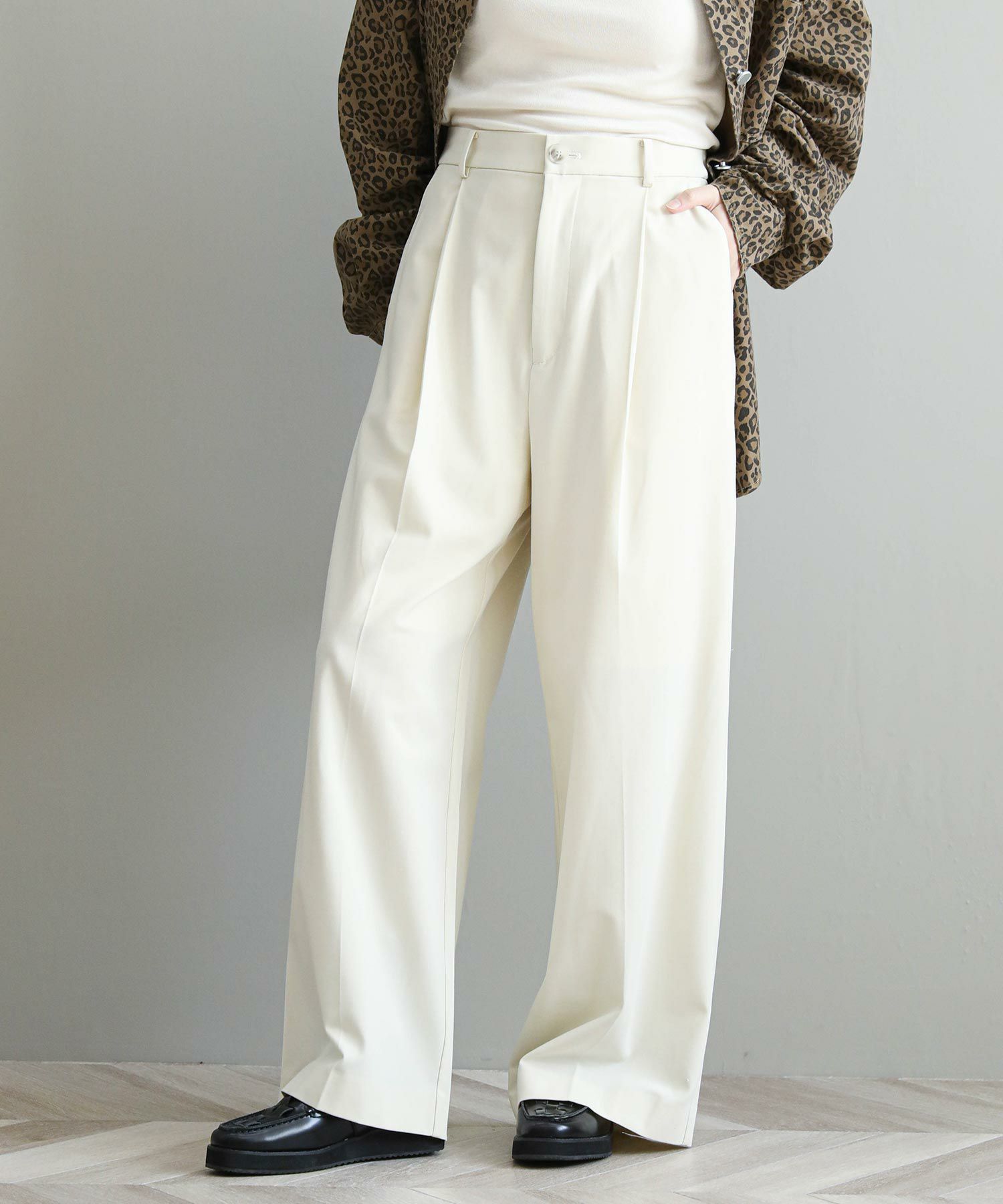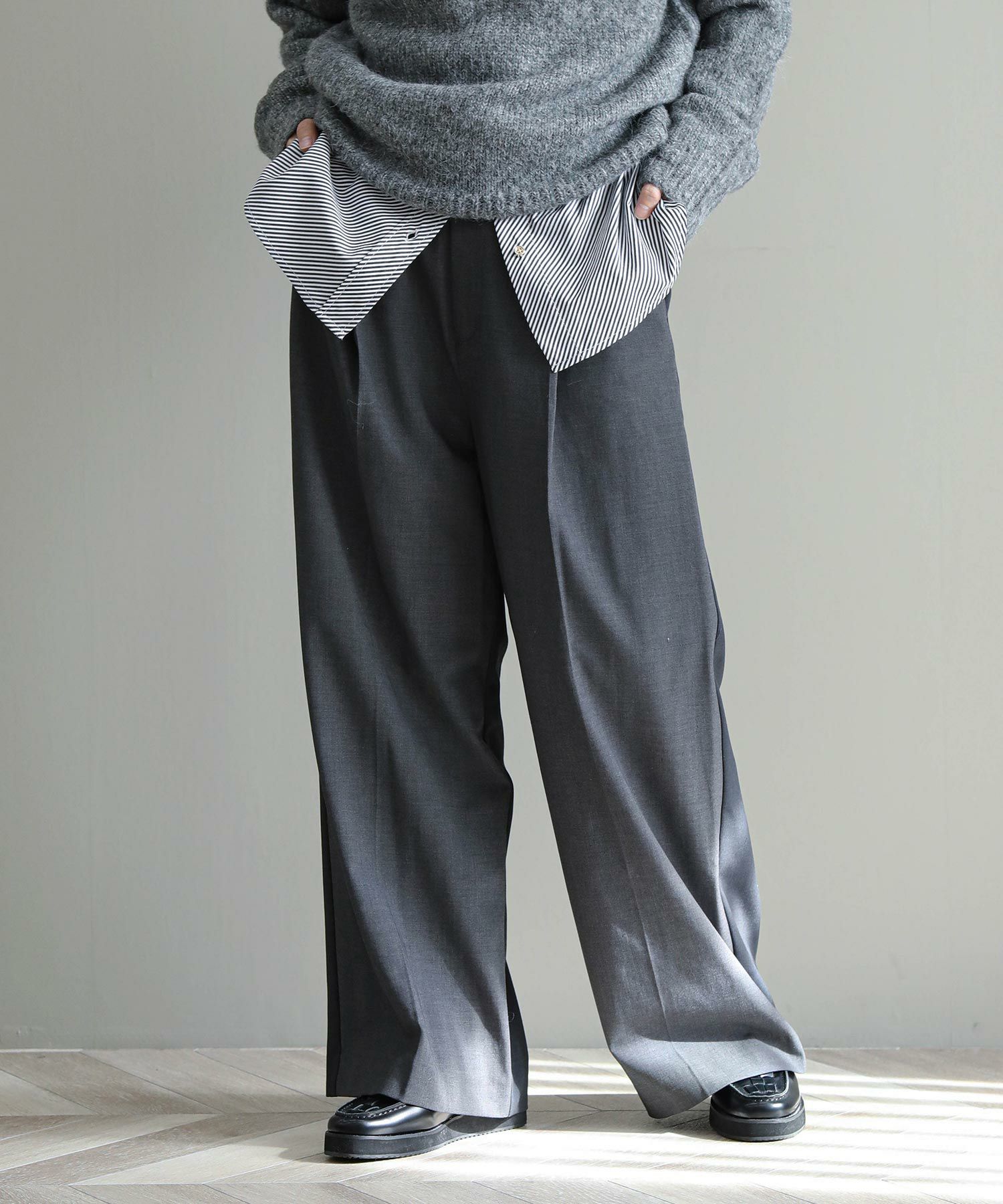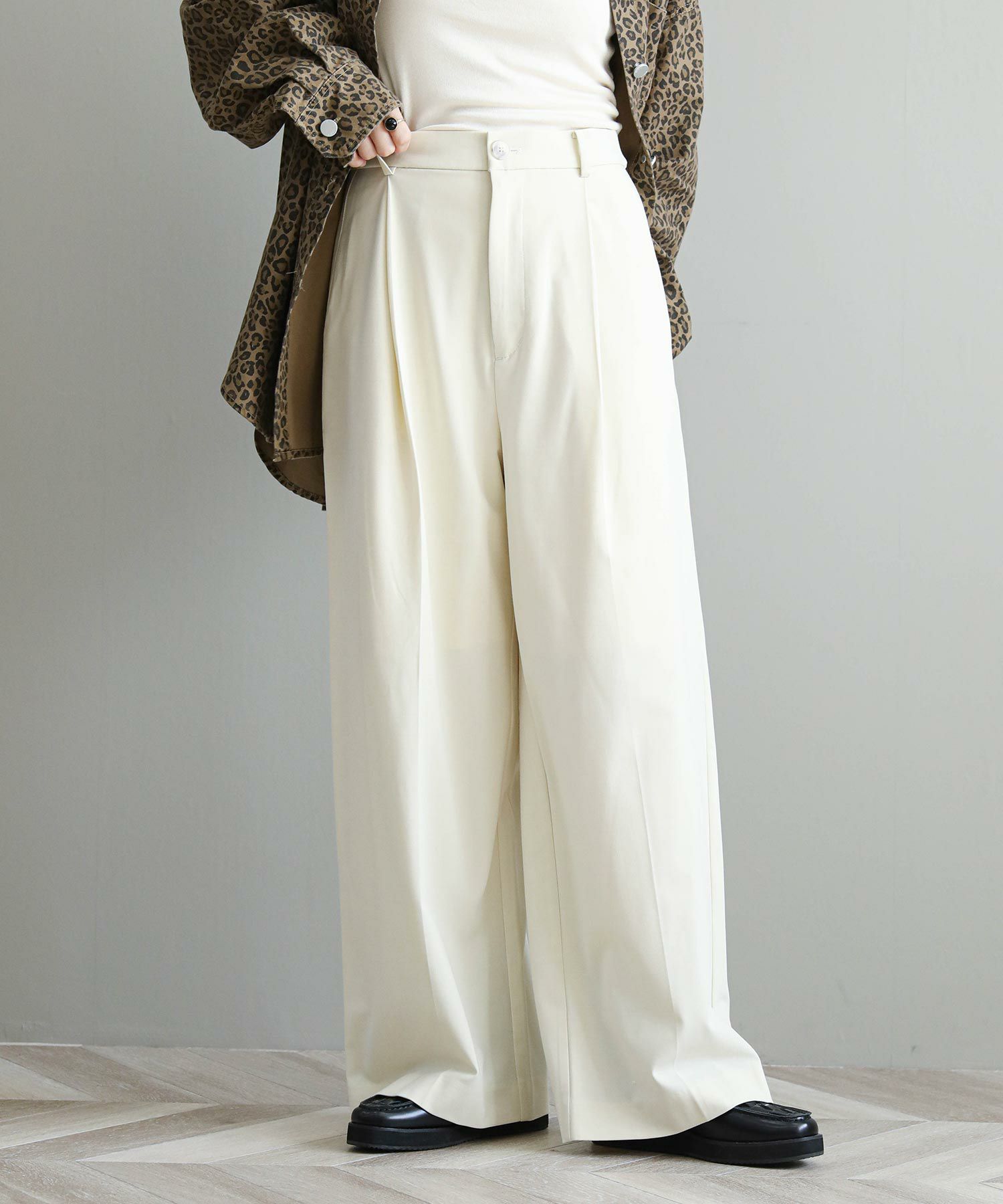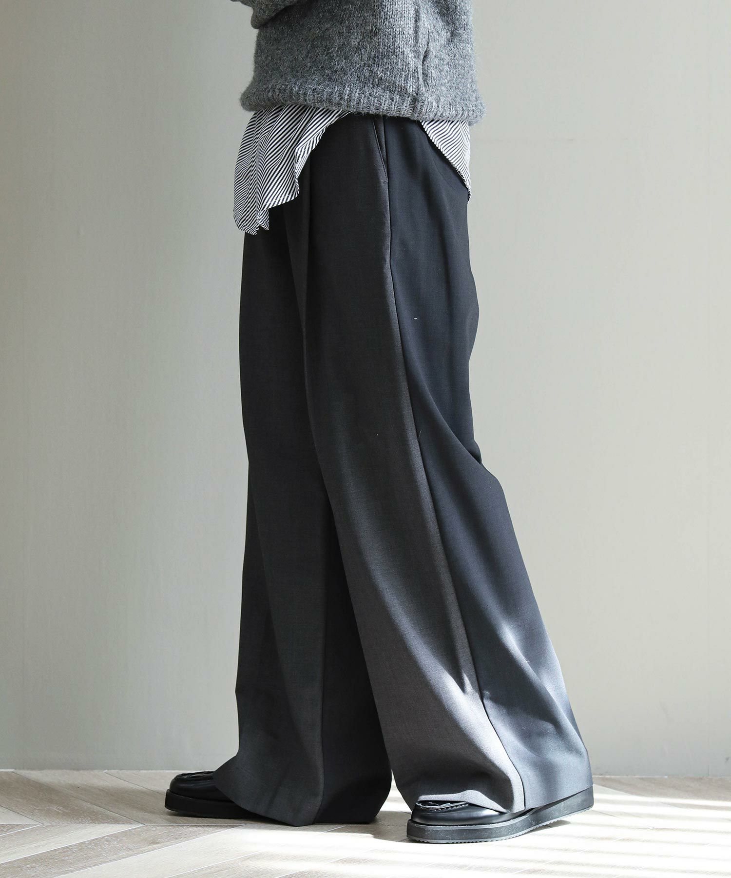 縦のラインが綺麗に出る足長効果◎のワイドパンツ。