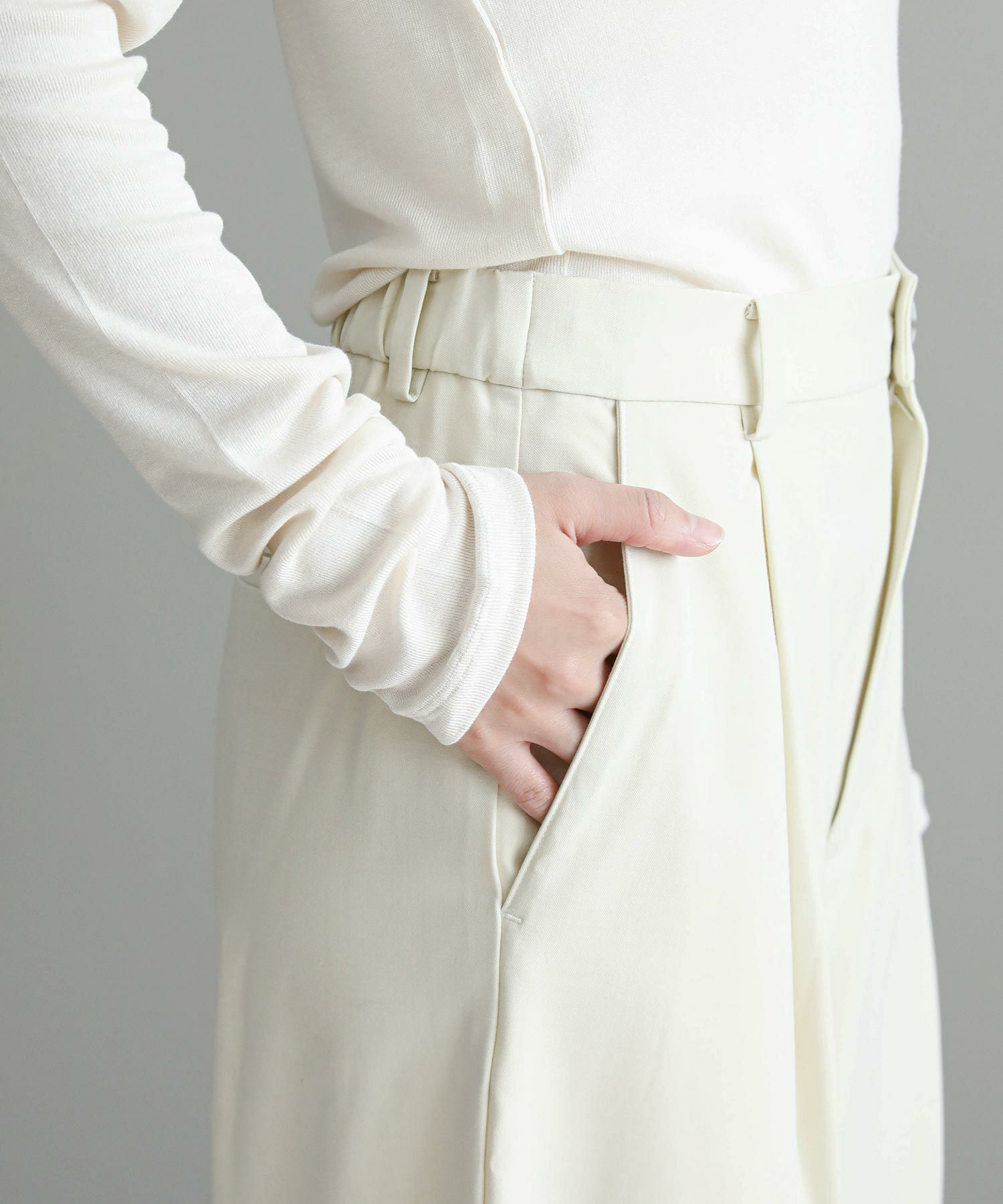 チャコールは前後が微配色仕様。同トーンでの配色なので悪目立ちせず、さりげないお洒落を楽しめます。アイボリーは同一カラーです。きちんと感もありお仕事着にもおすすめ。