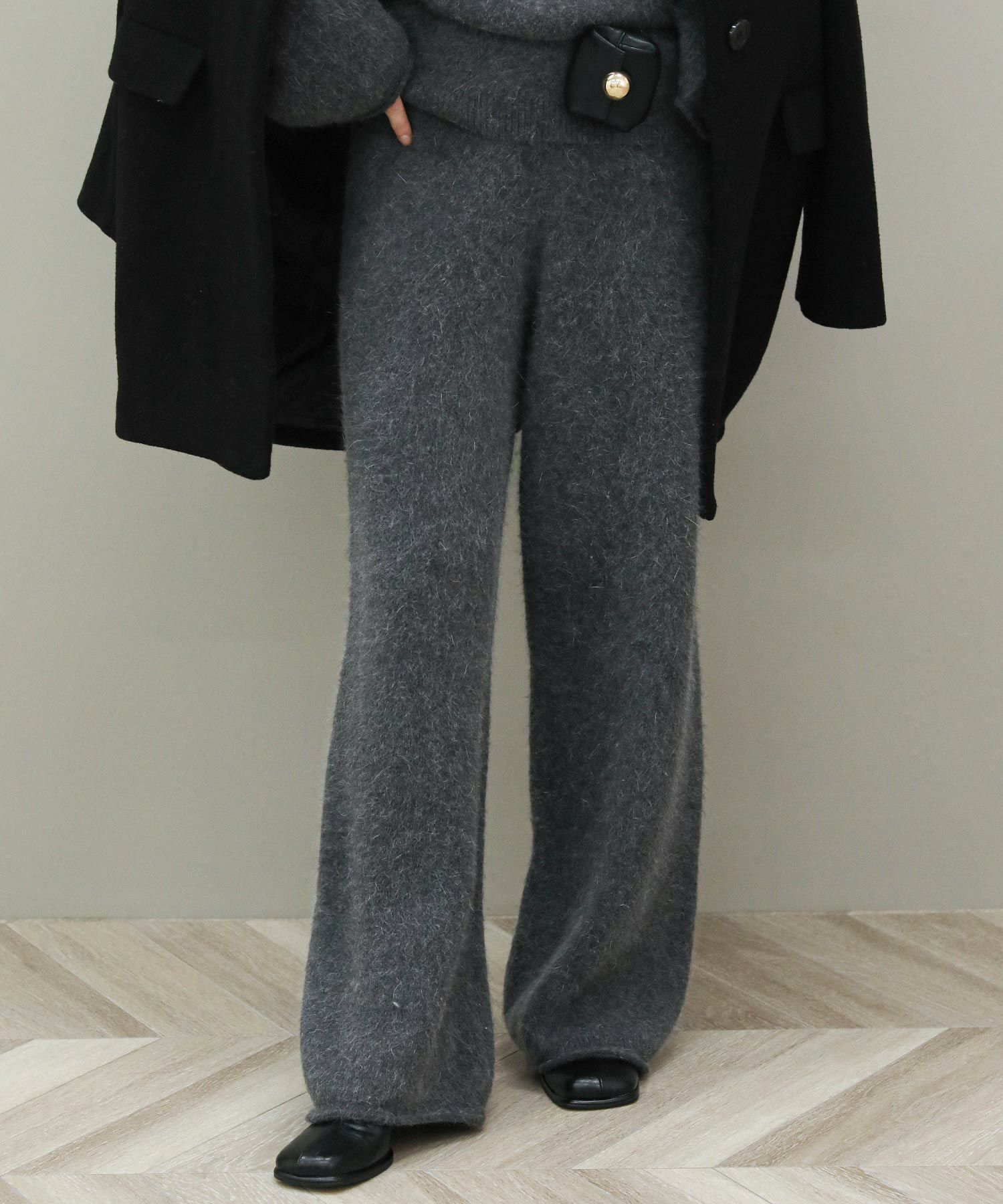 毛足の長いふんわりとしたニットのドロストパンツ。