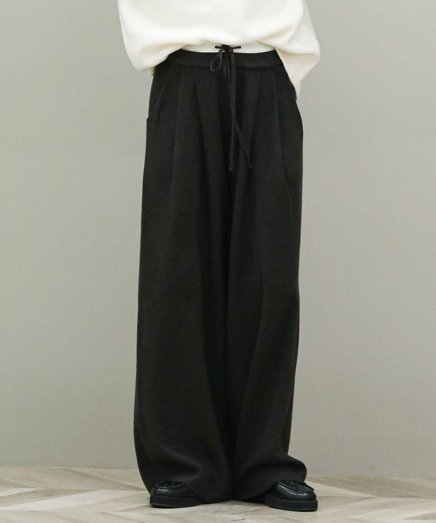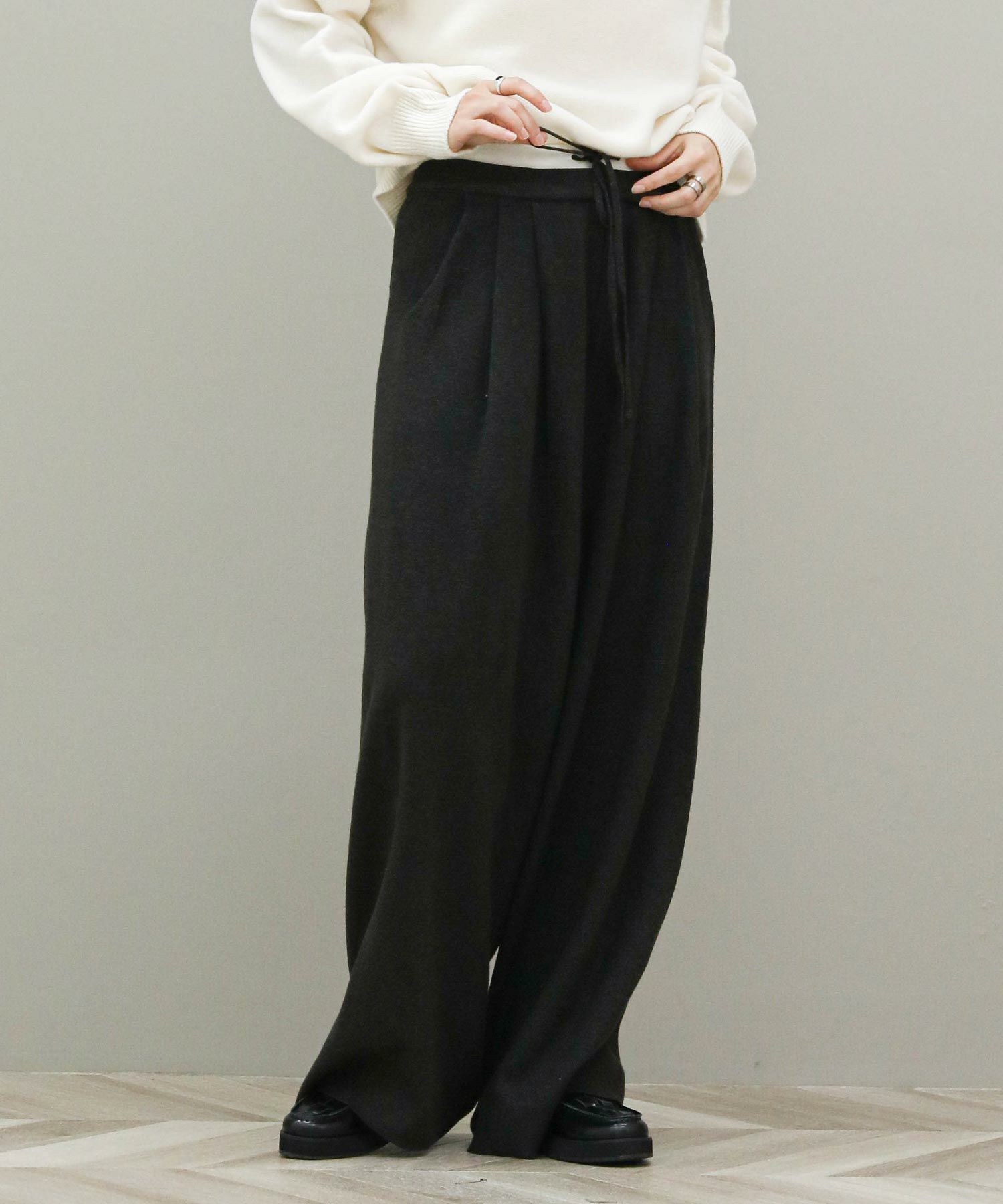 イージーな穿き心地も魅力です。ニットパンツですが、足のラインを拾わないゆったりとしたワイドシルエットなのでスタイルアップ効果も◎深みのあるチャコールグレーがカジュアルさを抑えます。トップスにニットを合わせても野暮ったくならないので幅広いスタイルをお楽しみいただけます。