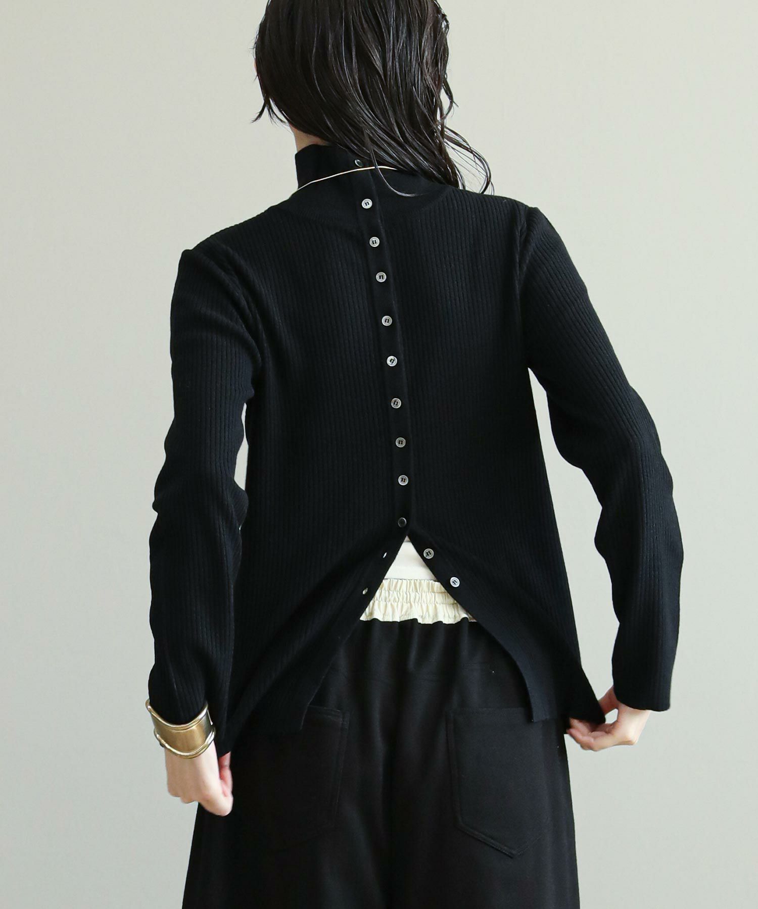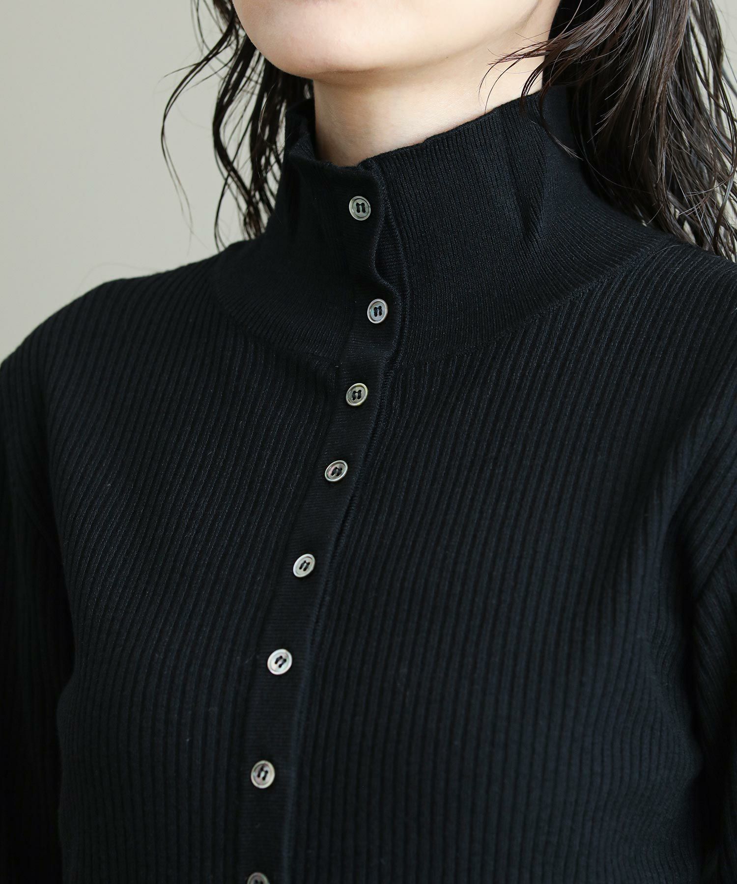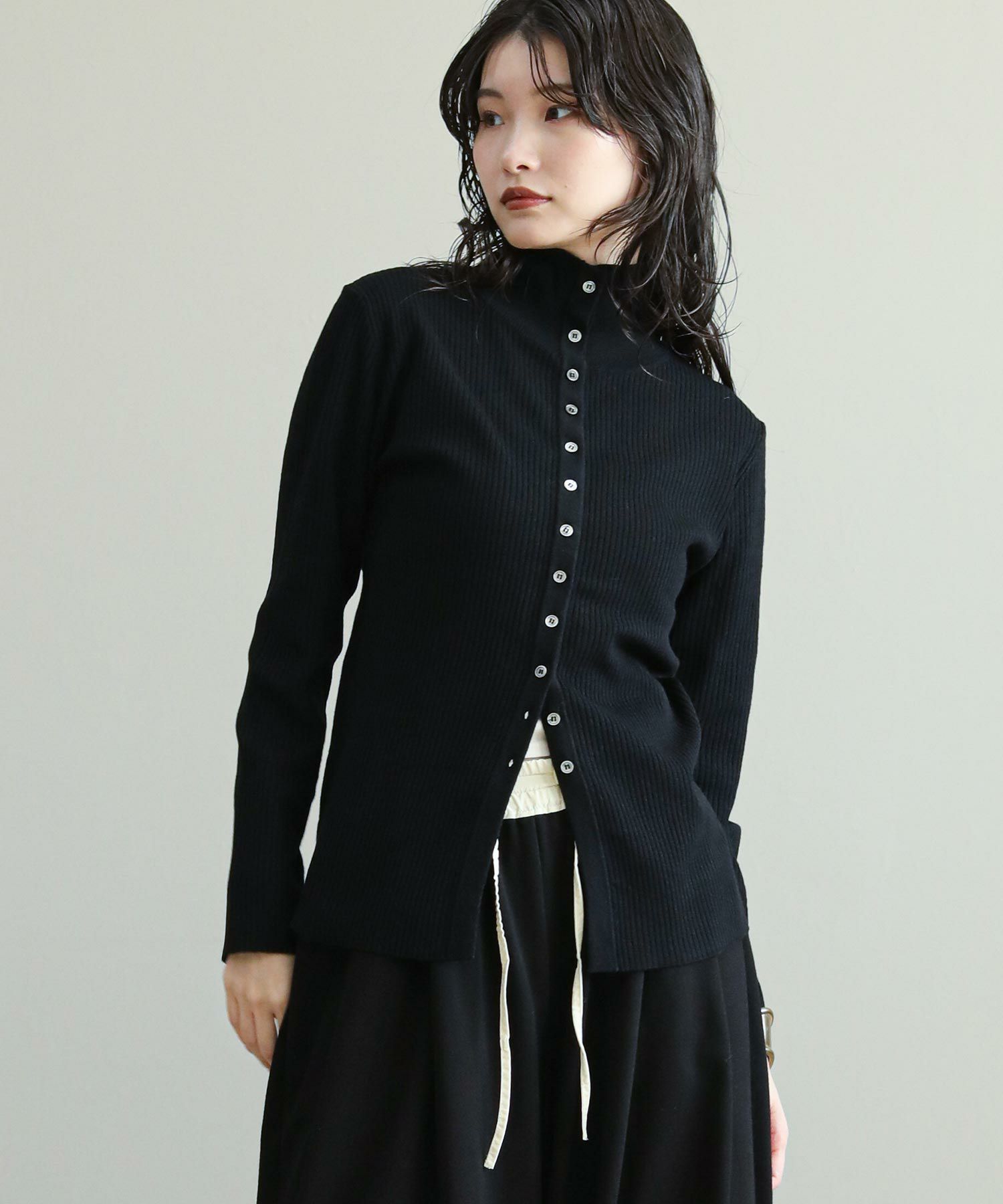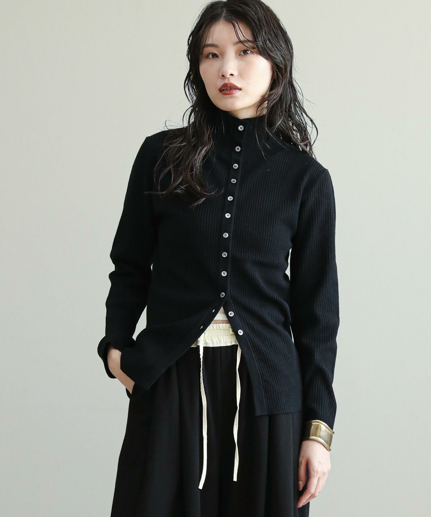 衿の釦を開けてシャツのような着こなしも出来る、マルチウェイニットです。前後を逆にして普通のタートルとして着て頂くことも可能です。身頃はボディラインが出にくい、リブ見えする編地で作られており、一枚でもシルエットを気にすることなく着ていただけます。