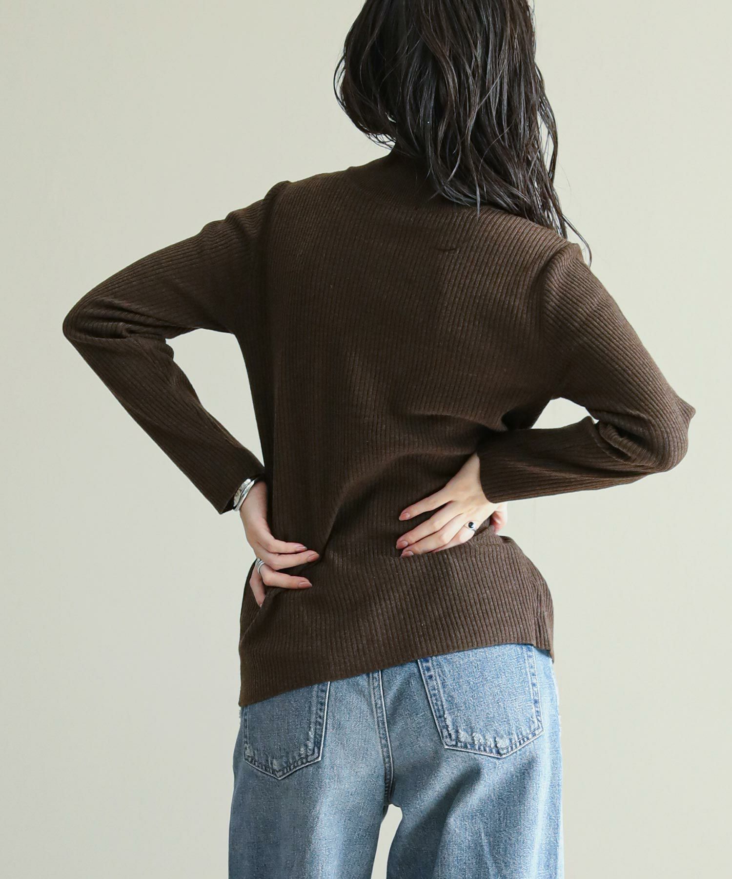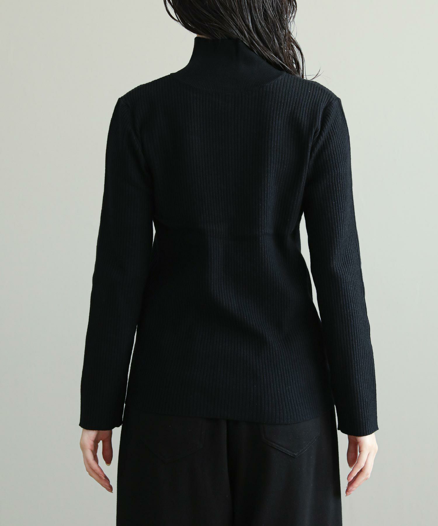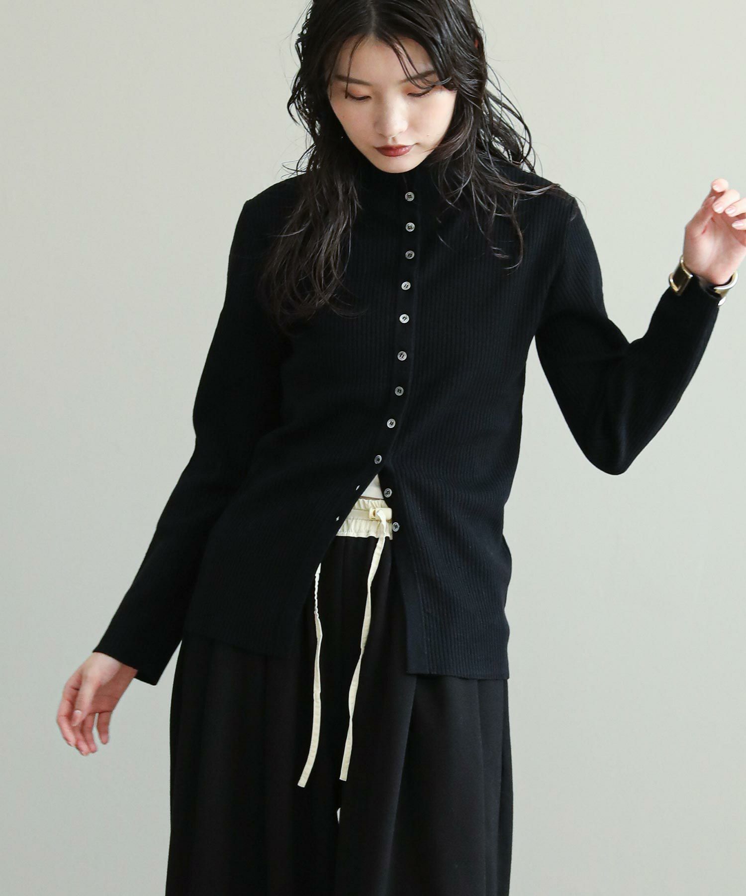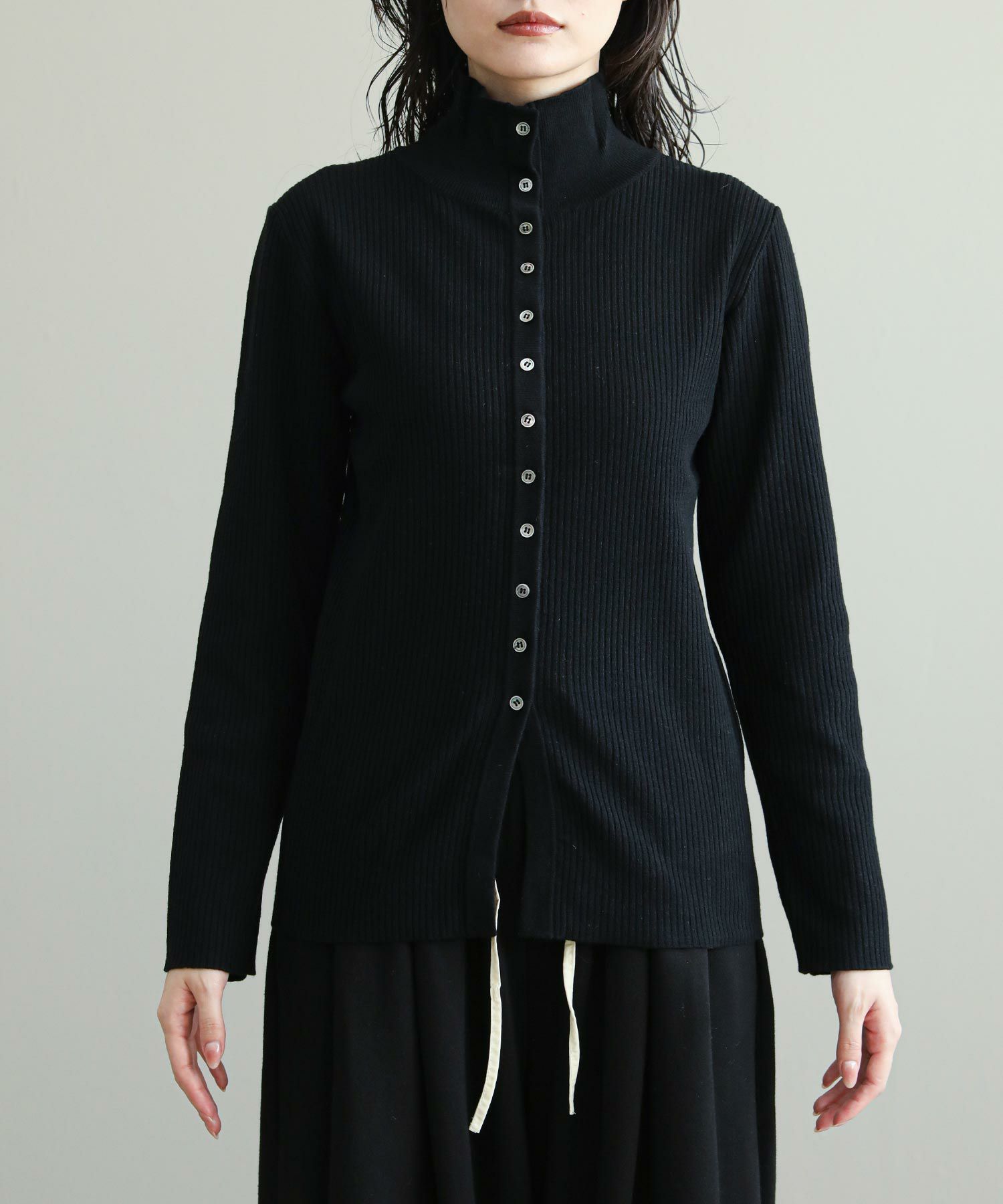衿の釦を開けてシャツのような着こなしも出来る、マルチウェイニットです。前後を逆にして普通のタートルとして着て頂くことも可能です。身頃はボディラインが出にくい、リブ見えする編地で作られており、一枚でもシルエットを気にすることなく着ていただけます。