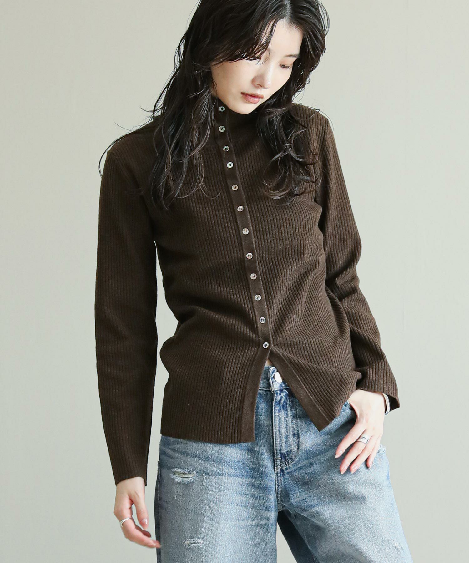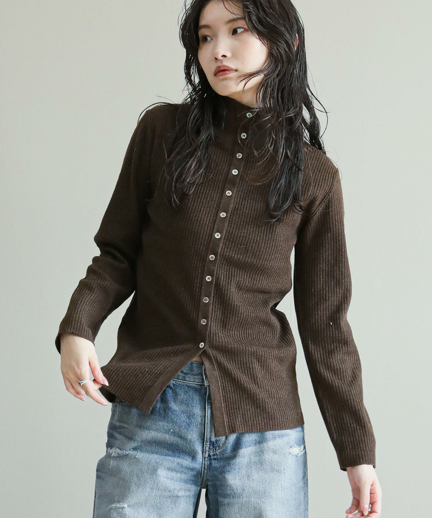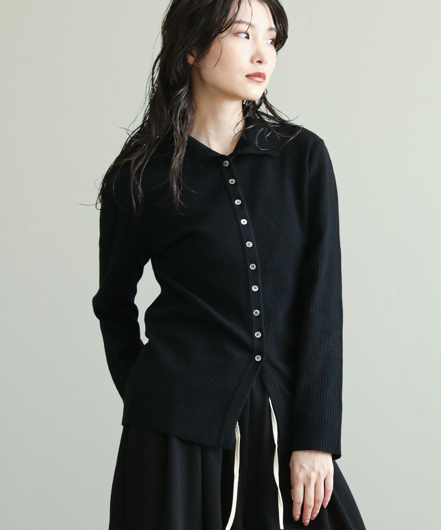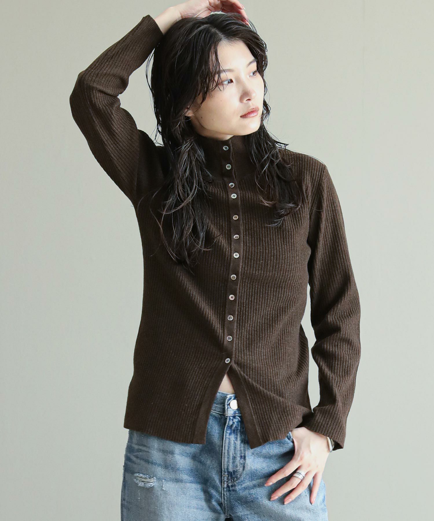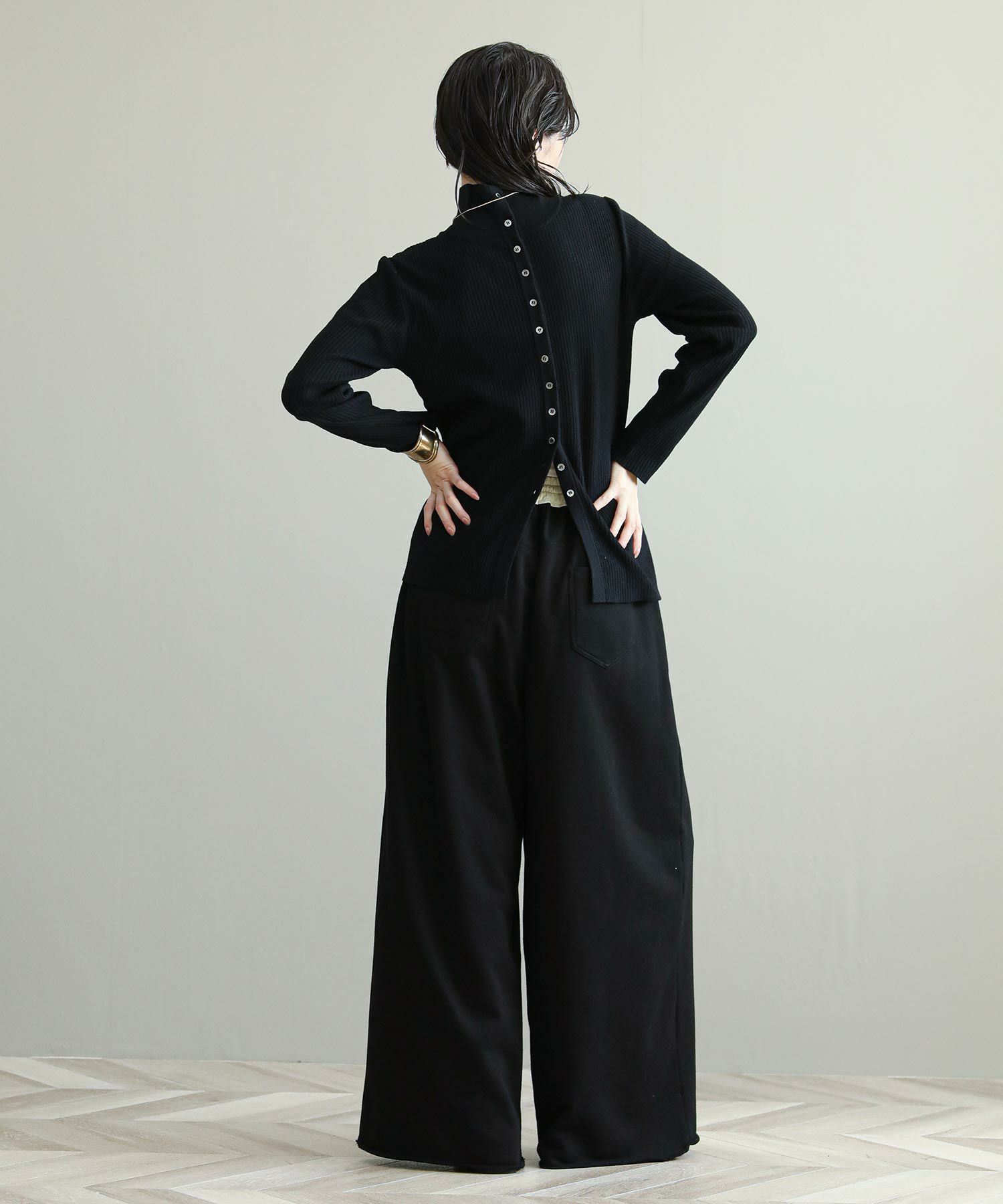 衿の釦を開けてシャツのような着こなしも出来る、マルチウェイニットです。前後を逆にして普通のタートルとして着て頂くことも可能です。身頃はボディラインが出にくい、リブ見えする編地で作られており、一枚でもシルエットを気にすることなく着ていただけます。