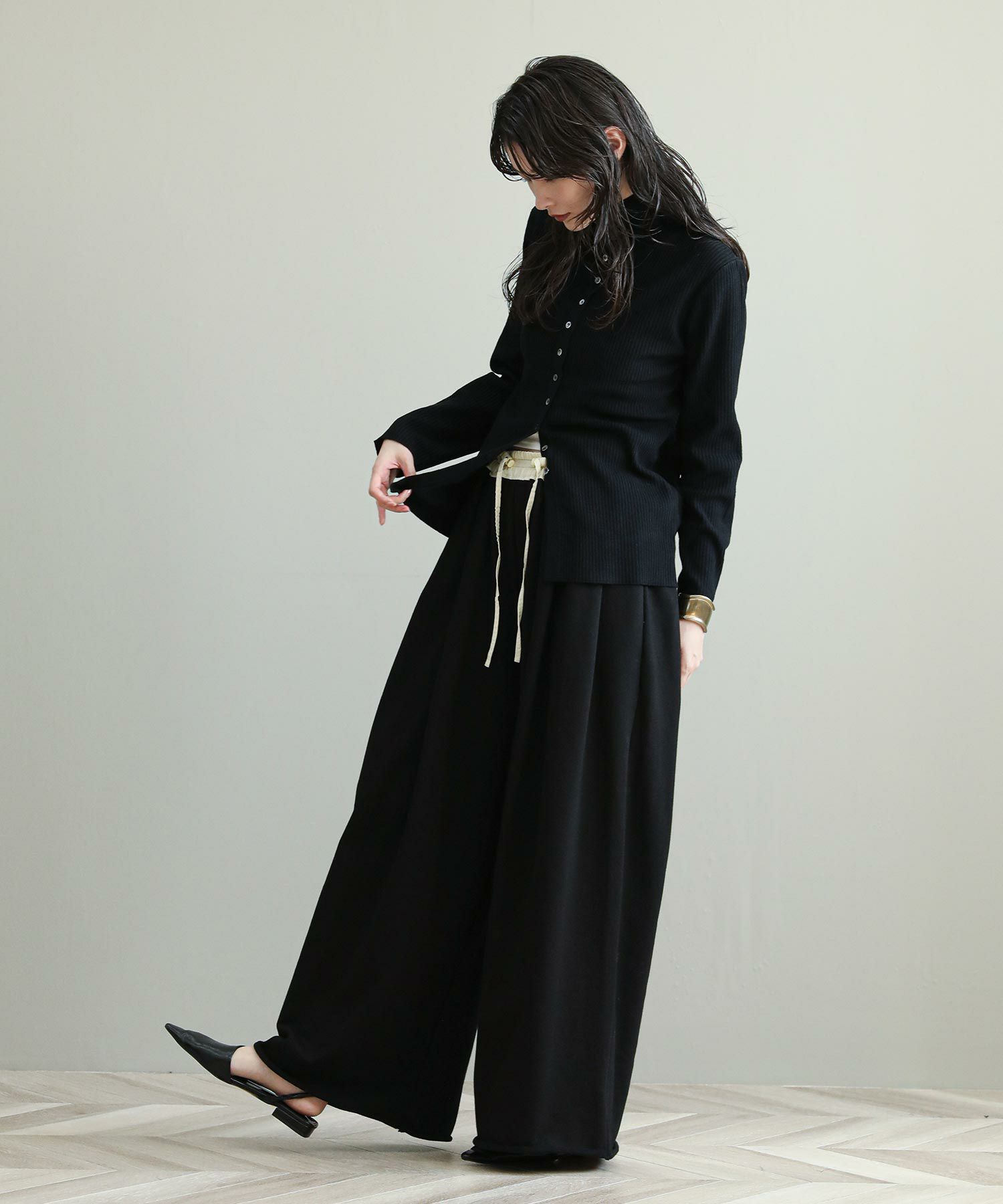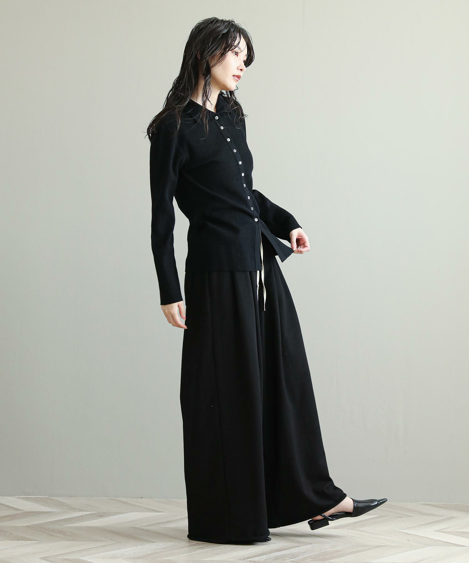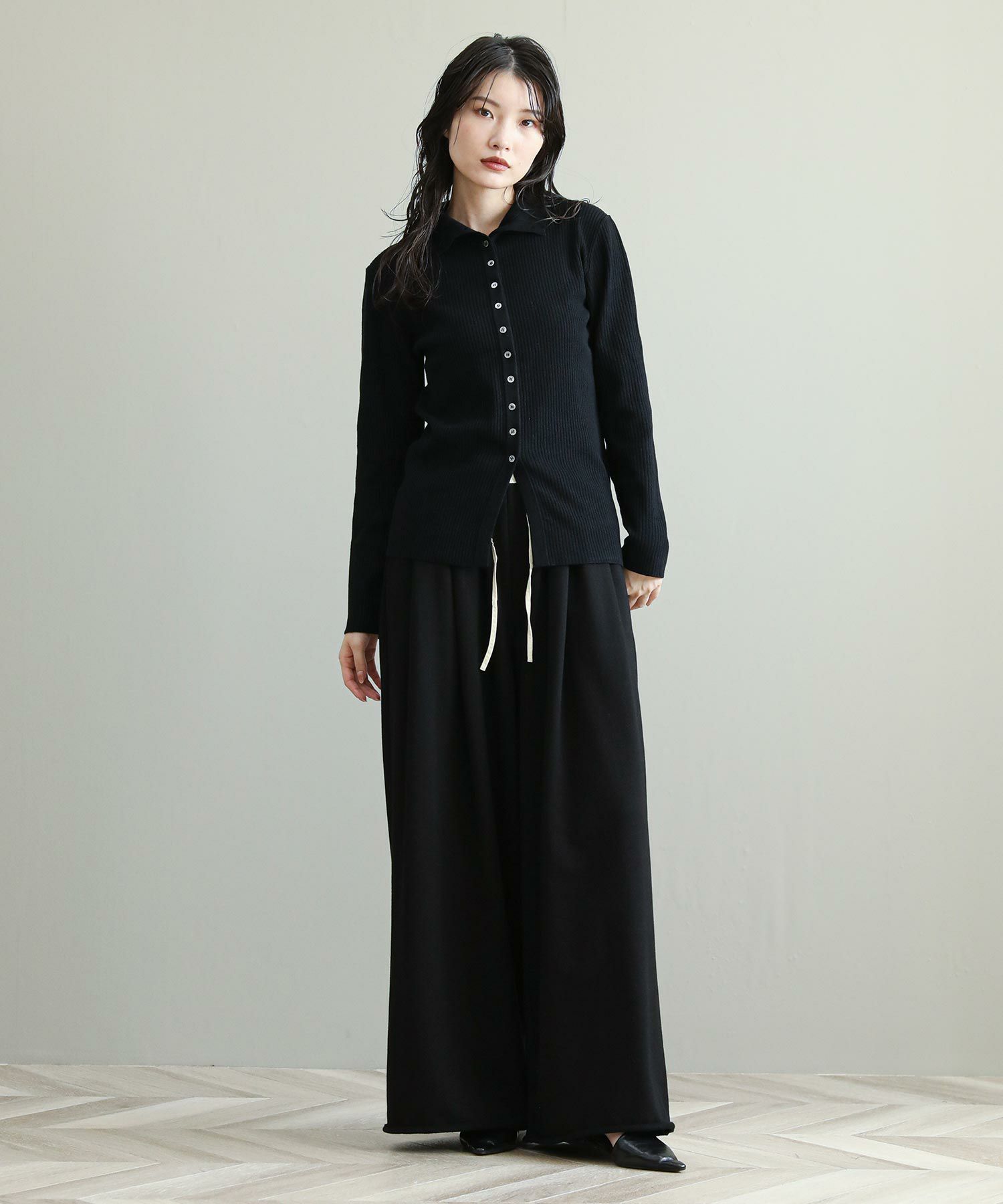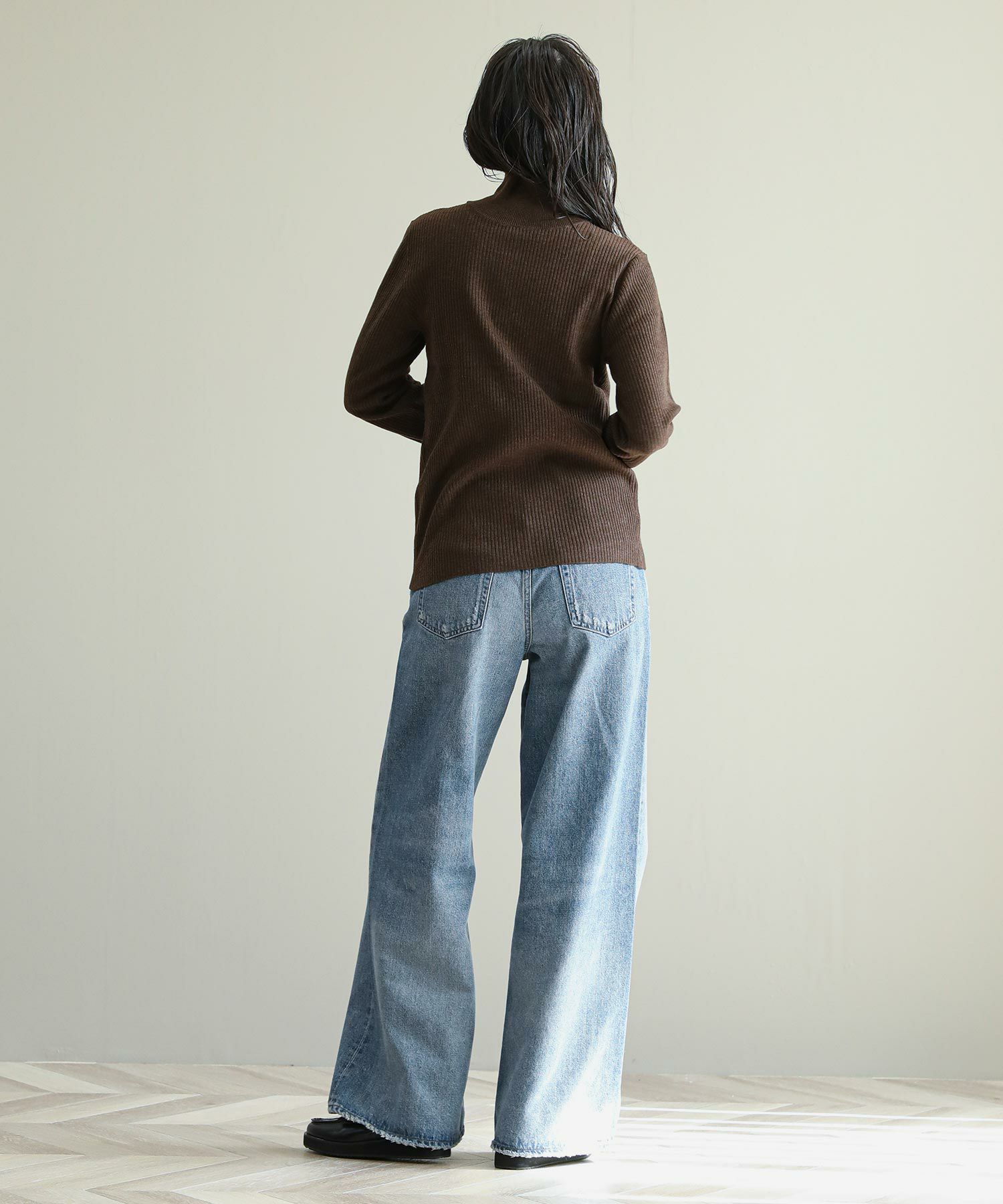 衿の釦を開けてシャツのような着こなしも出来る、マルチウェイニットです。前後を逆にして普通のタートルとして着て頂くことも可能です。身頃はボディラインが出にくい、リブ見えする編地で作られており、一枚でもシルエットを気にすることなく着ていただけます。