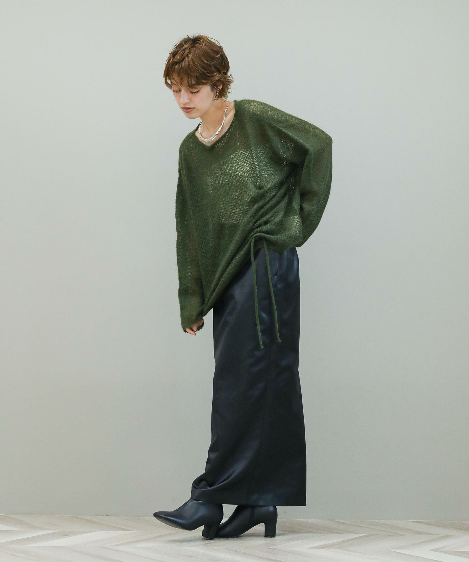 裾のコードでシャーリングを作り、シルエットの変化を楽しめます。首元はボートネック風の開きで抜け感も◎透け感を活かしてインナーにプリントTシャツを合わせるのもおすすめ。