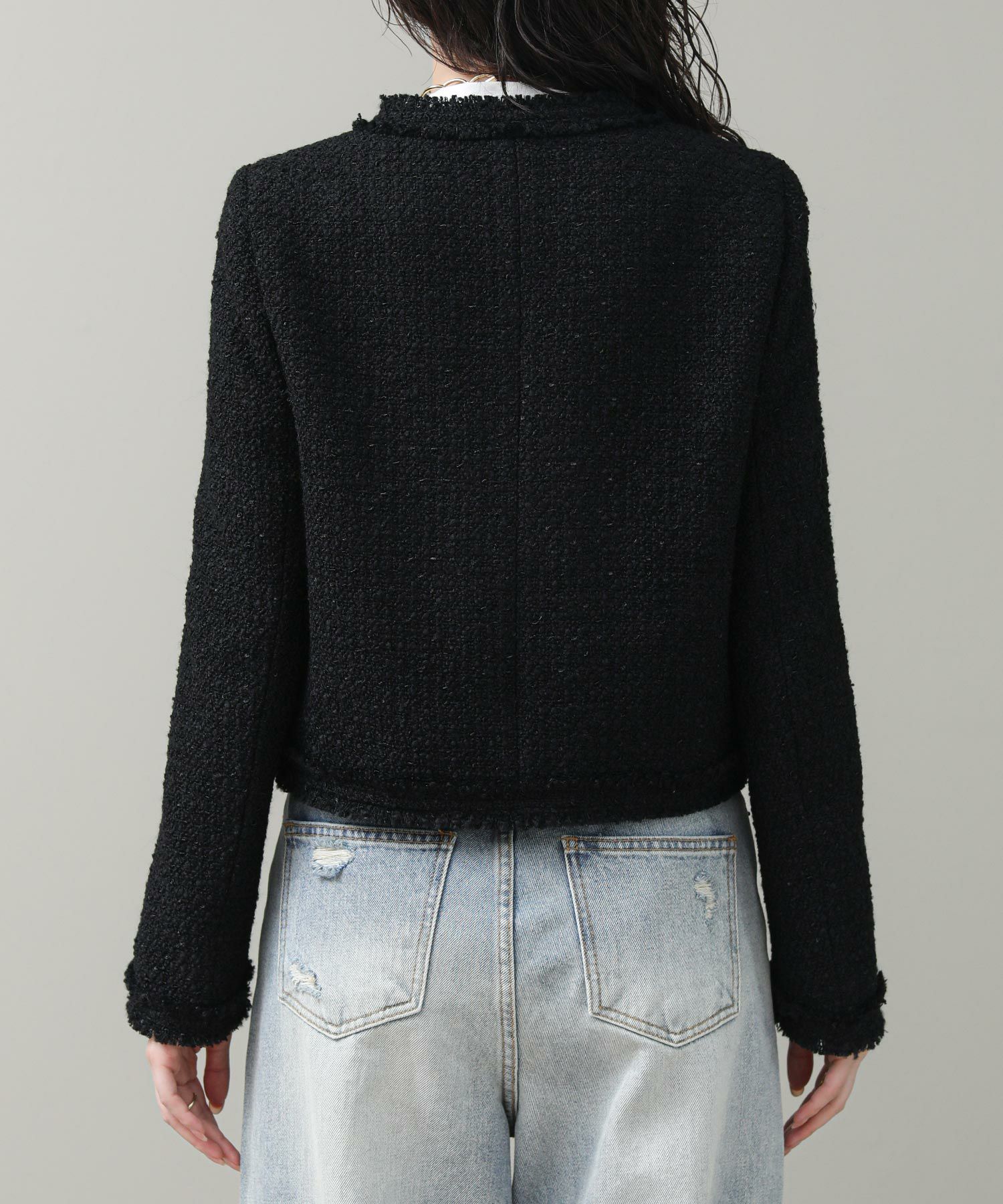 コンパクトなシルエットとブラックのシックな表情がリジョイスらしいアイテムです。普段使いならダメージデニムなどカジュアルボトムとコントラストのあるスタイルがおすすめ。タンクやTシャツにさっと羽織るだけでサマになります。