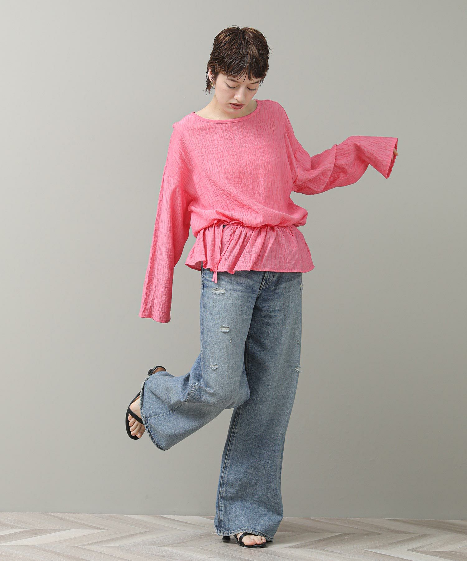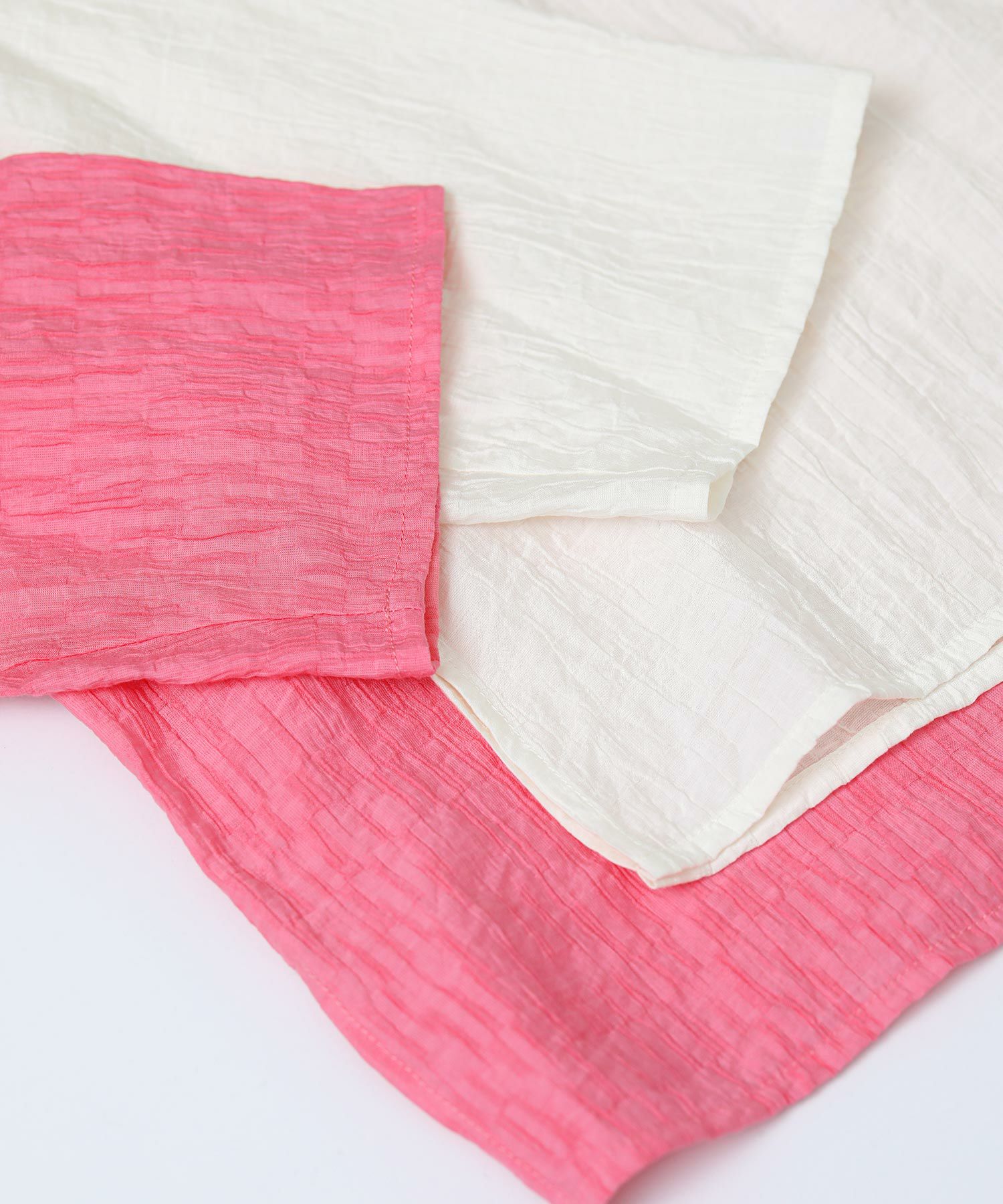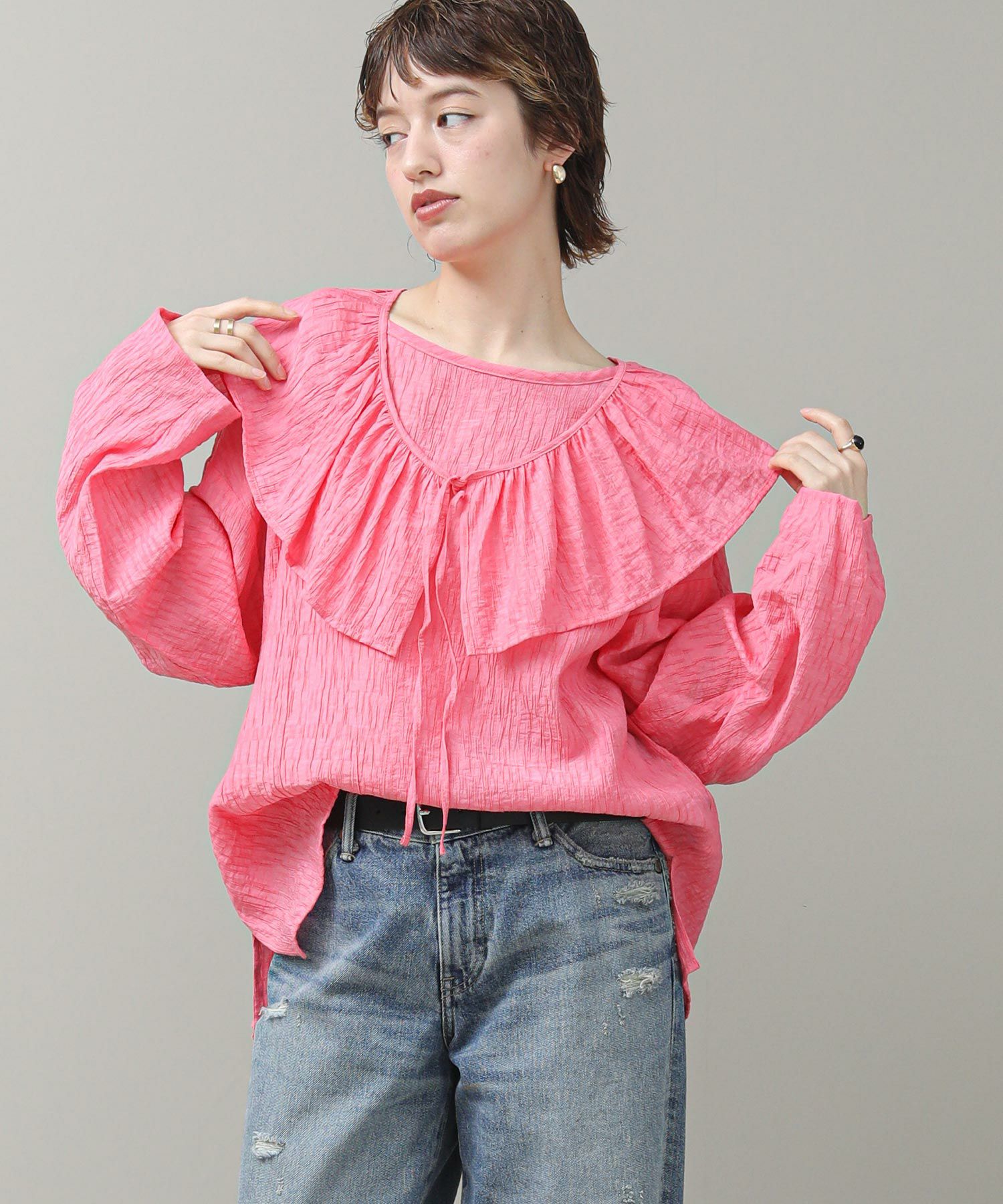 大きなフリル衿は着脱が可能でマルチWAYで使用できます。肩に垂らしてラッフルカラー風にしたり、腰の位置で巻けばペプラムデザインのブラウスにも。ブラウスだけで着るとTシャツ感覚で着られてジャケットやカーディガンのインナーにも重宝します。目を惹くビビットなピンクが春の気分を高めてくれる1枚です。