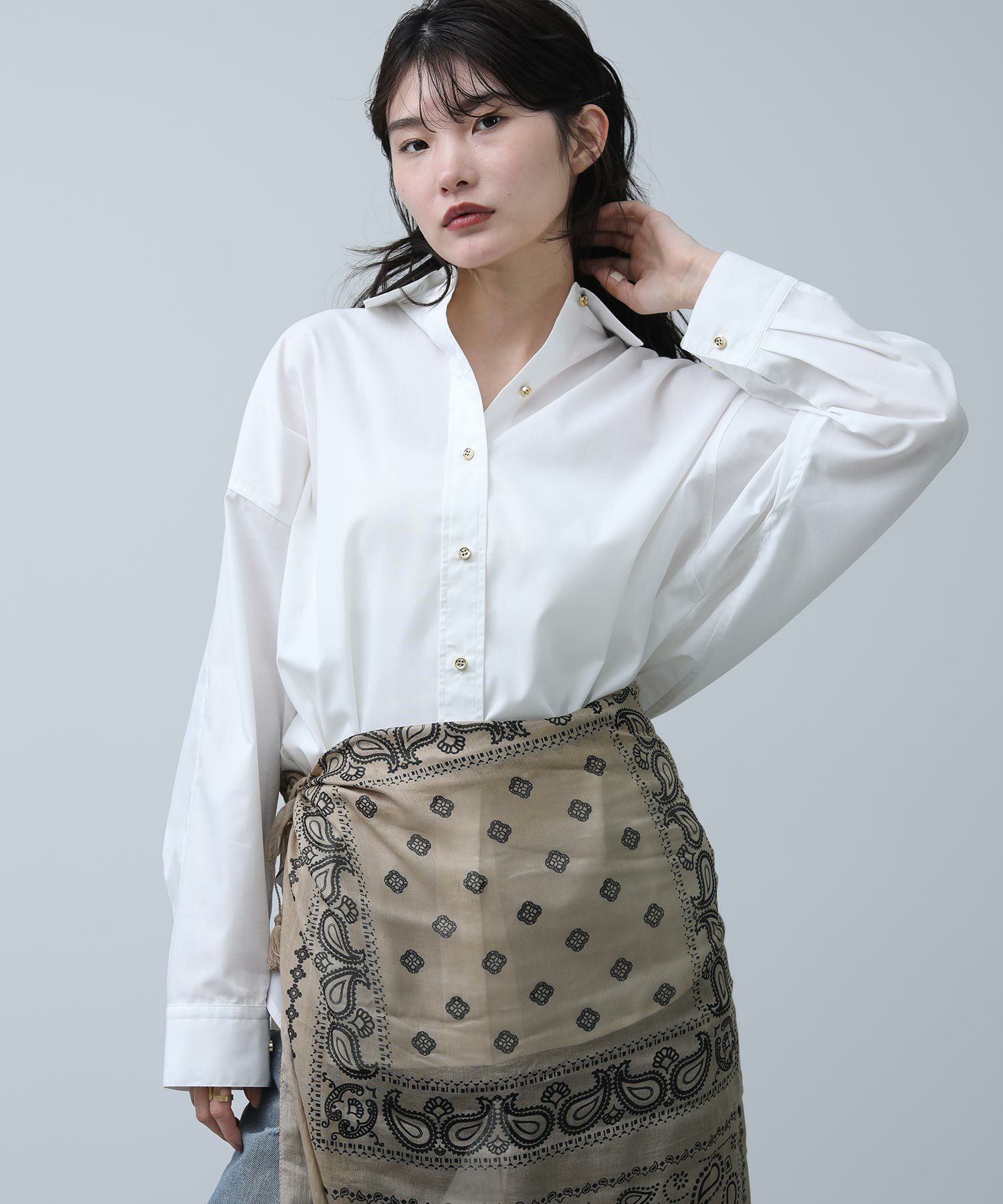 クリーンな白シャツで登場です。ベーシックアイテムも華やかな釦がアクセントになり、1枚でも着映えします。肩にタックを取ることで、衿を抜いてきたときのシルエットが綺麗に決まります。シワが気にならず、お手入れも簡単なのでお仕事着にもおすすめです。