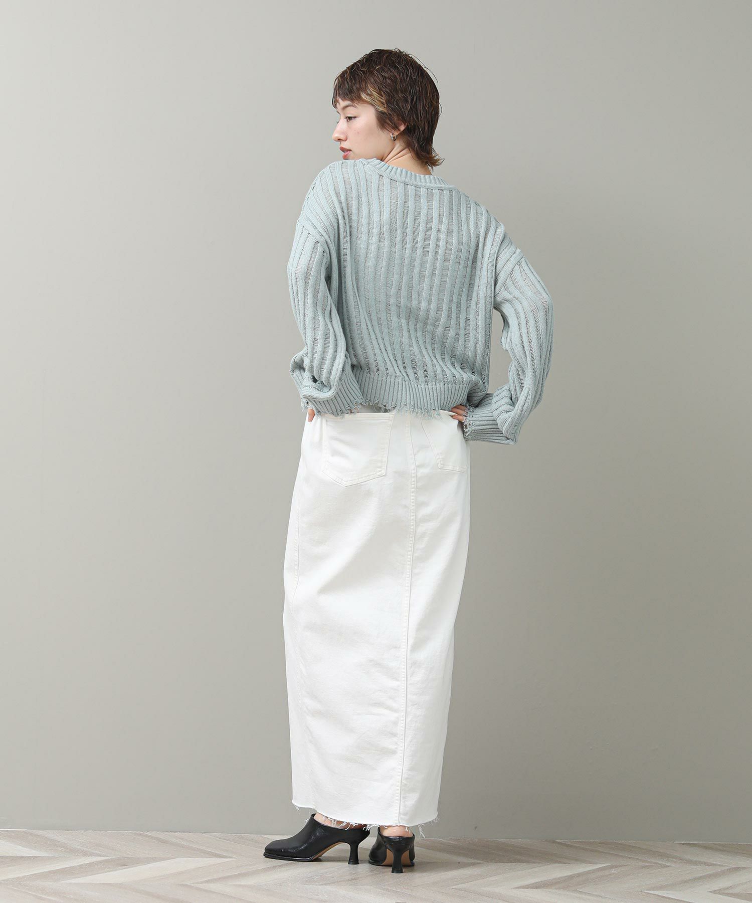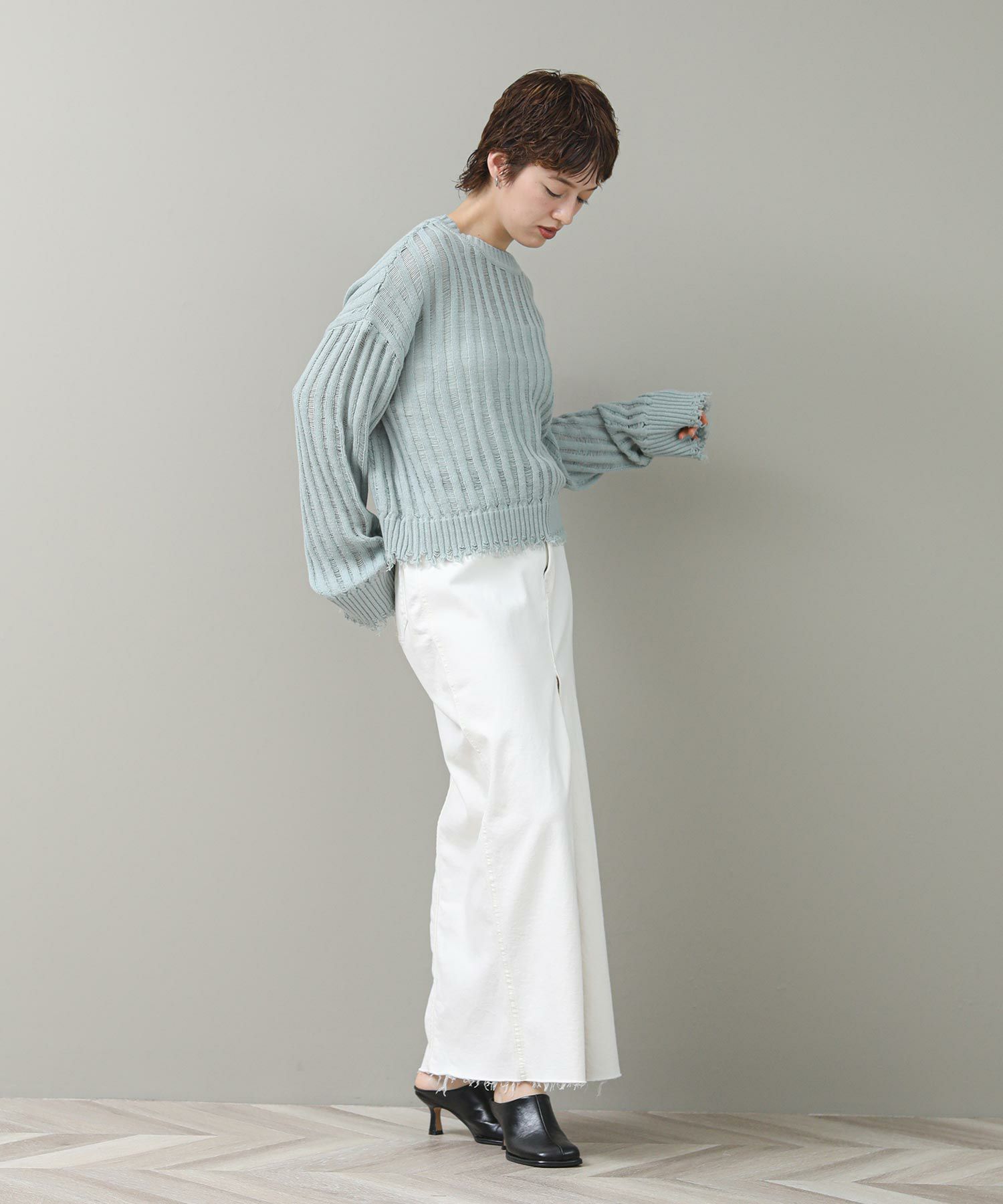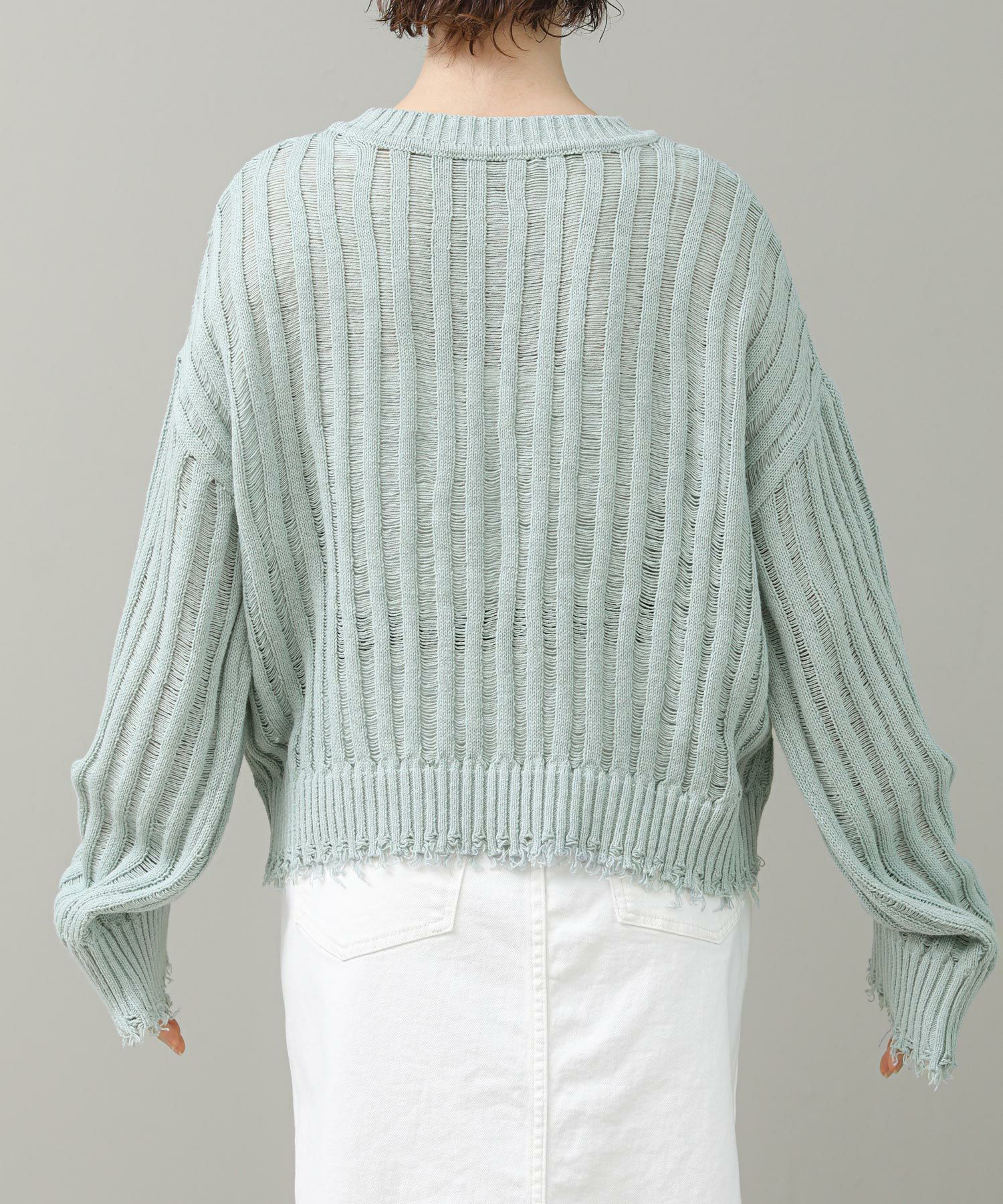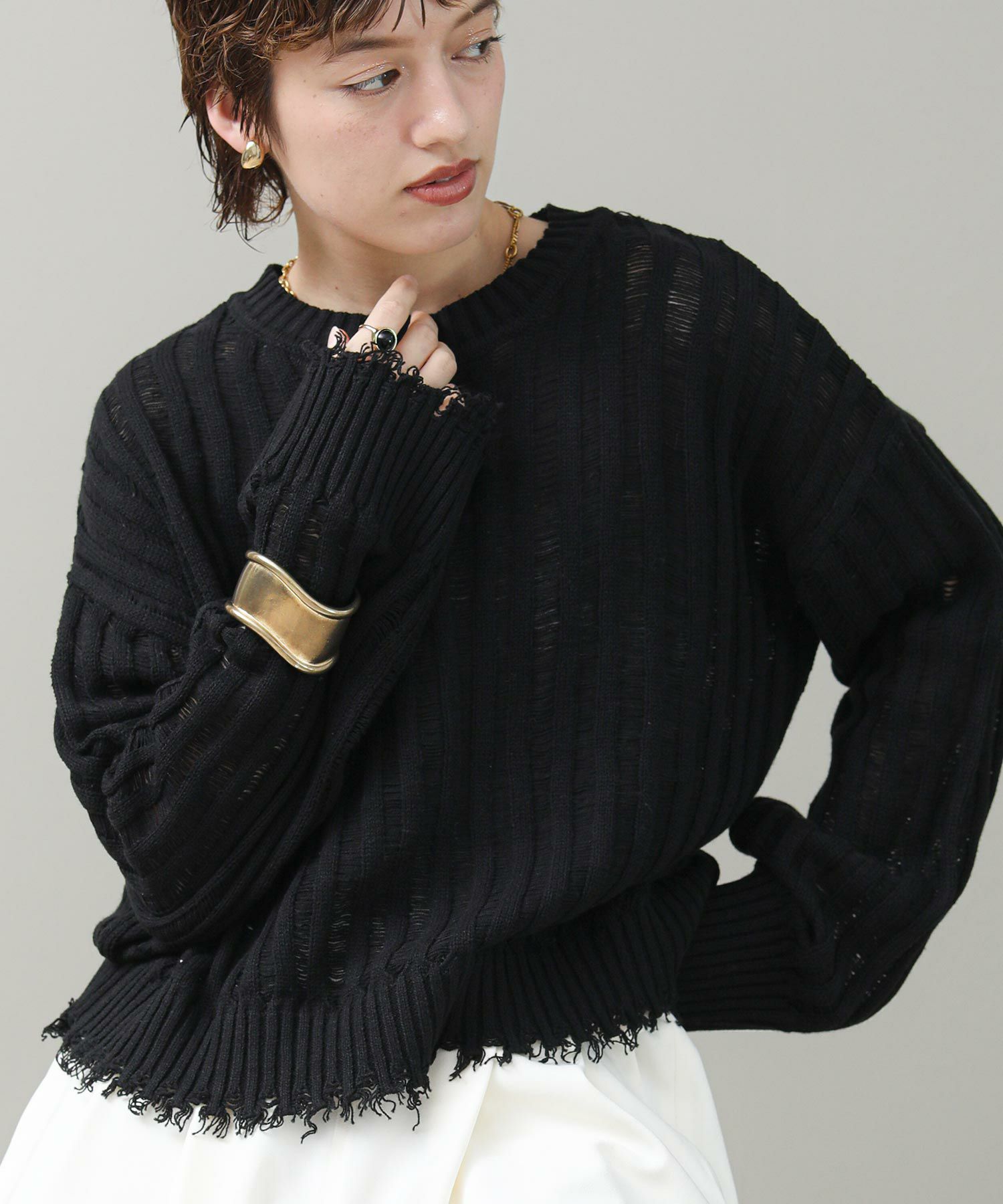 袖や裾のダメージデザインがポイントのプルオーバーニット。