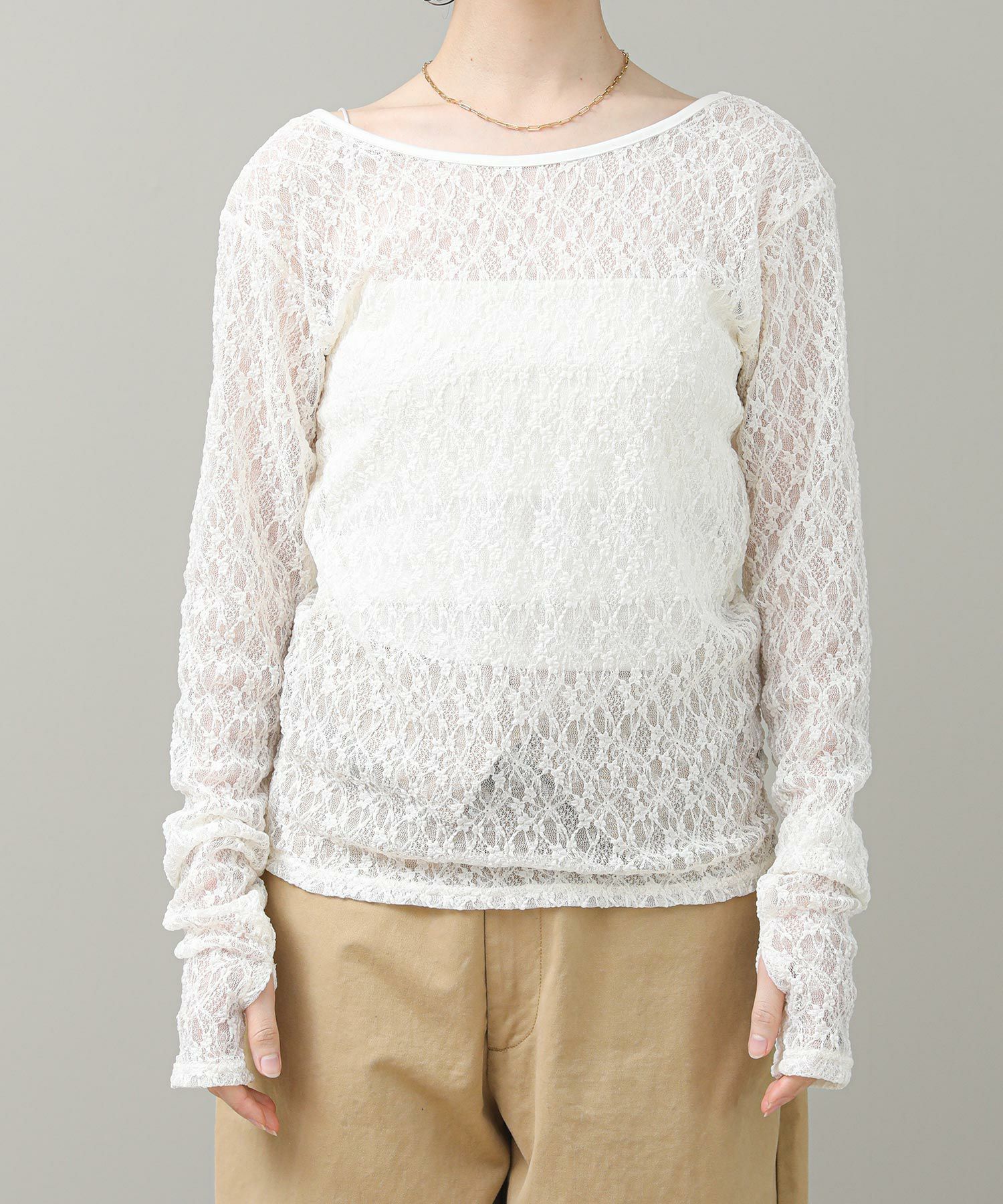 エレガントな雰囲気とは相反してしっかりとしたストレッチがあり、着心地抜群です。程よいシアー感でスタイルに奥行きを与えてくれるアイテム。ニットやシャツの下からレースの袖を覗かせてくしゅっとさせるスタイリングもおすすめです。 一枚で着てもレイヤードのインナーとしても着用でき、長く愛用していただけます。