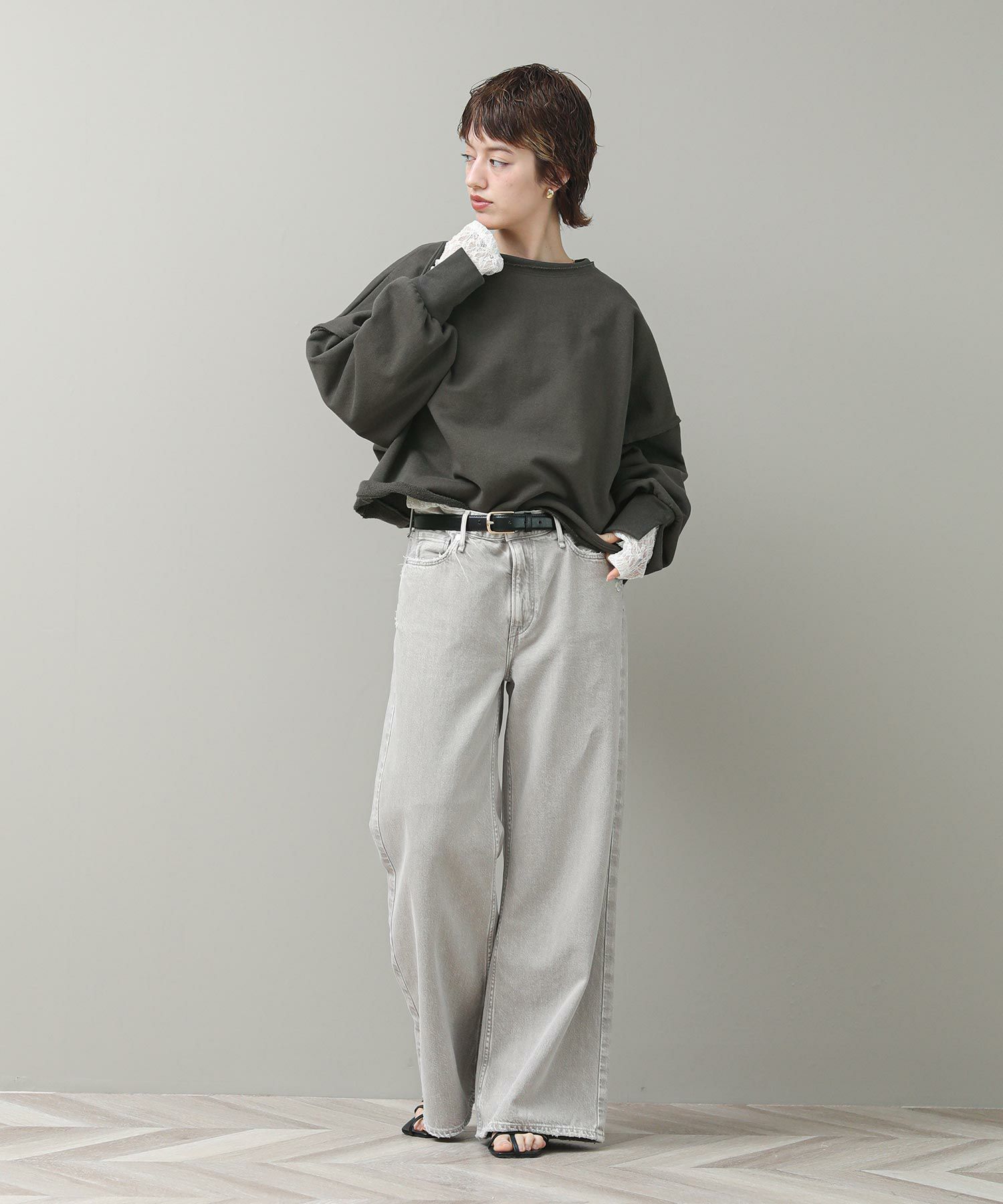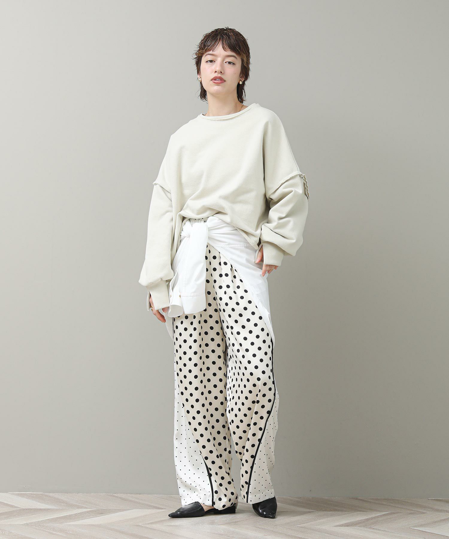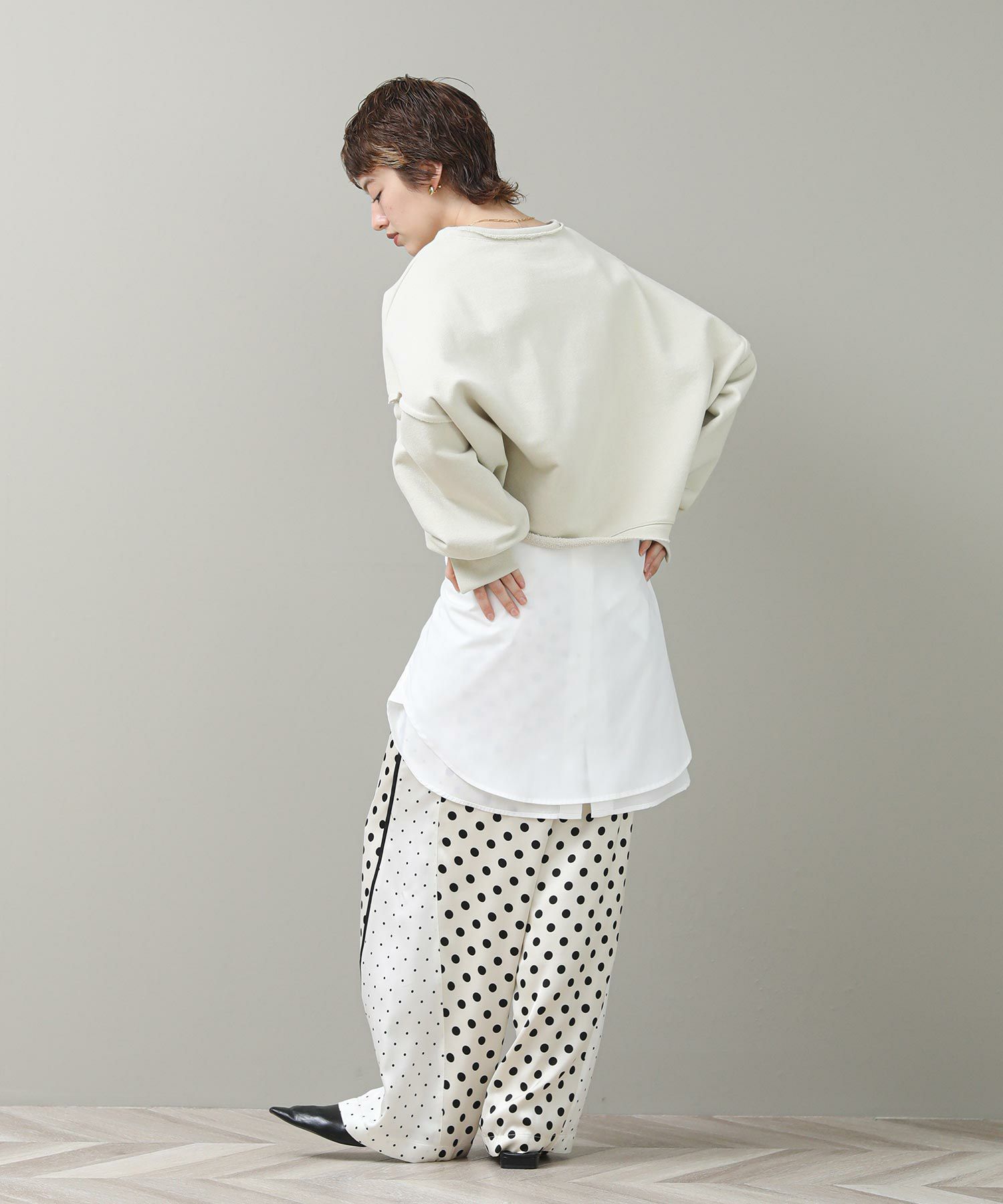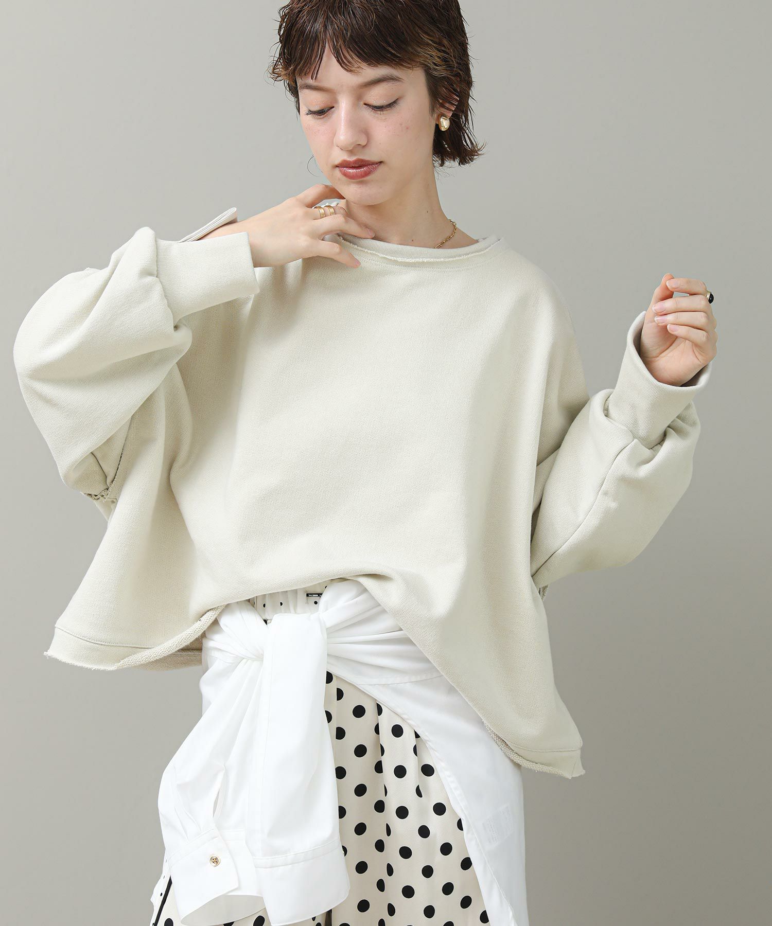 袖と裾でネックのレイヤード風のカットオフデザインが目を惹きます。たっぷりとしたオーバーシルエットですが、着丈を短めに設定しているのでワイドパンツやスカートとも好相性。