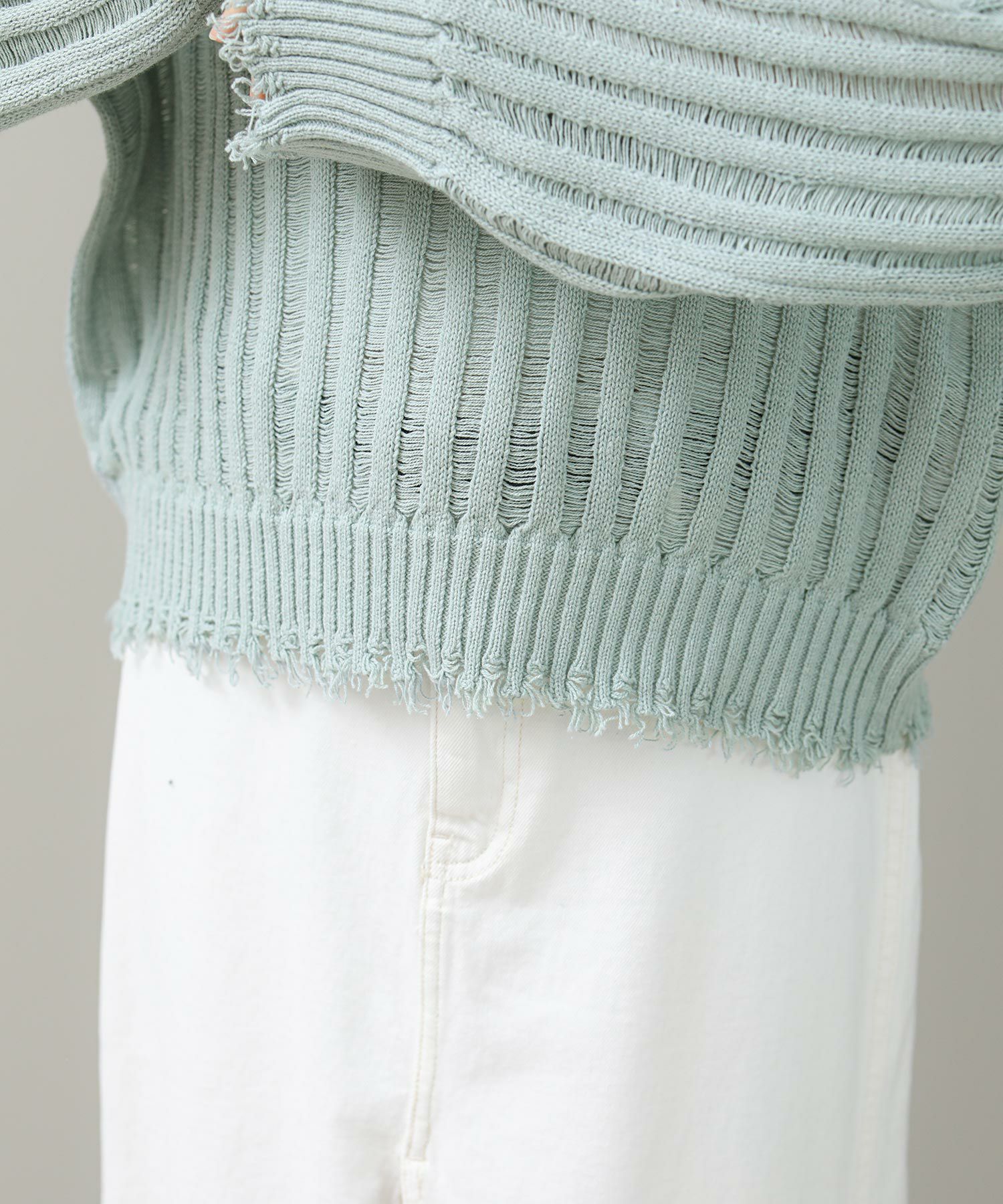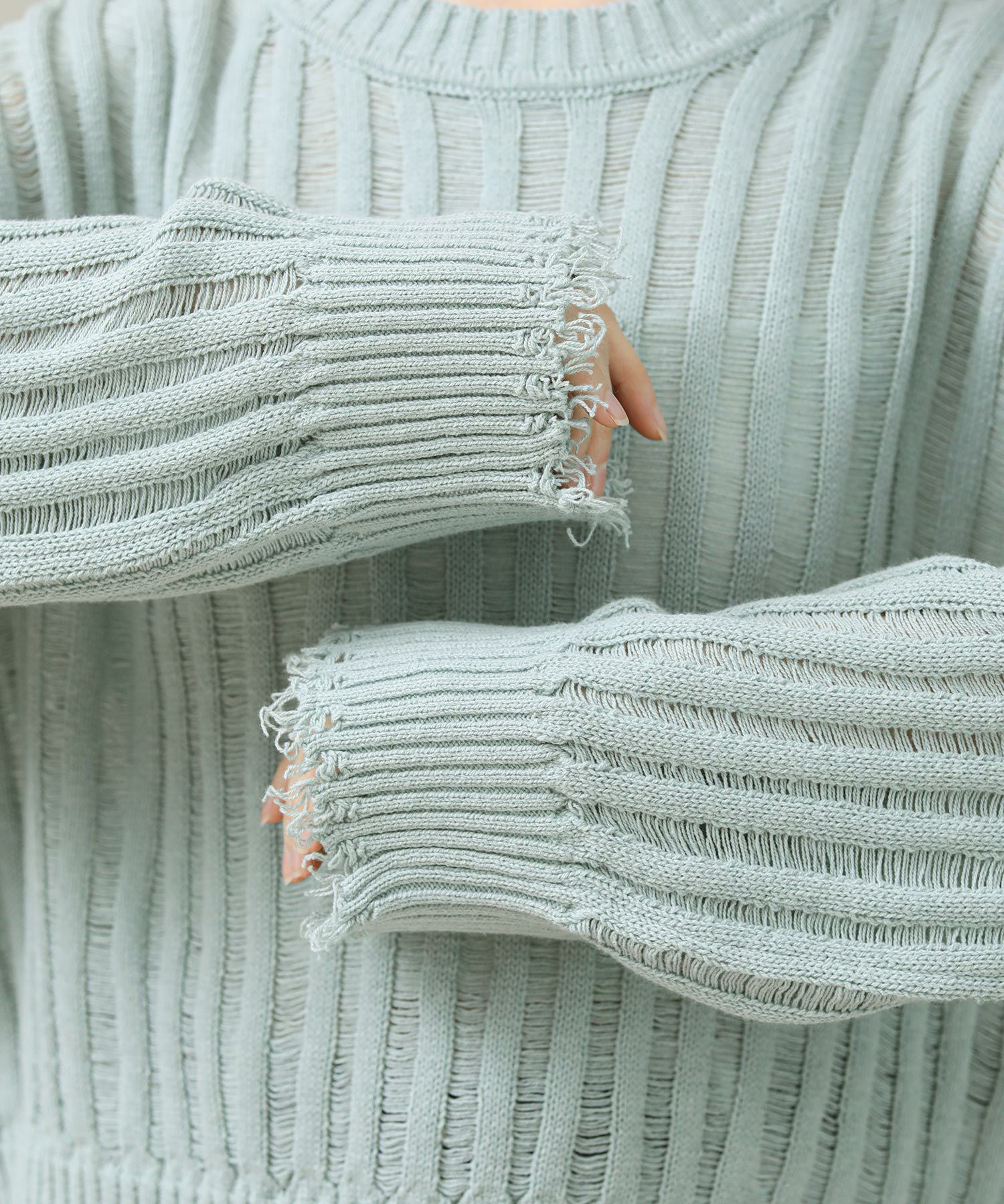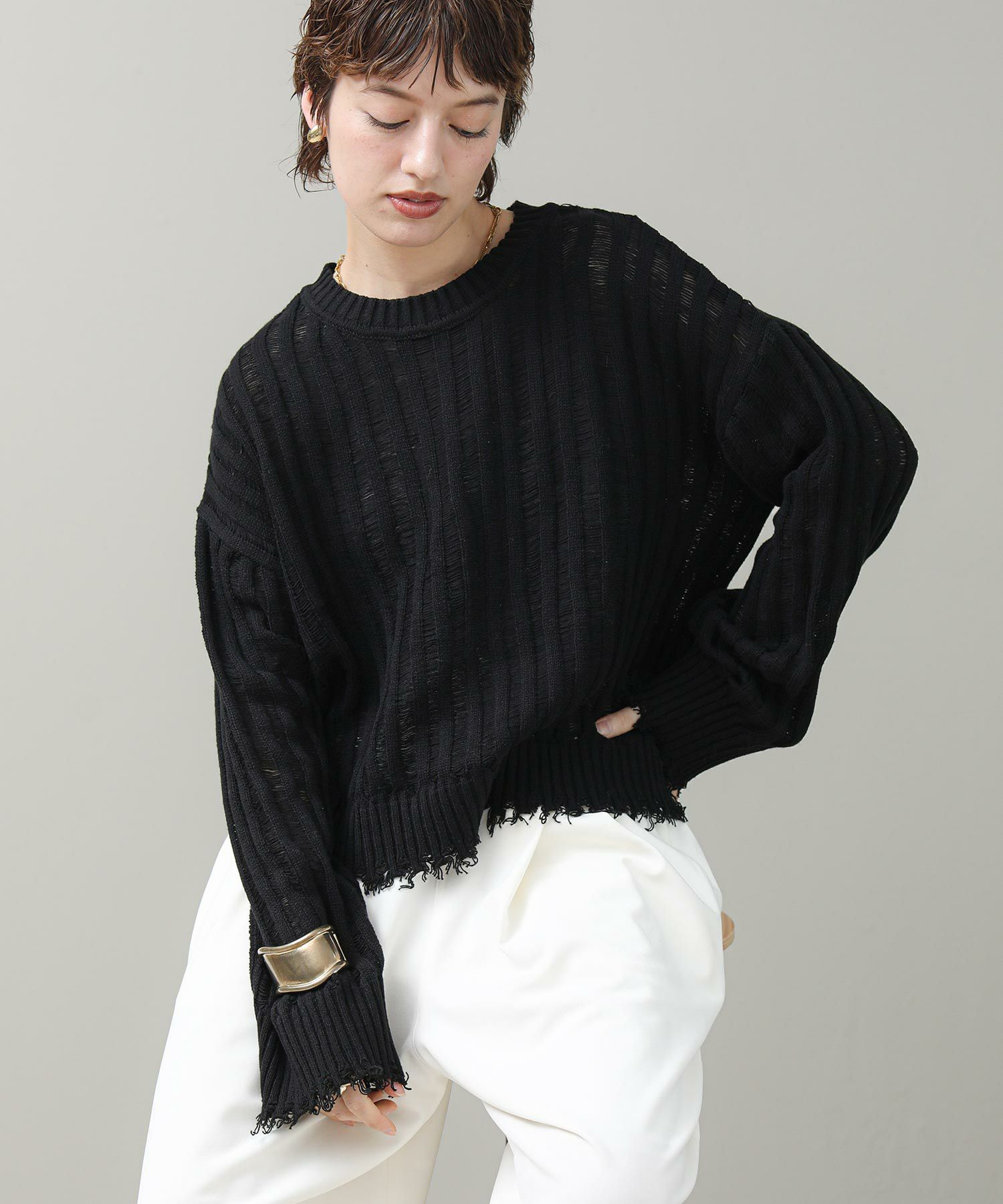 袖や裾のダメージデザインがポイントのプルオーバーニット。