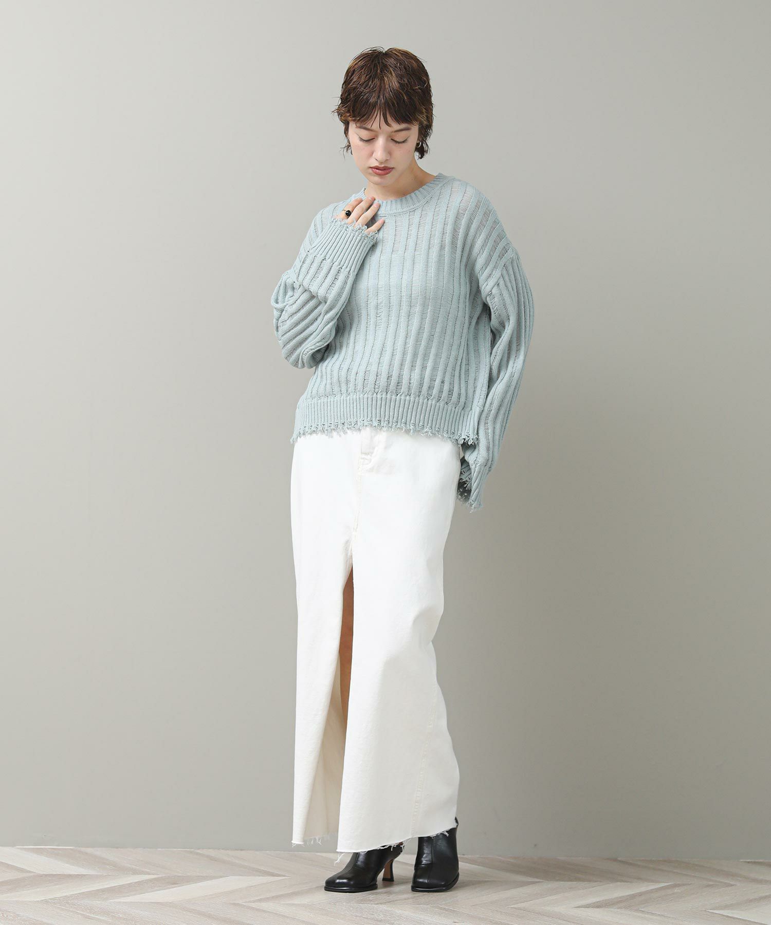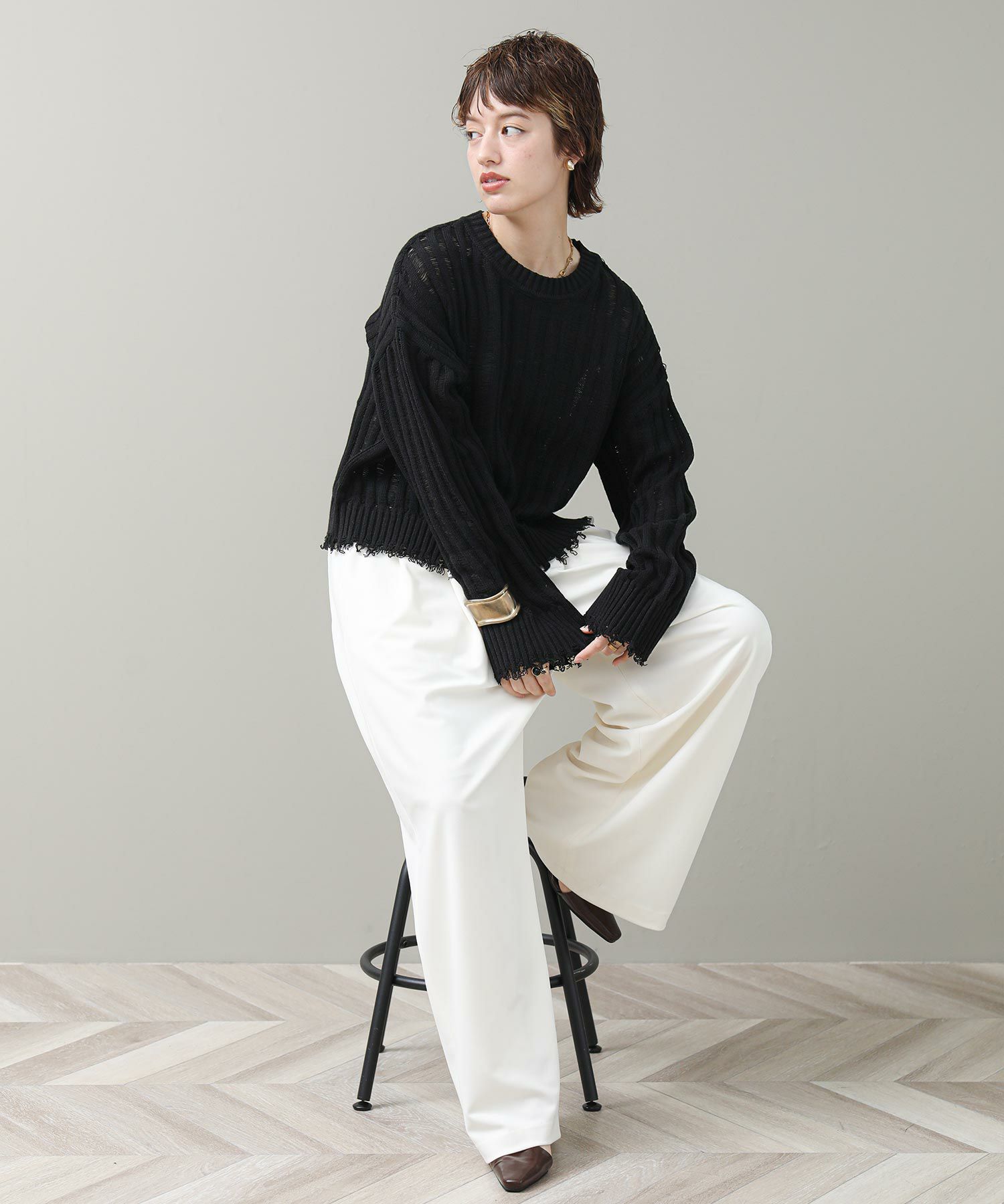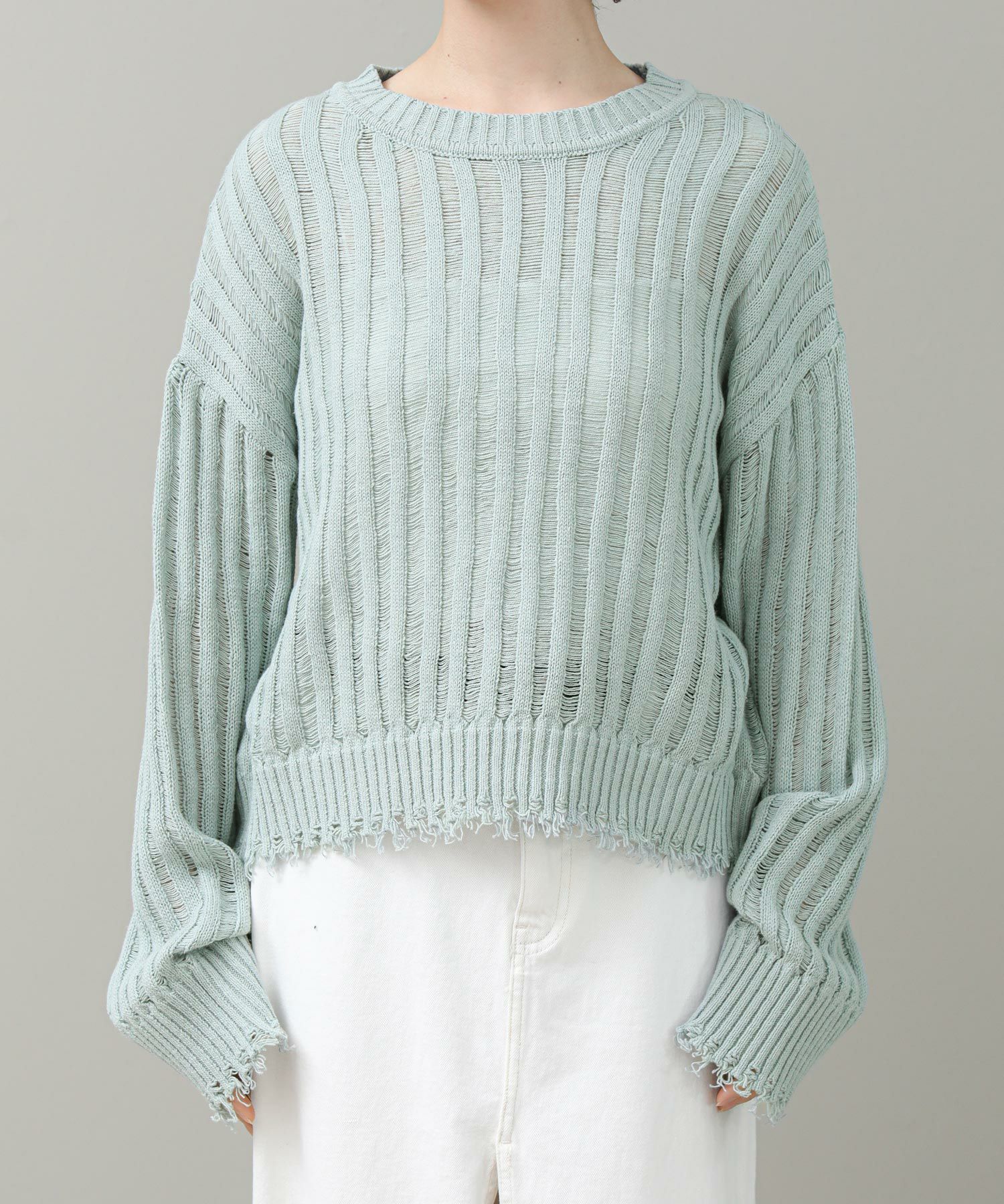 袖や裾のダメージデザインがポイントのプルオーバーニット。