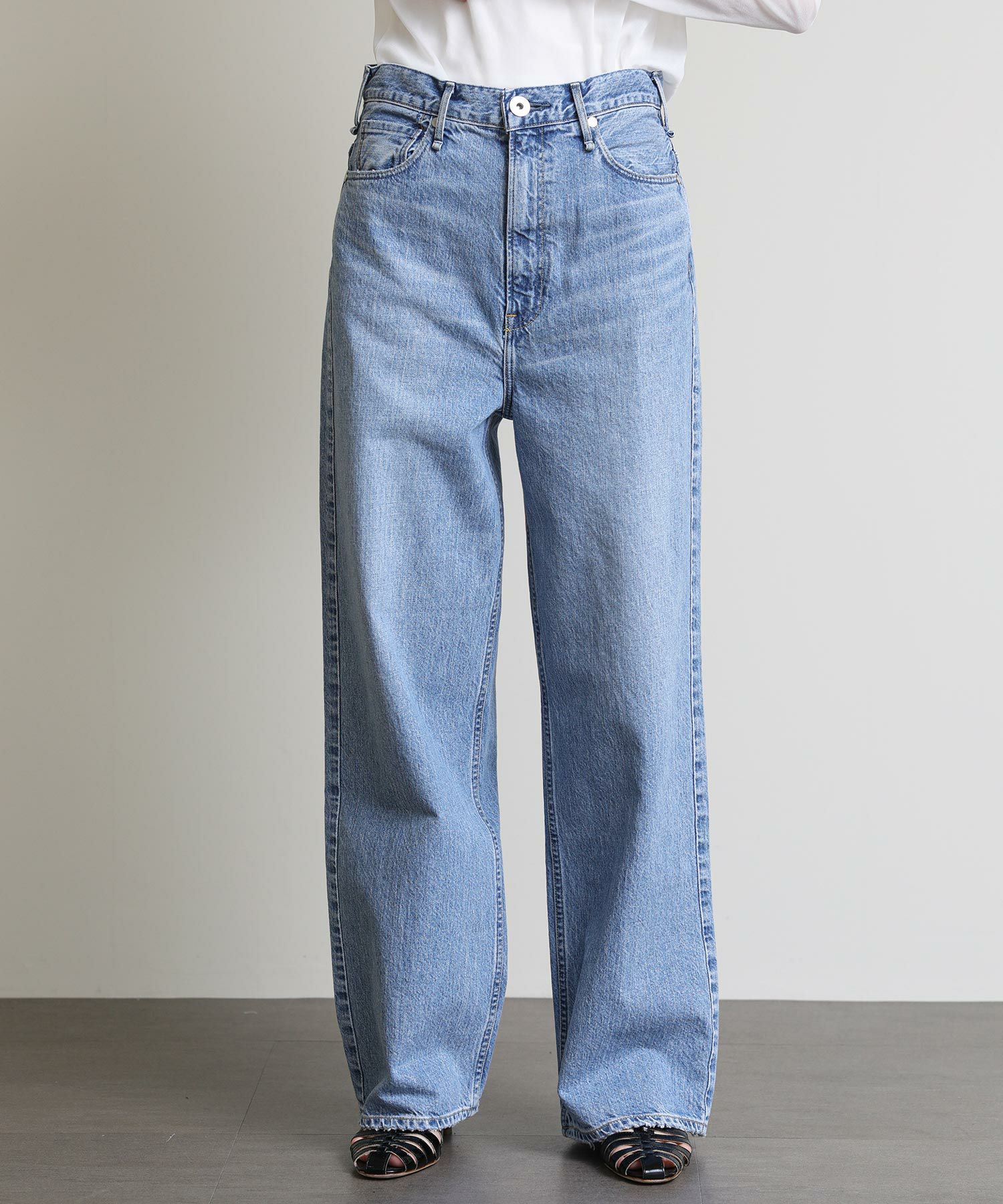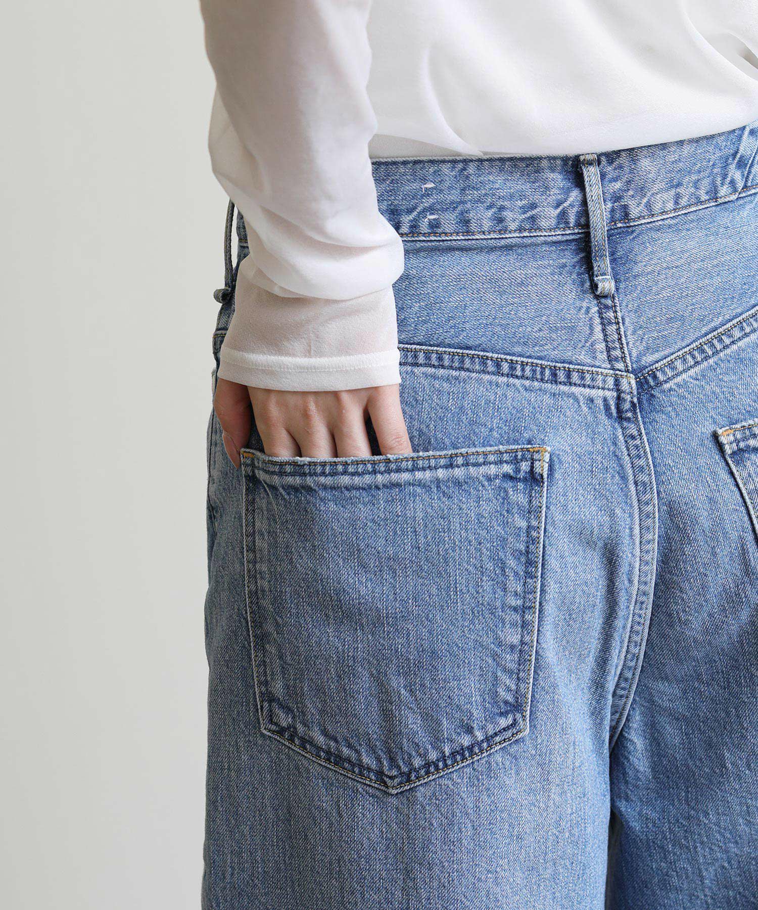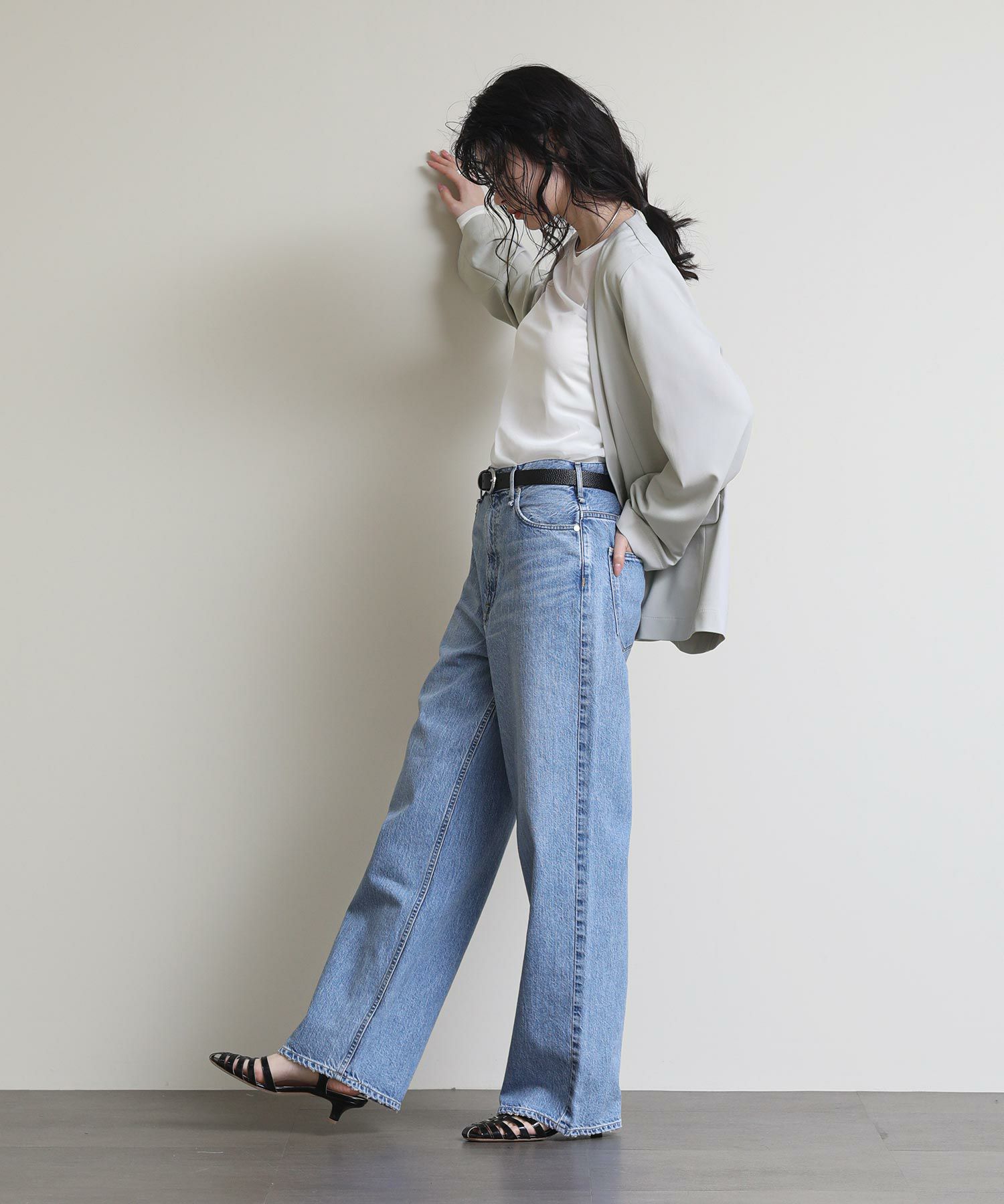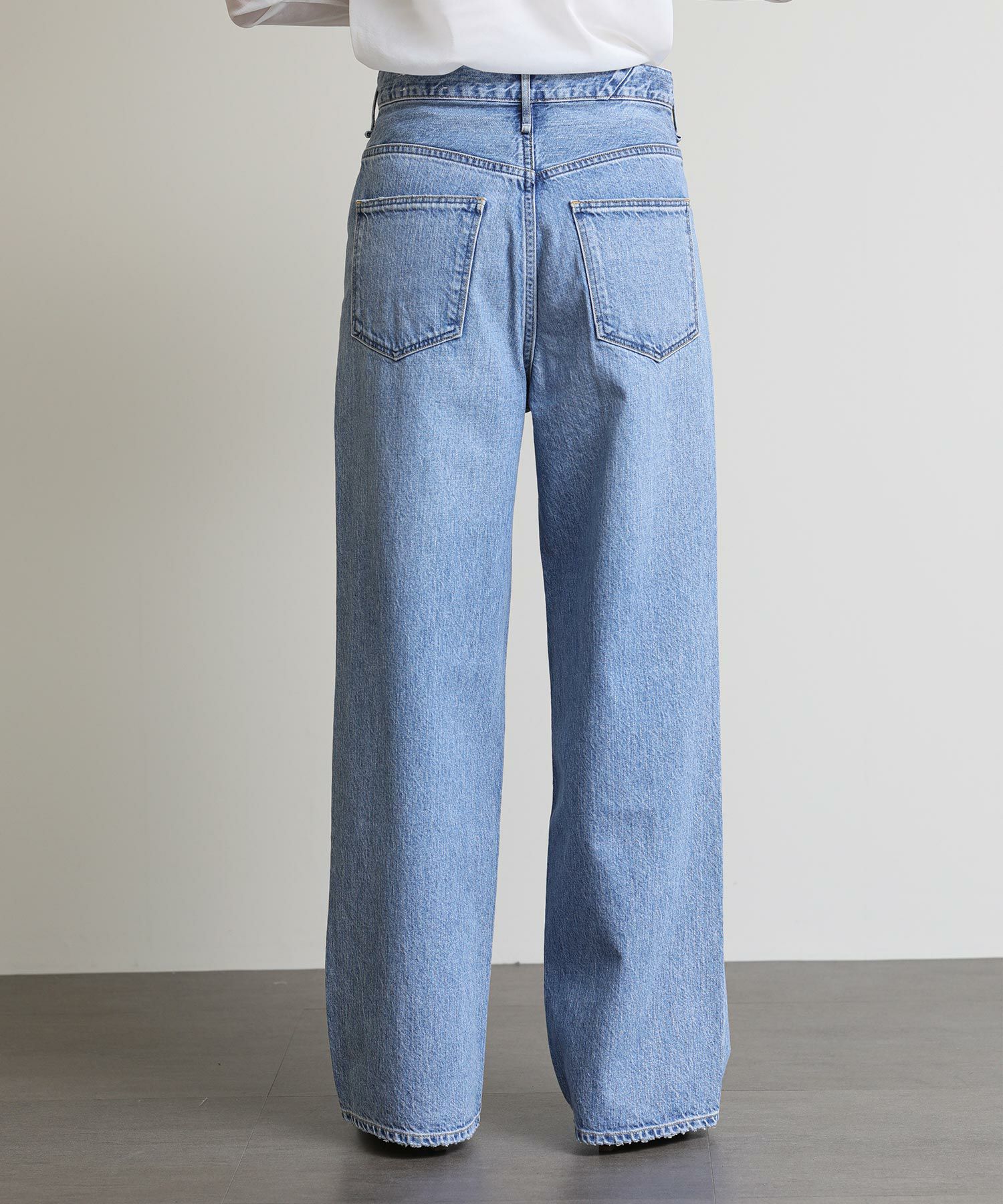 ウエスト周りはすっきりとさせたハイライズ、膝や裾は大きく取ったワイドストレートデニム。腰位置が高く見え、脚長効果抜群の1本。あえて腰履きをし、裾にクッションを持たせルーズに履く履き方もお勧めです。